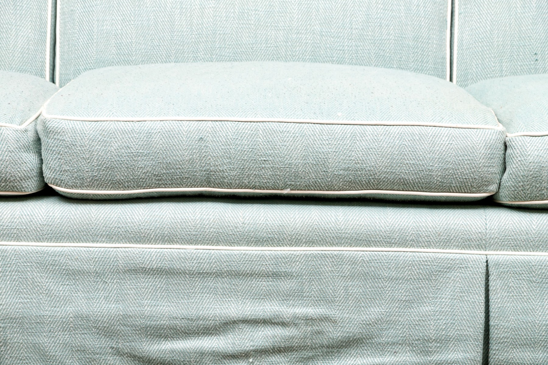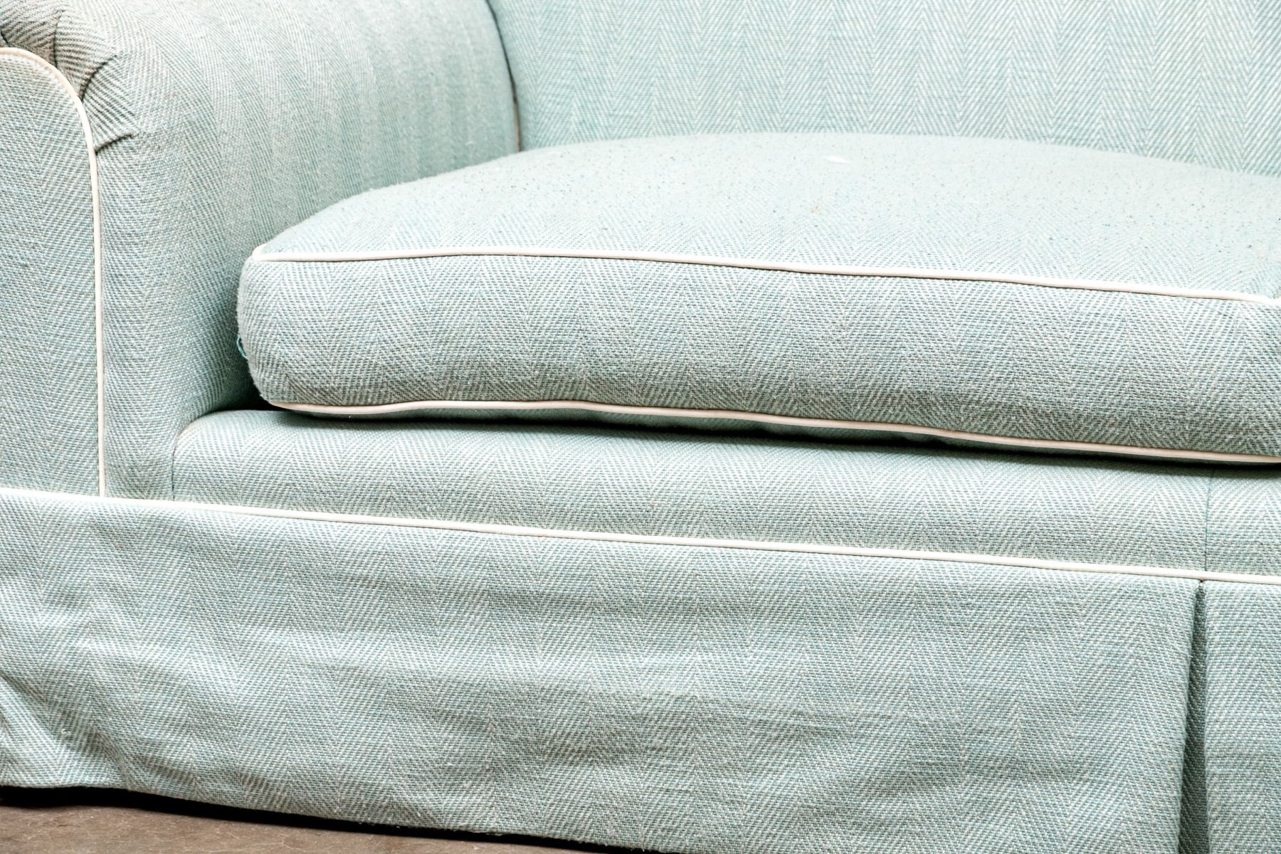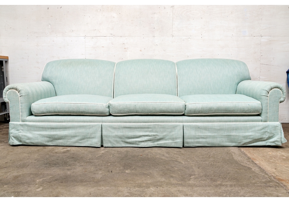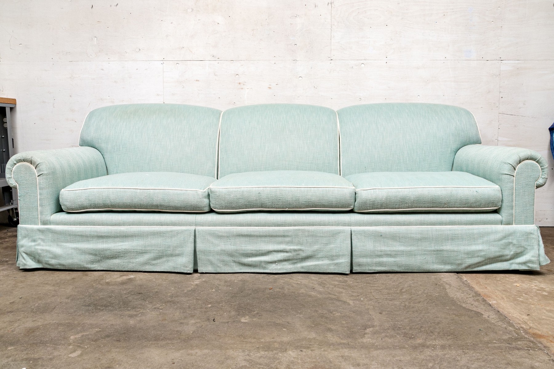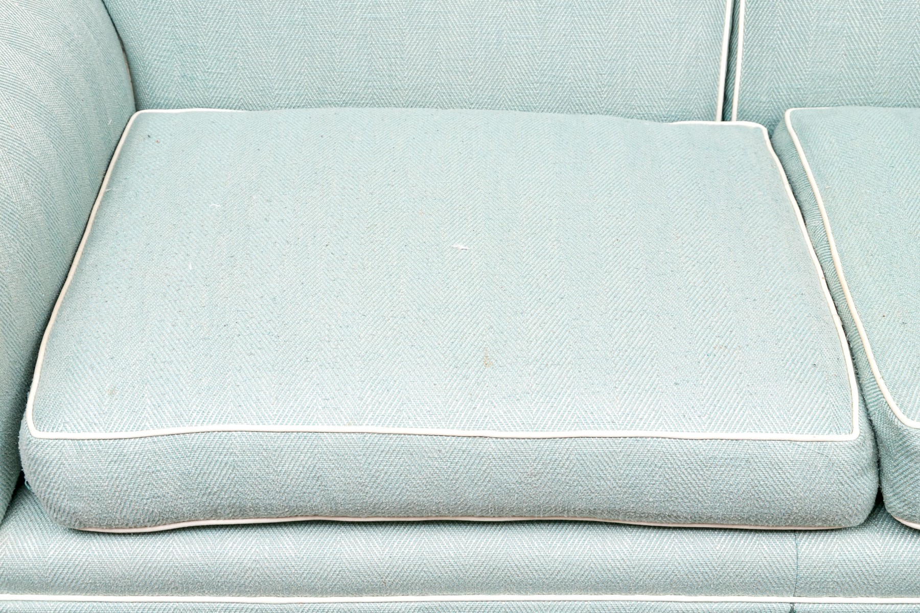 A quality custom upholstered down will sofa, having three cushions each with zippers for easy cleaning.