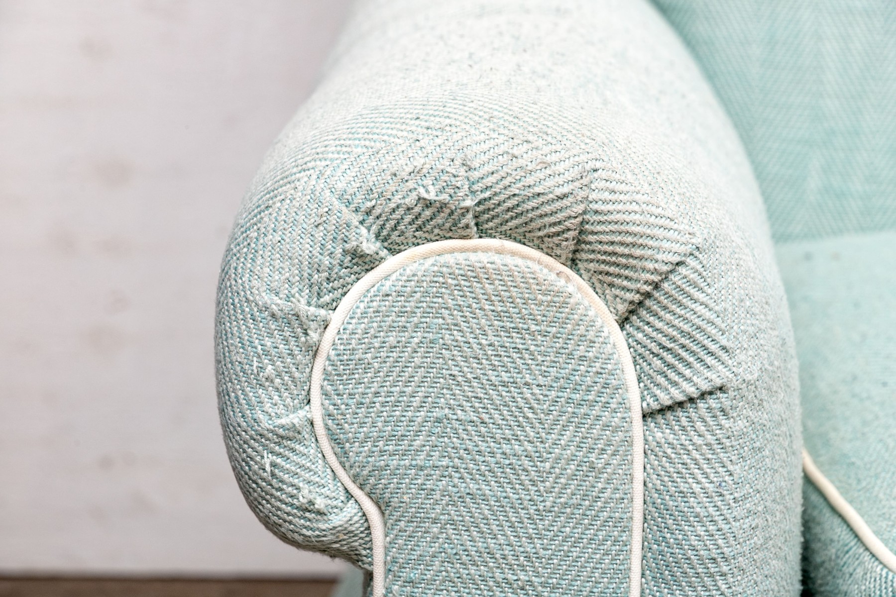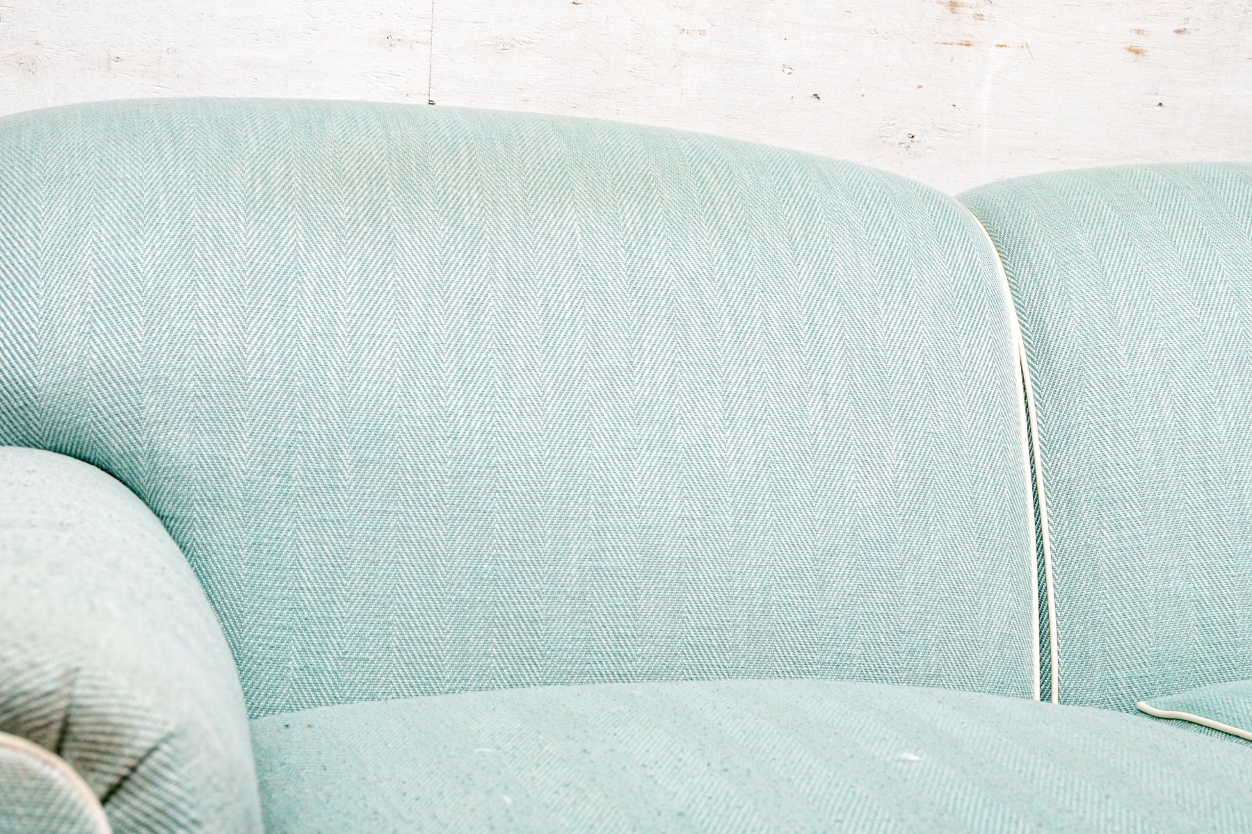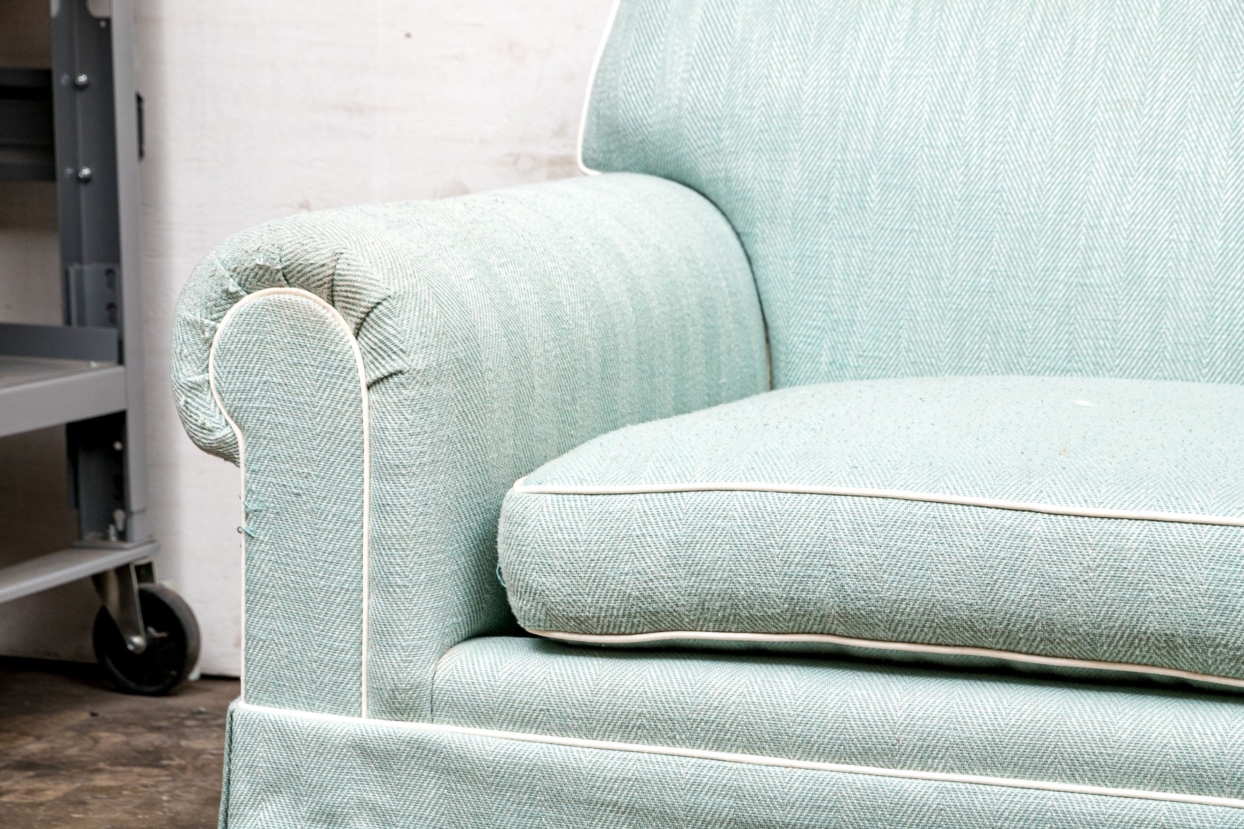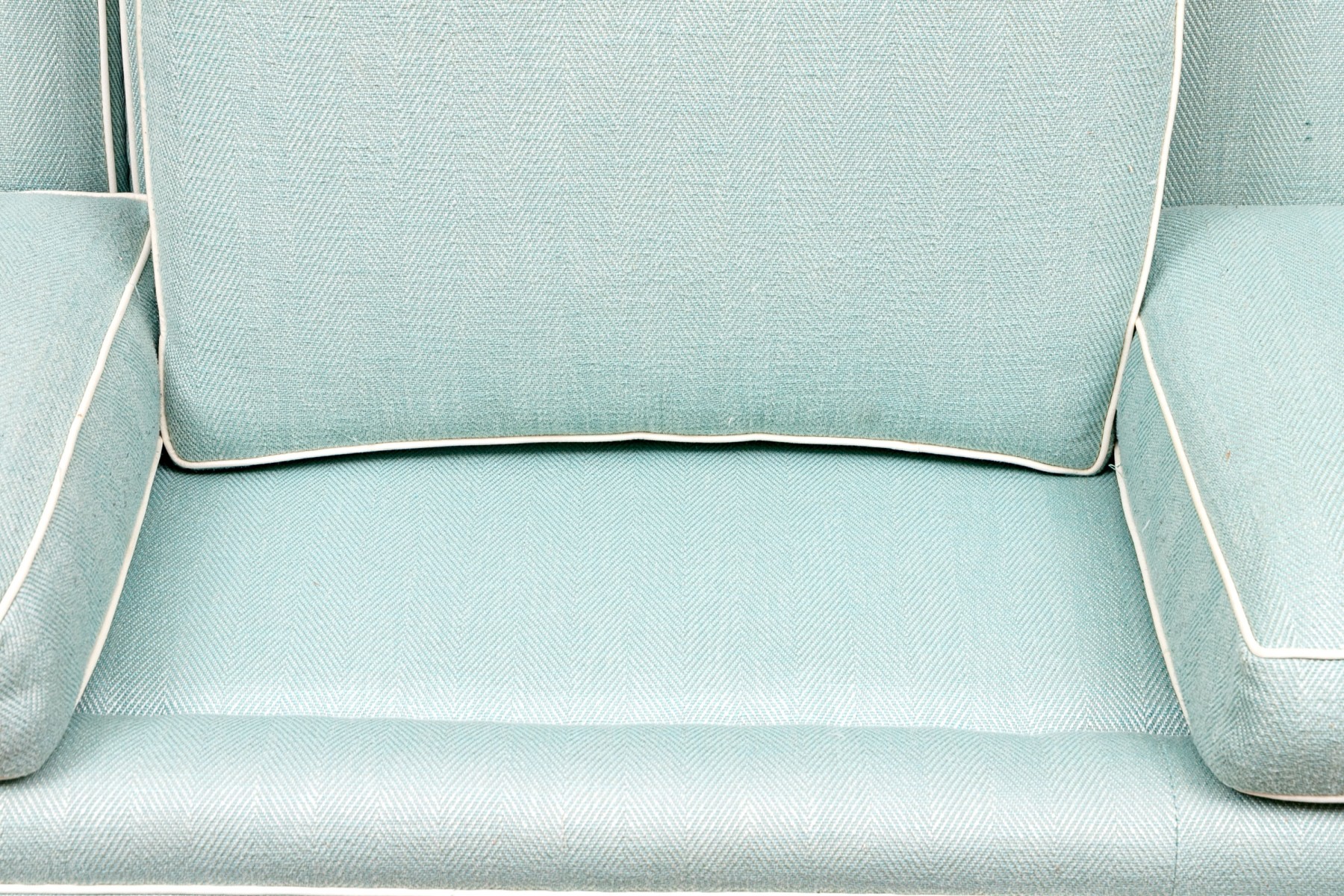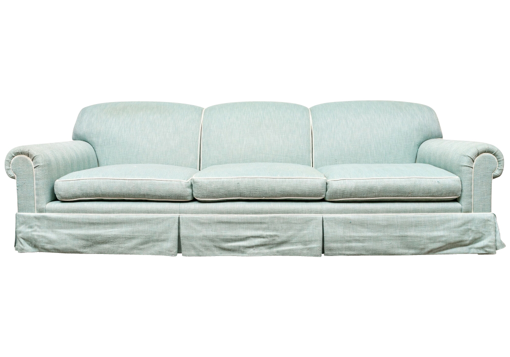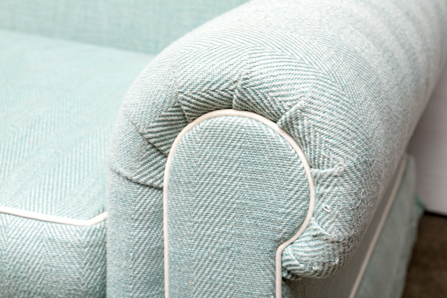A quality custom upholstered down will sofa, having three cushions each with zippers for easy cleaning.