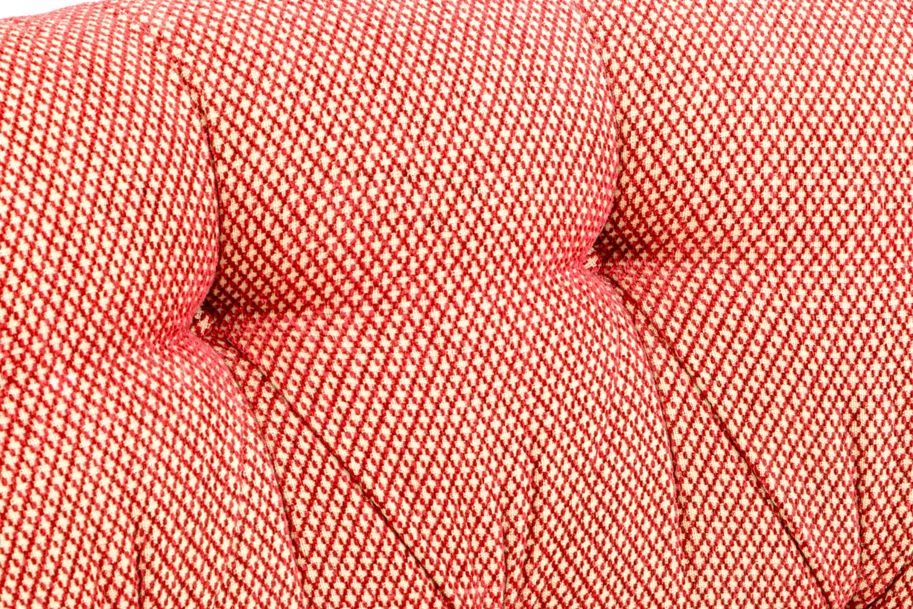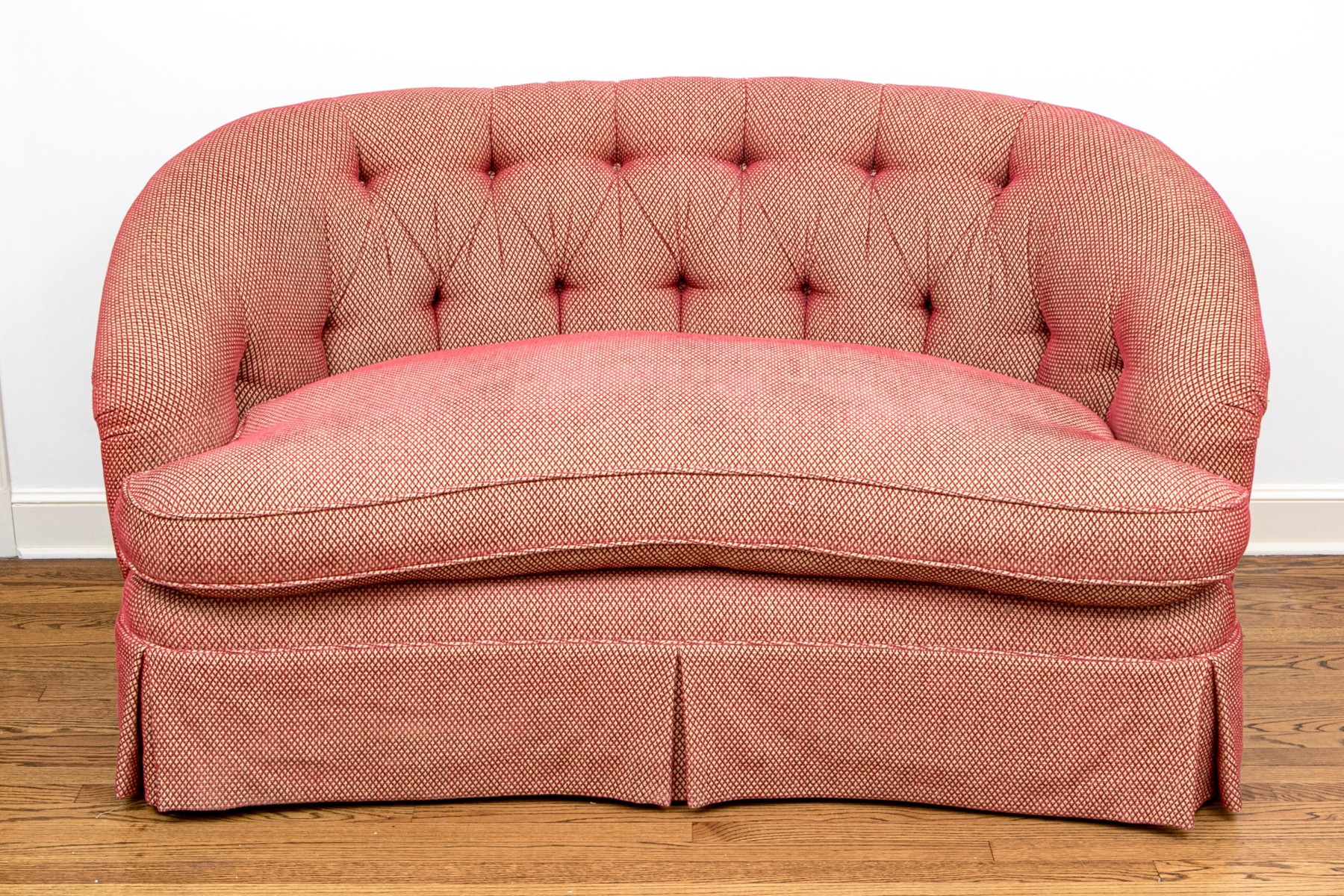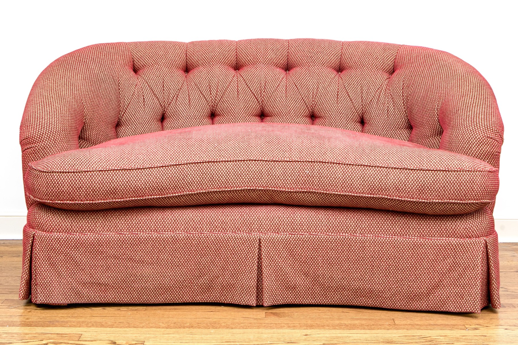 A wonderful loveseat sofa with a classic kidney form, designed with a comfortable button tufted back gently sloping down the arms to a long shaped loose seat cushion. Finished with a skirt concealing the legs beneath, custom upholstered throughout in a striking textured red and cream lattice pattern.