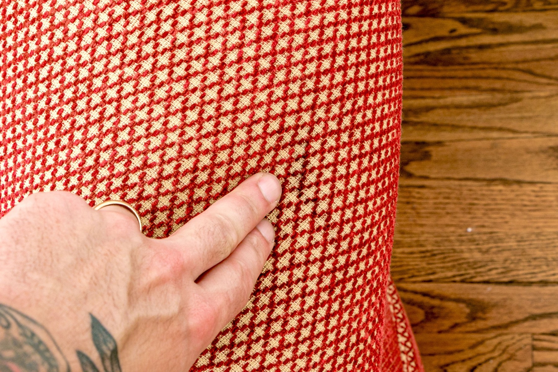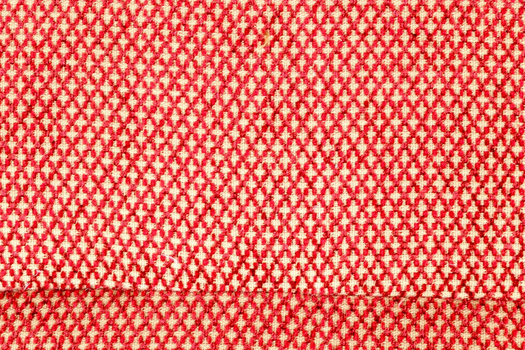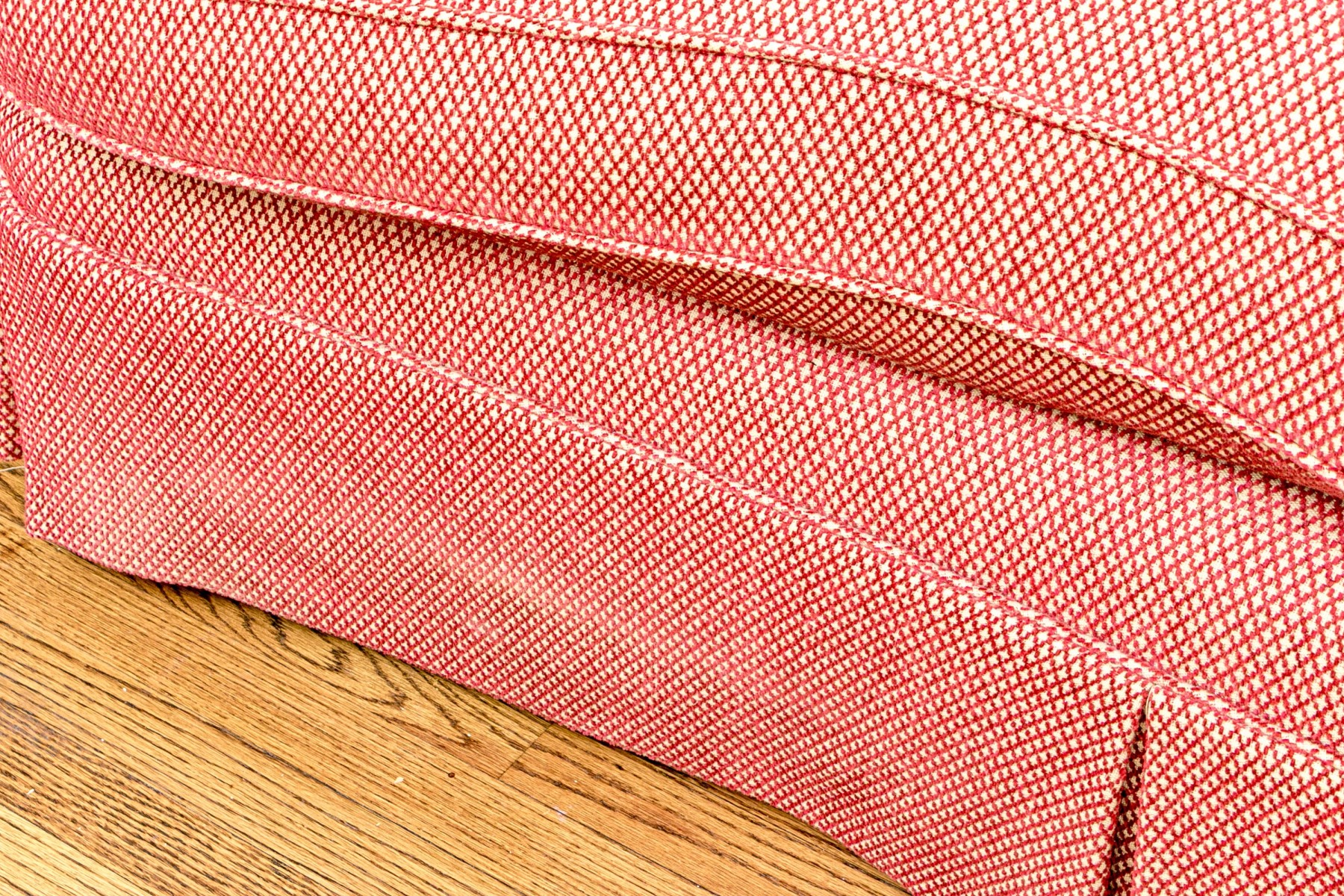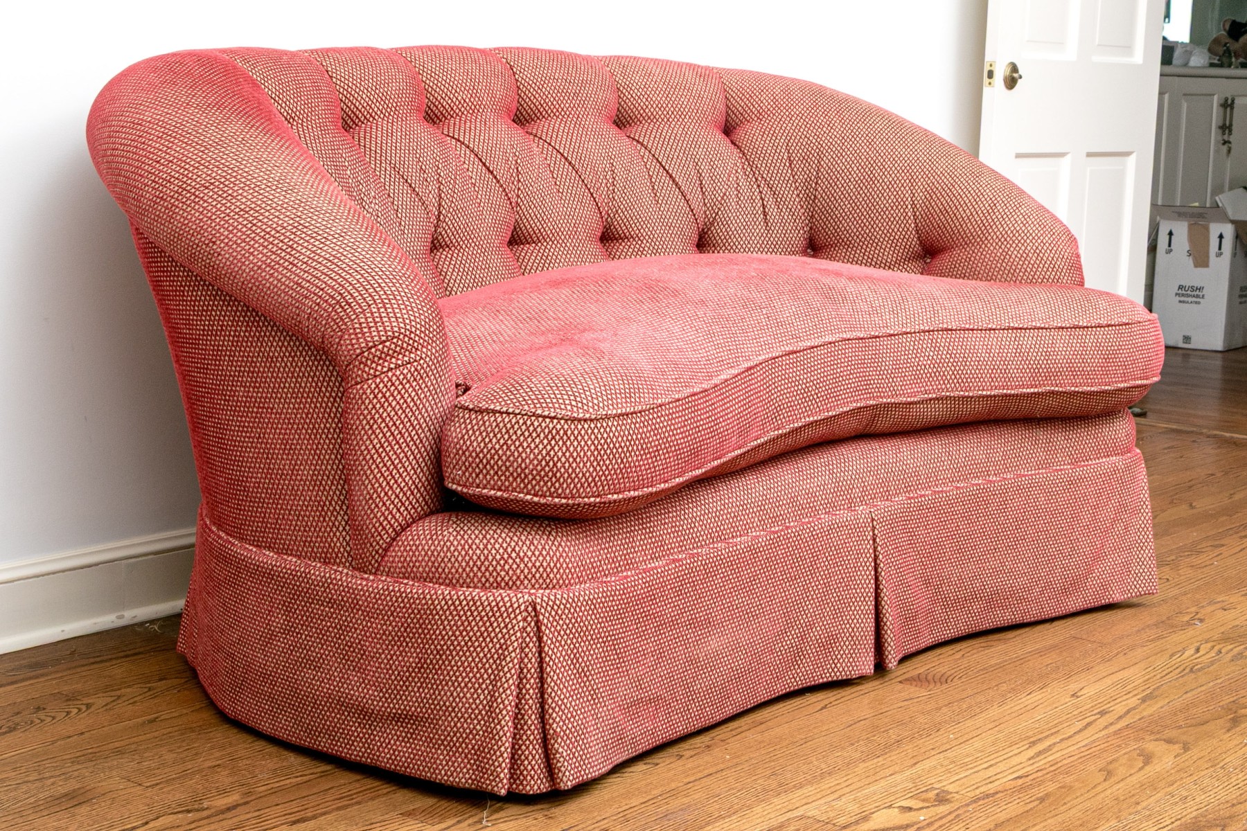 A wonderful loveseat sofa with a classic kidney form, designed with a comfortable button tufted back gently sloping down the arms to a long shaped loose seat cushion. Finished with a skirt concealing the legs beneath, custom upholstered throughout in a striking textured red and cream lattice pattern.