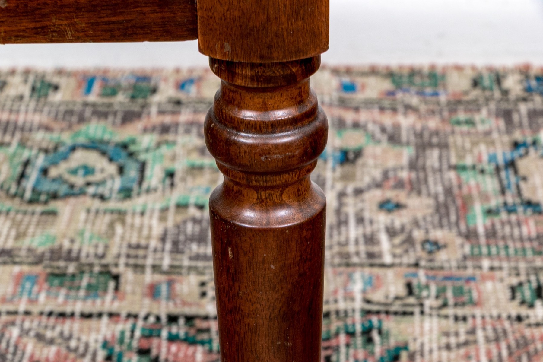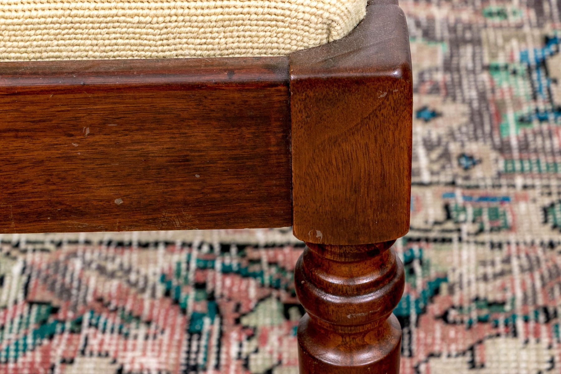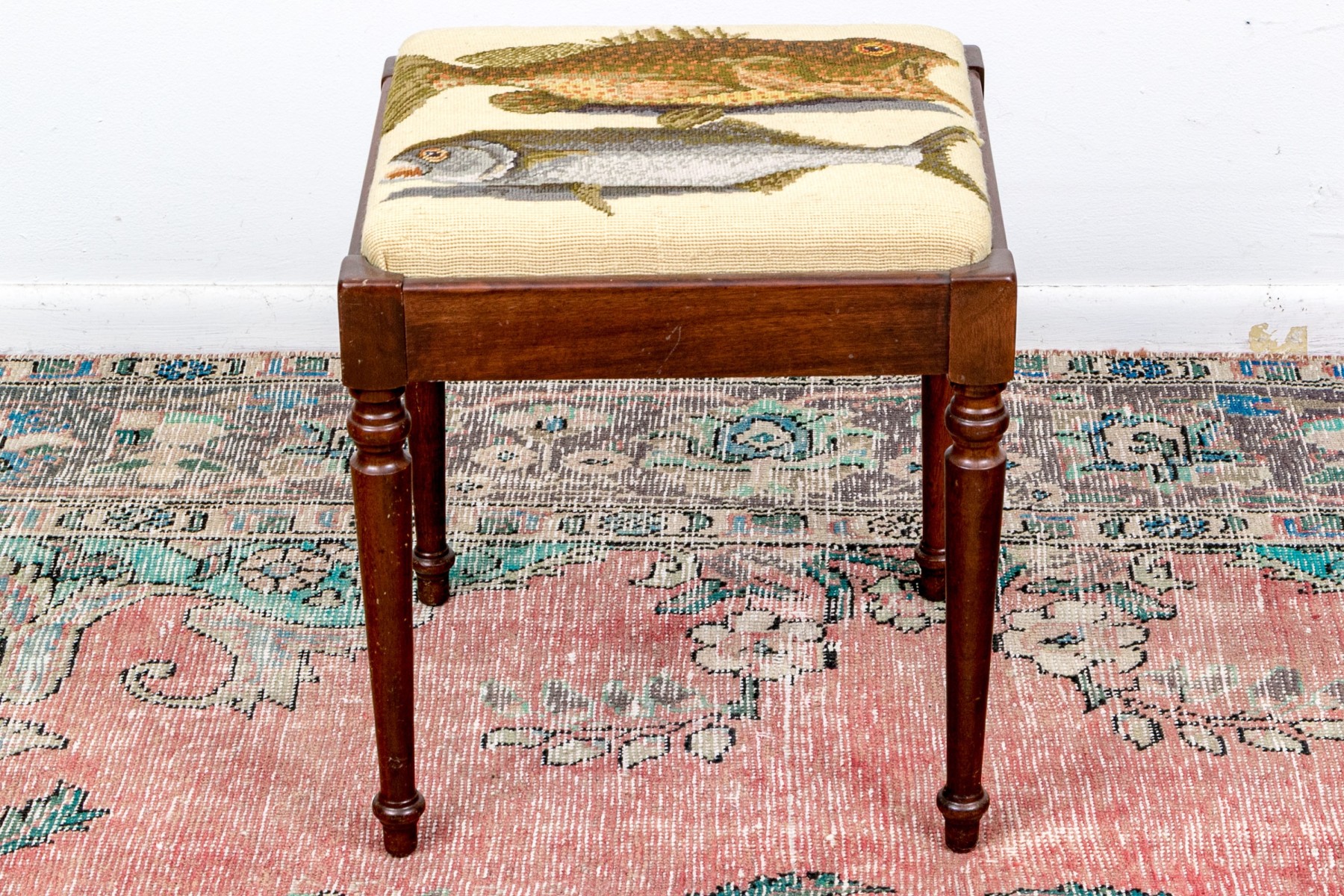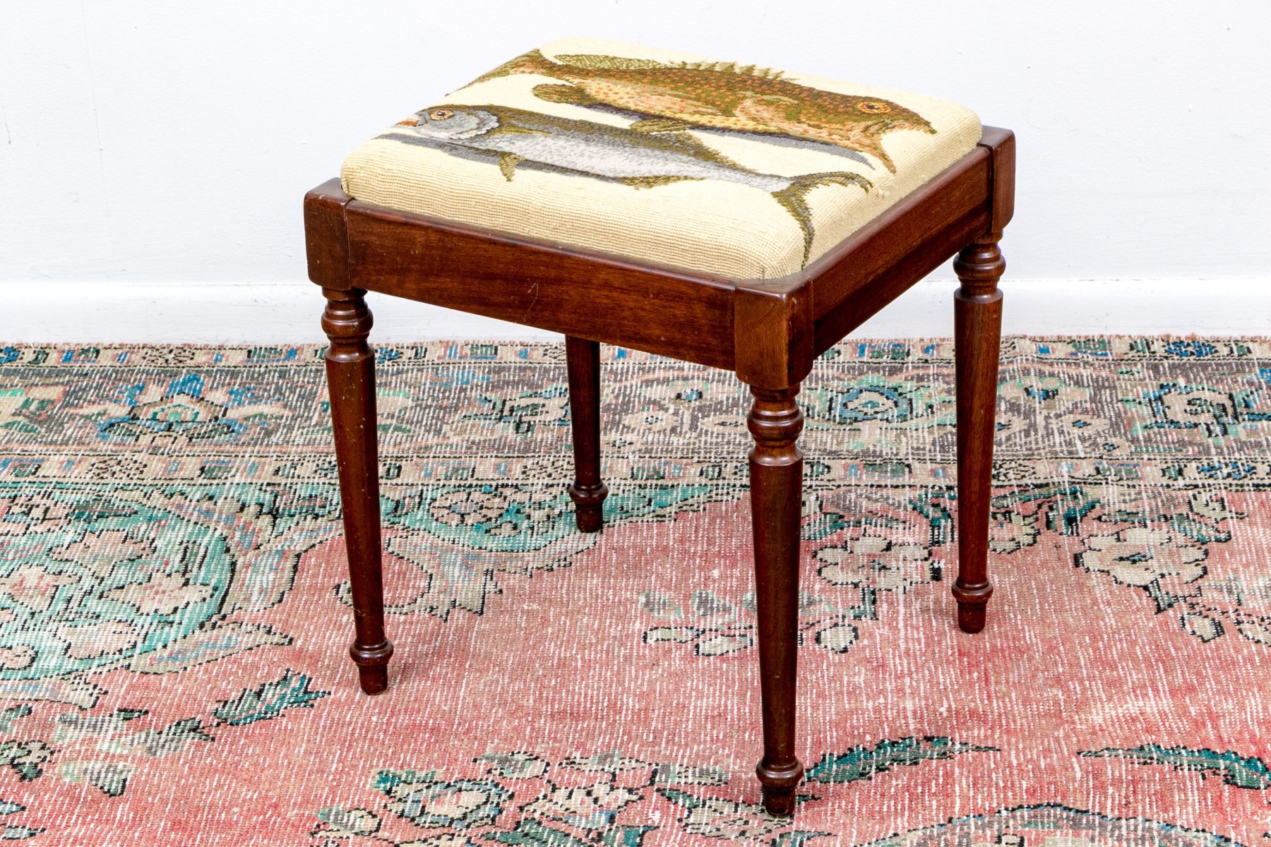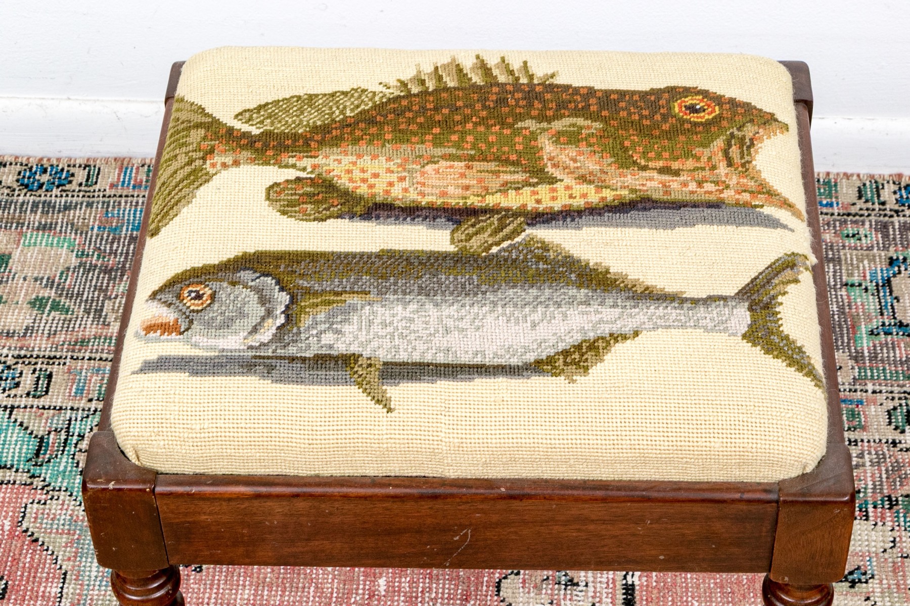 A charming stool or ottoman featuring a square needlepoint cushion designed with two opposing fish in green, orange, and gray against an ecru ground. Supported by a warm-toned medium brown frame with a straight apron and nicely carved, tapered legs.