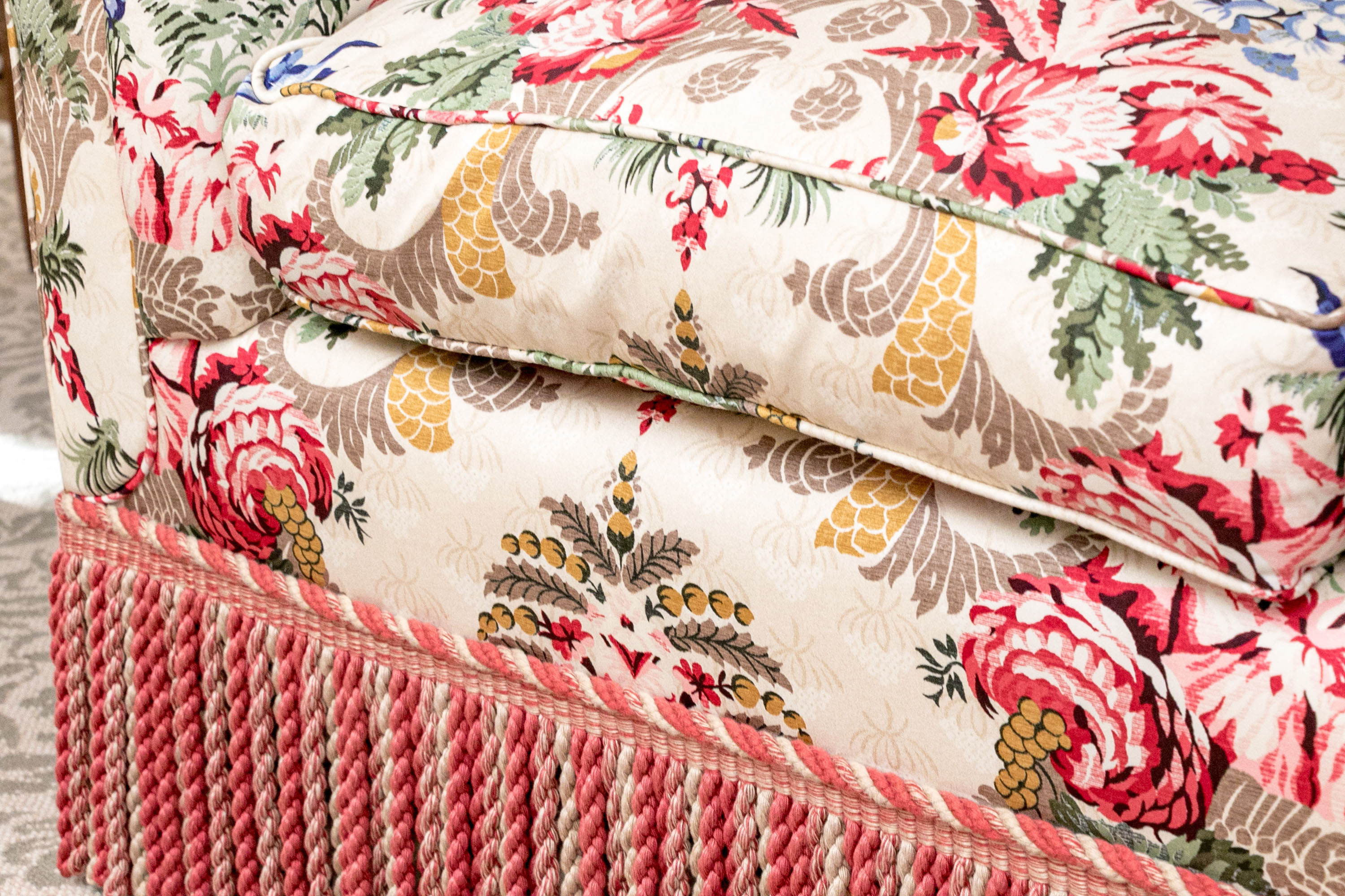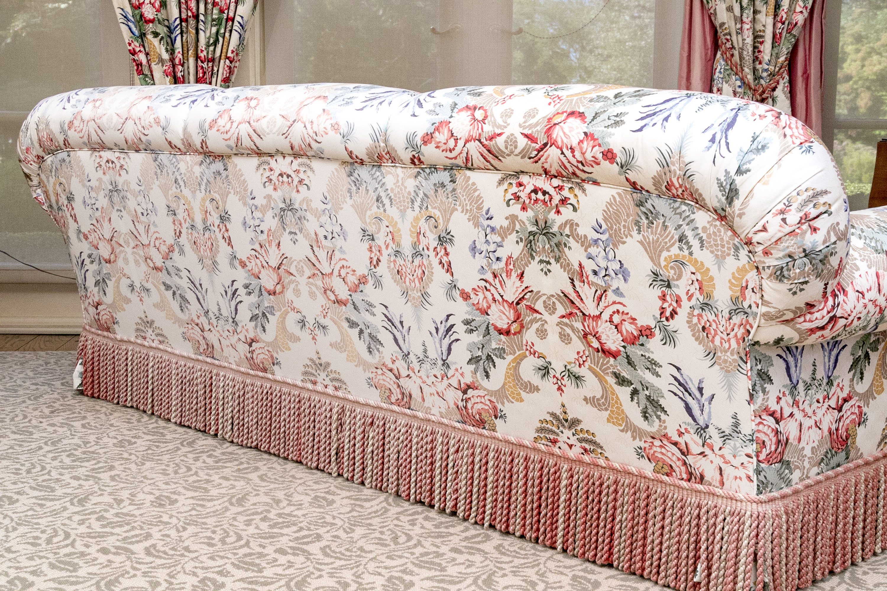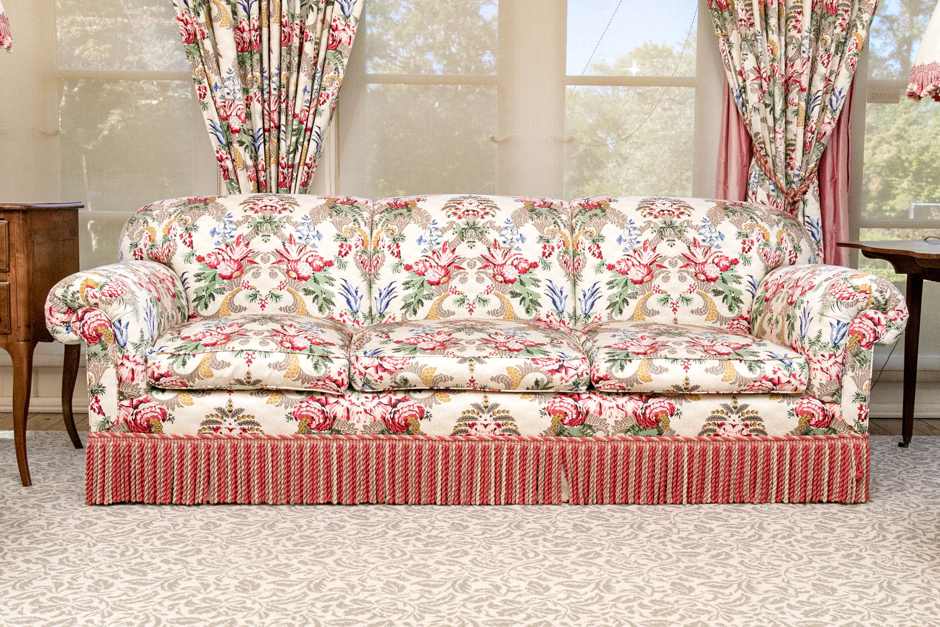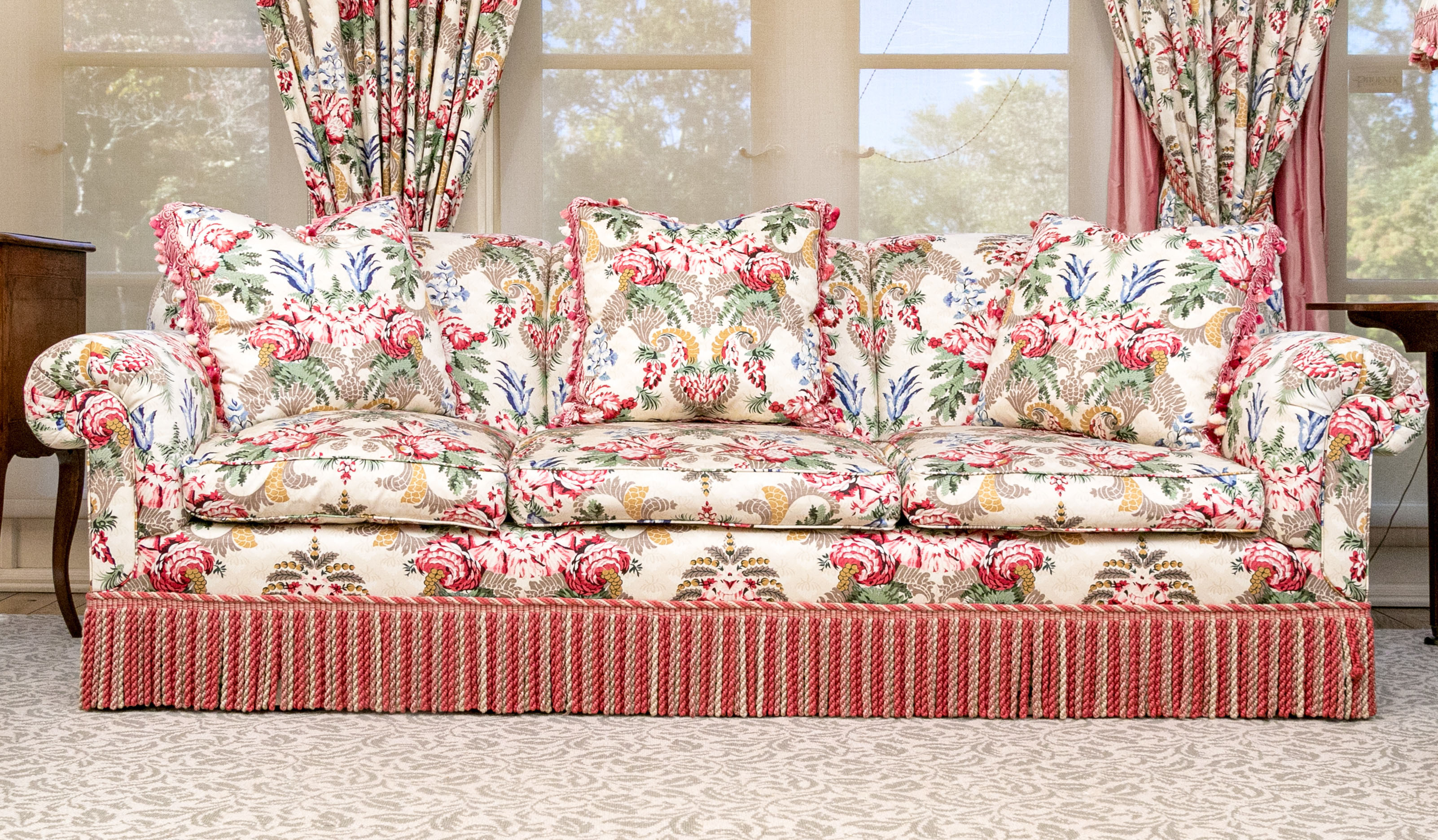 A distinguished three-seater sofa boasting a long back, rolled arms, and loose seat cushion. Accompanied by three large accent pillow in matching cream upholstery decorated with bold and elegant designs of symmetrical foliage in yellow, taupe, red, and blue. The pillows are finished with red tassel fringes, complimenting a red and taupe bullion fringe skirt on the sofa.