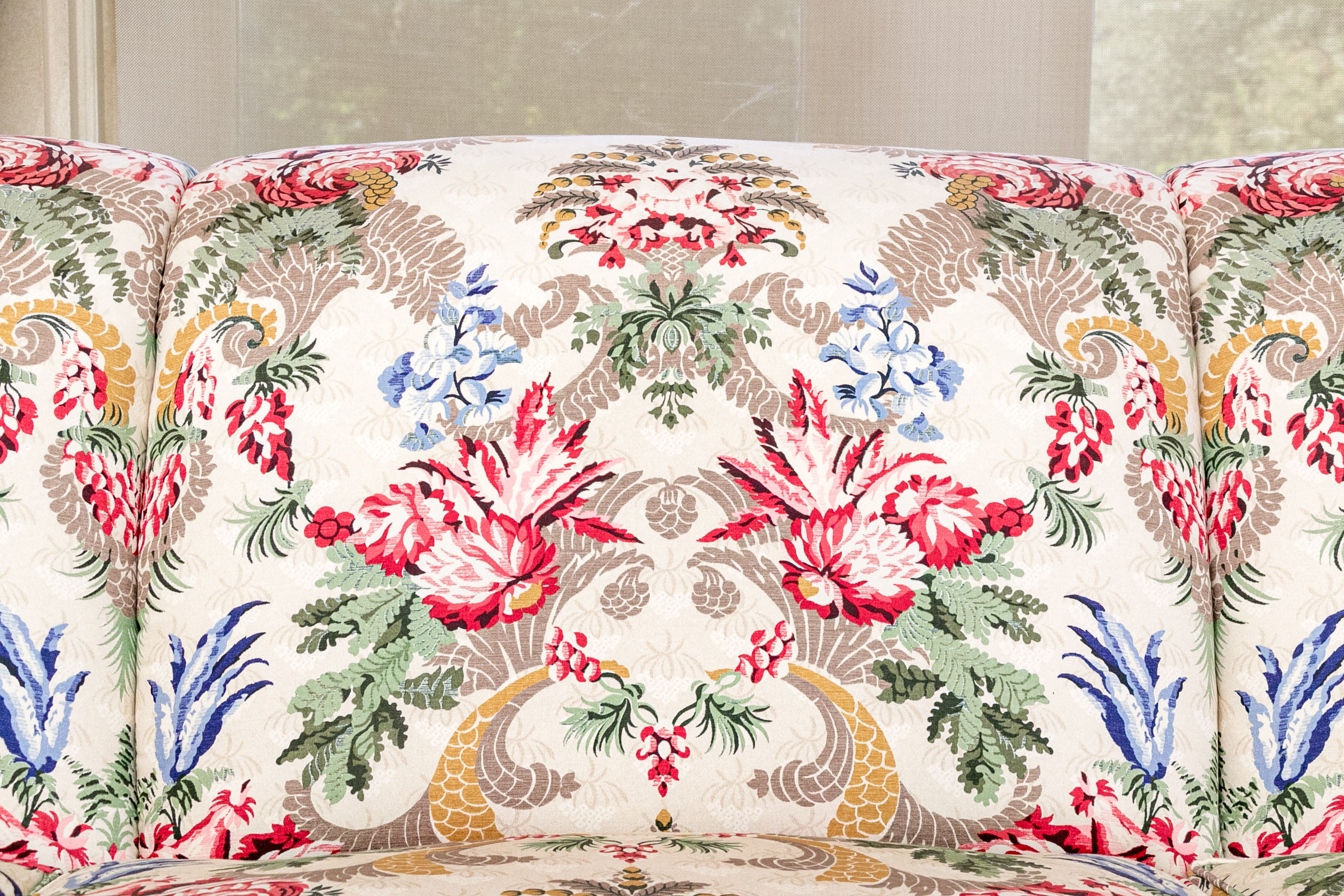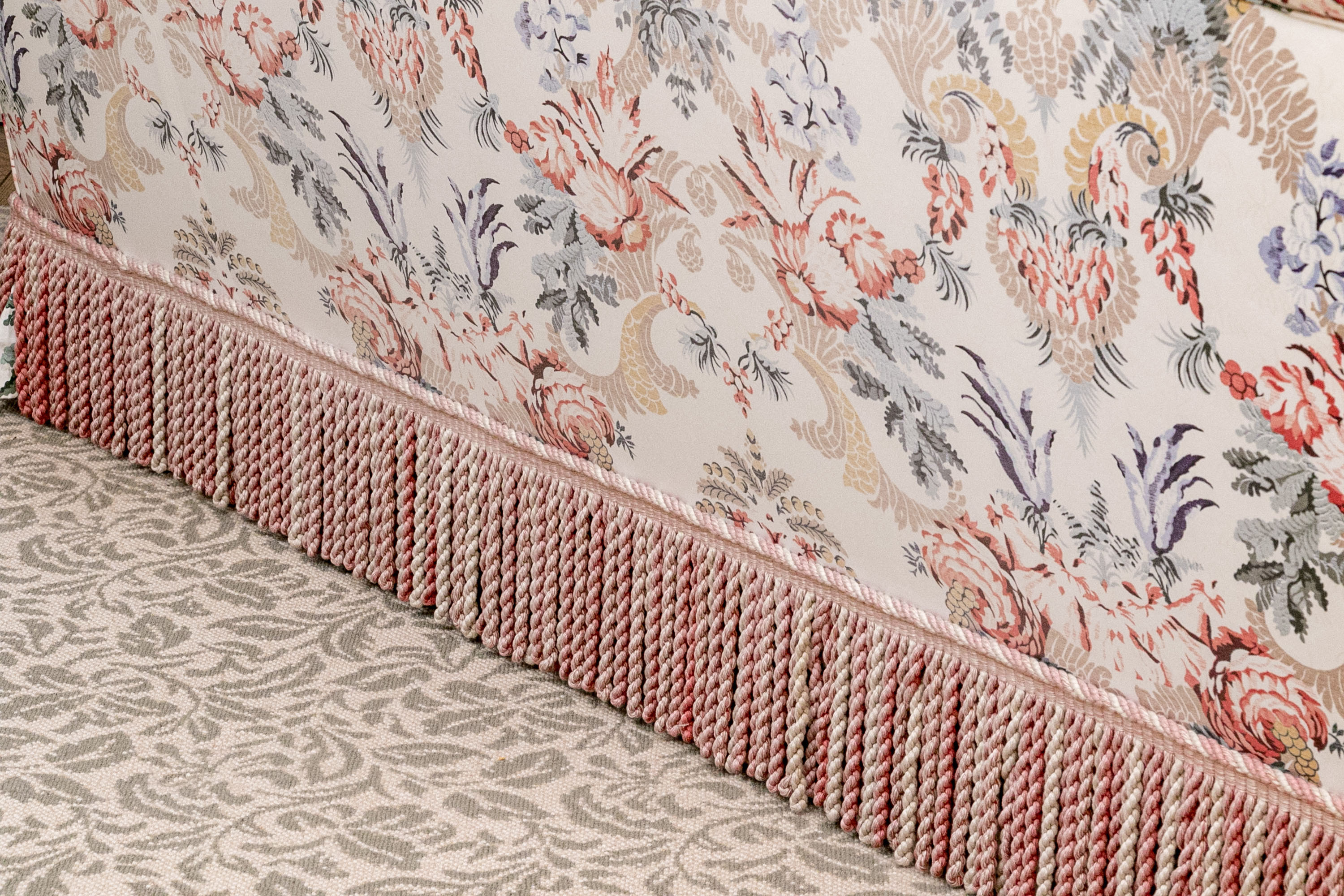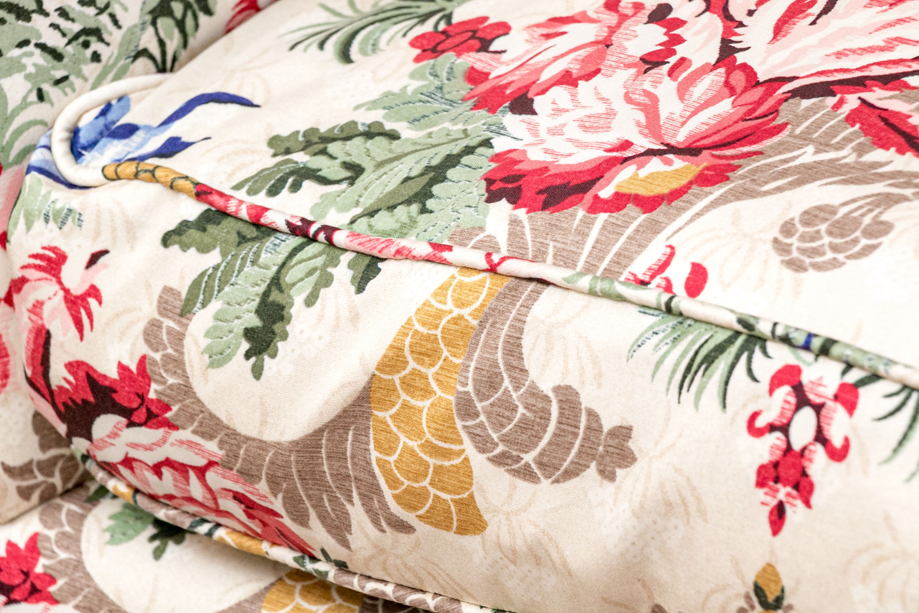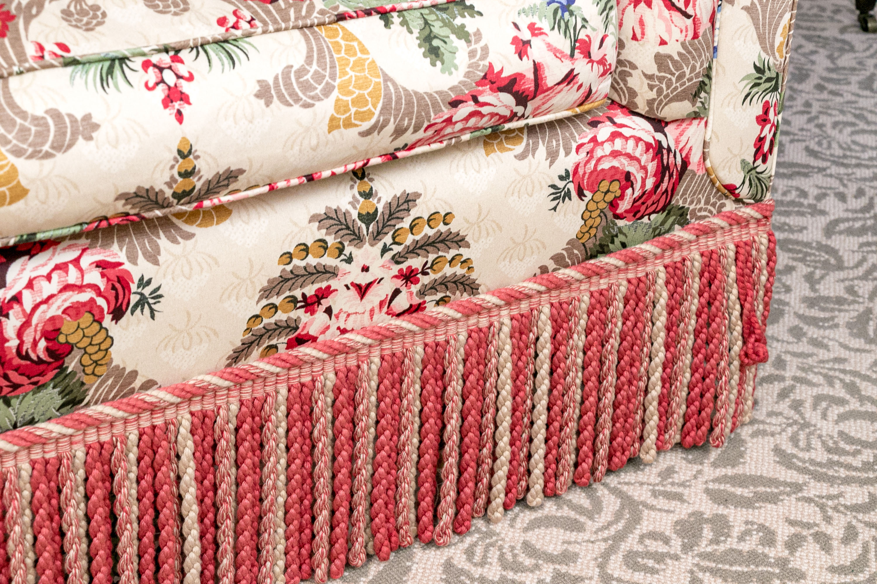 A distinguished three-seater sofa boasting a long back, rolled arms, and loose seat cushion. Accompanied by three large accent pillow in matching cream upholstery decorated with bold and elegant designs of symmetrical foliage in yellow, taupe, red, and blue. The pillows are finished with red tassel fringes, complimenting a red and taupe bullion fringe skirt on the sofa.