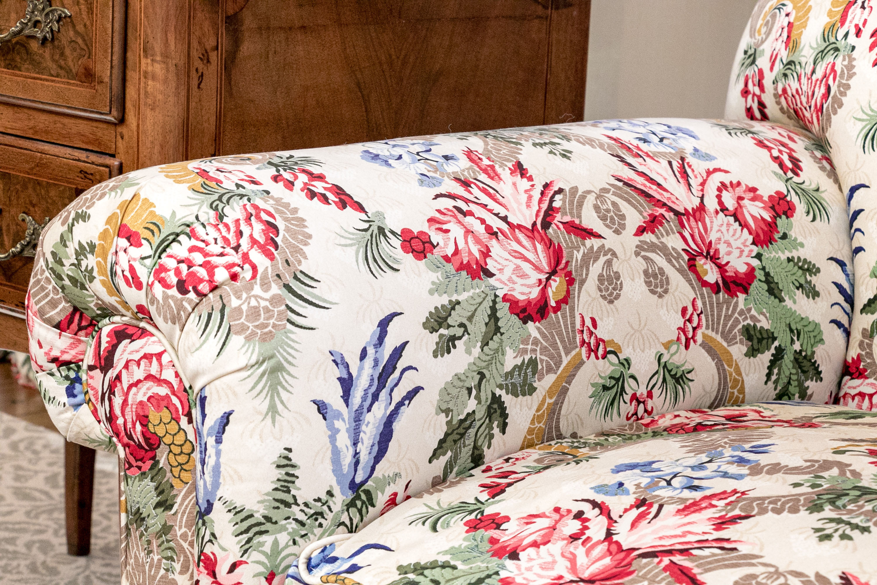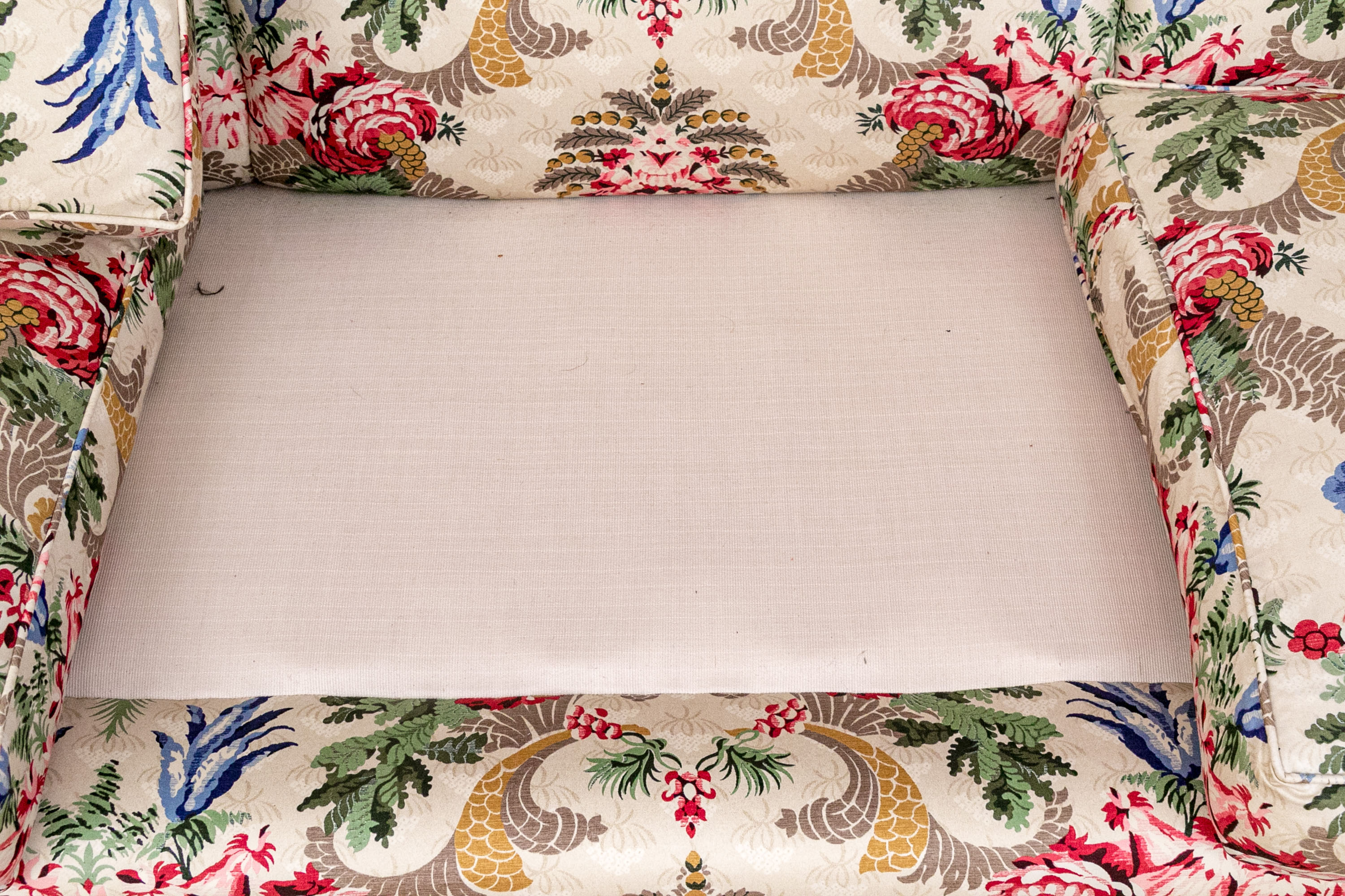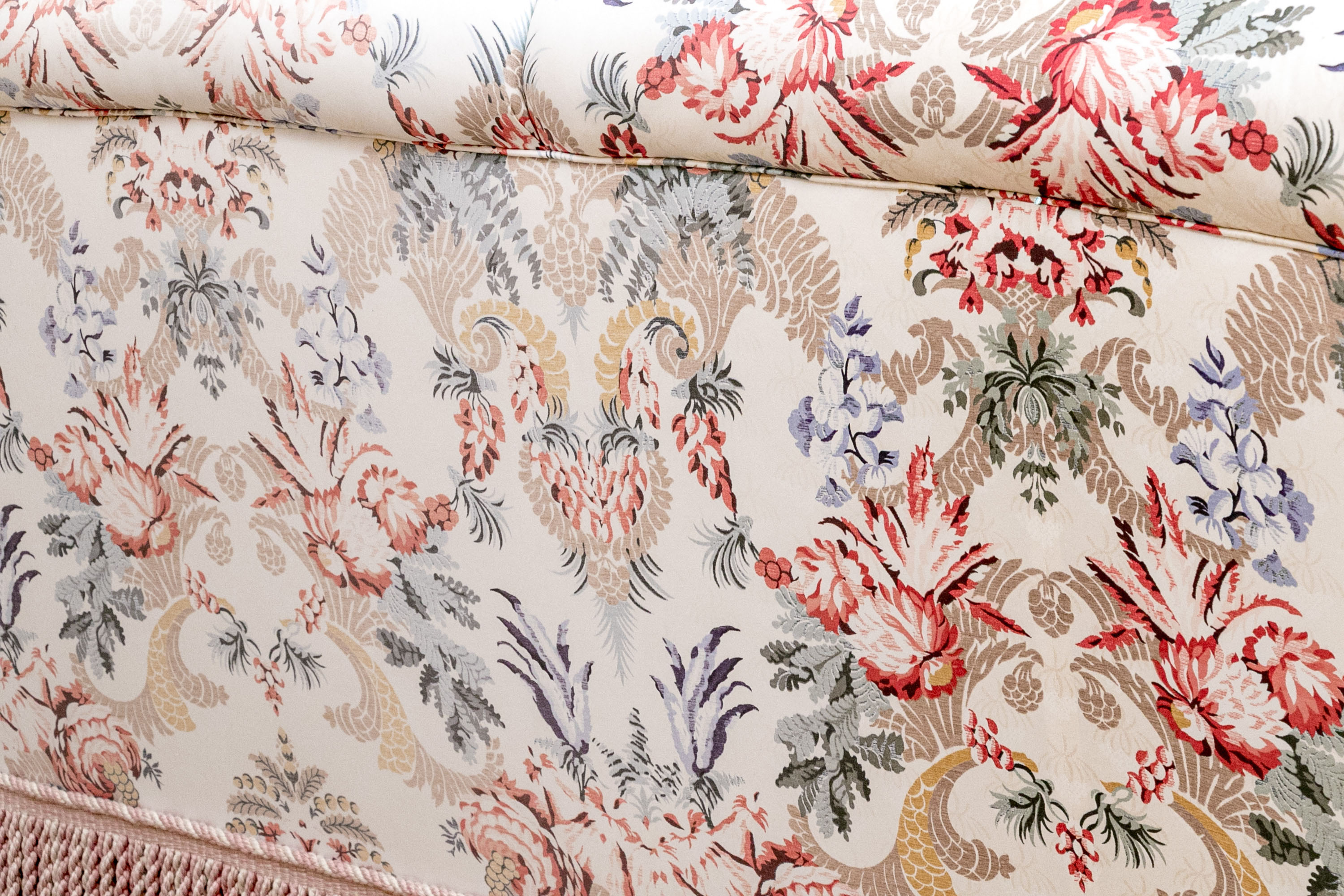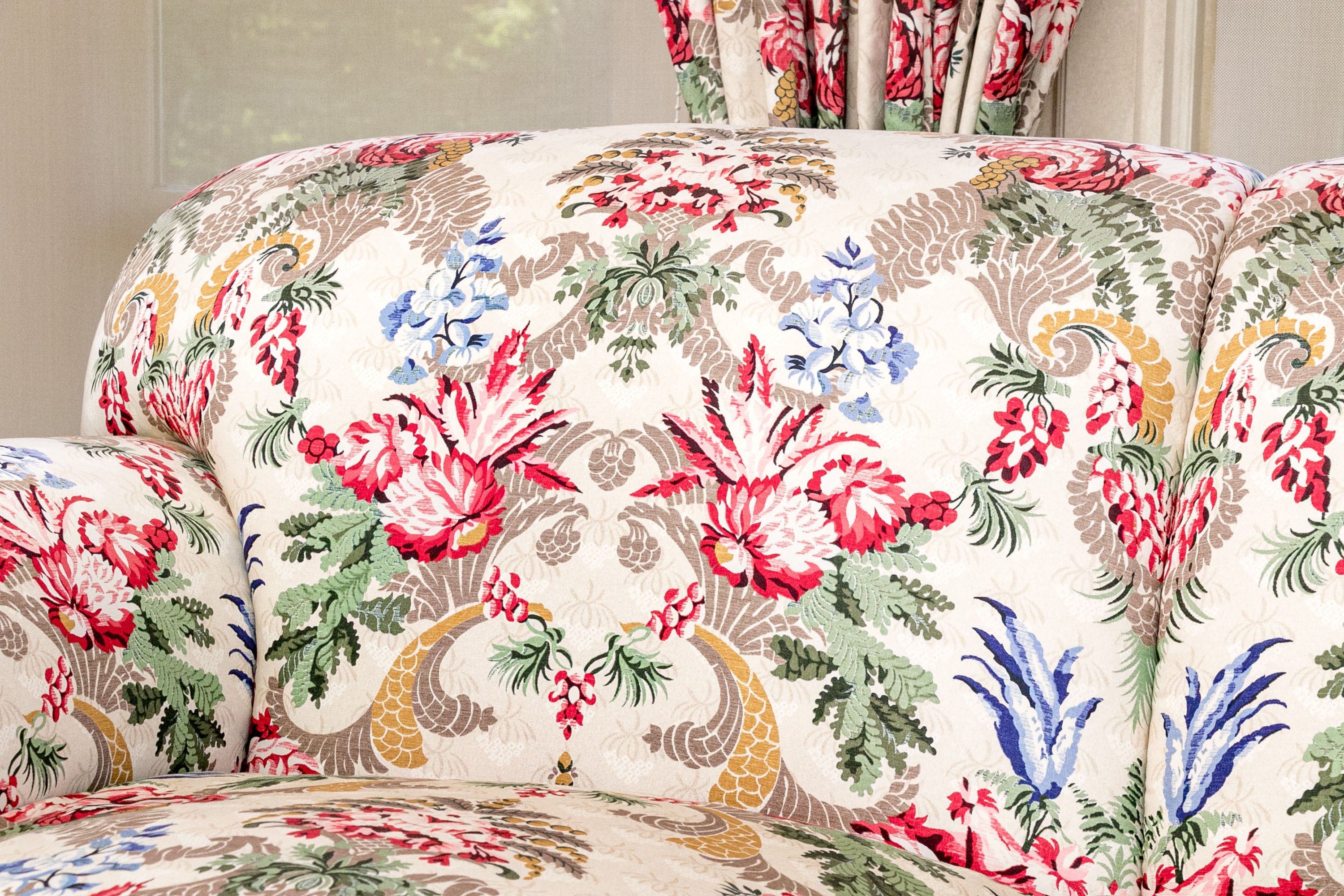 A distinguished three-seater sofa boasting a long back, rolled arms, and loose seat cushion. Accompanied by three large accent pillow in matching cream upholstery decorated with bold and elegant designs of symmetrical foliage in yellow, taupe, red, and blue. The pillows are finished with red tassel fringes, complimenting a red and taupe bullion fringe skirt on the sofa.