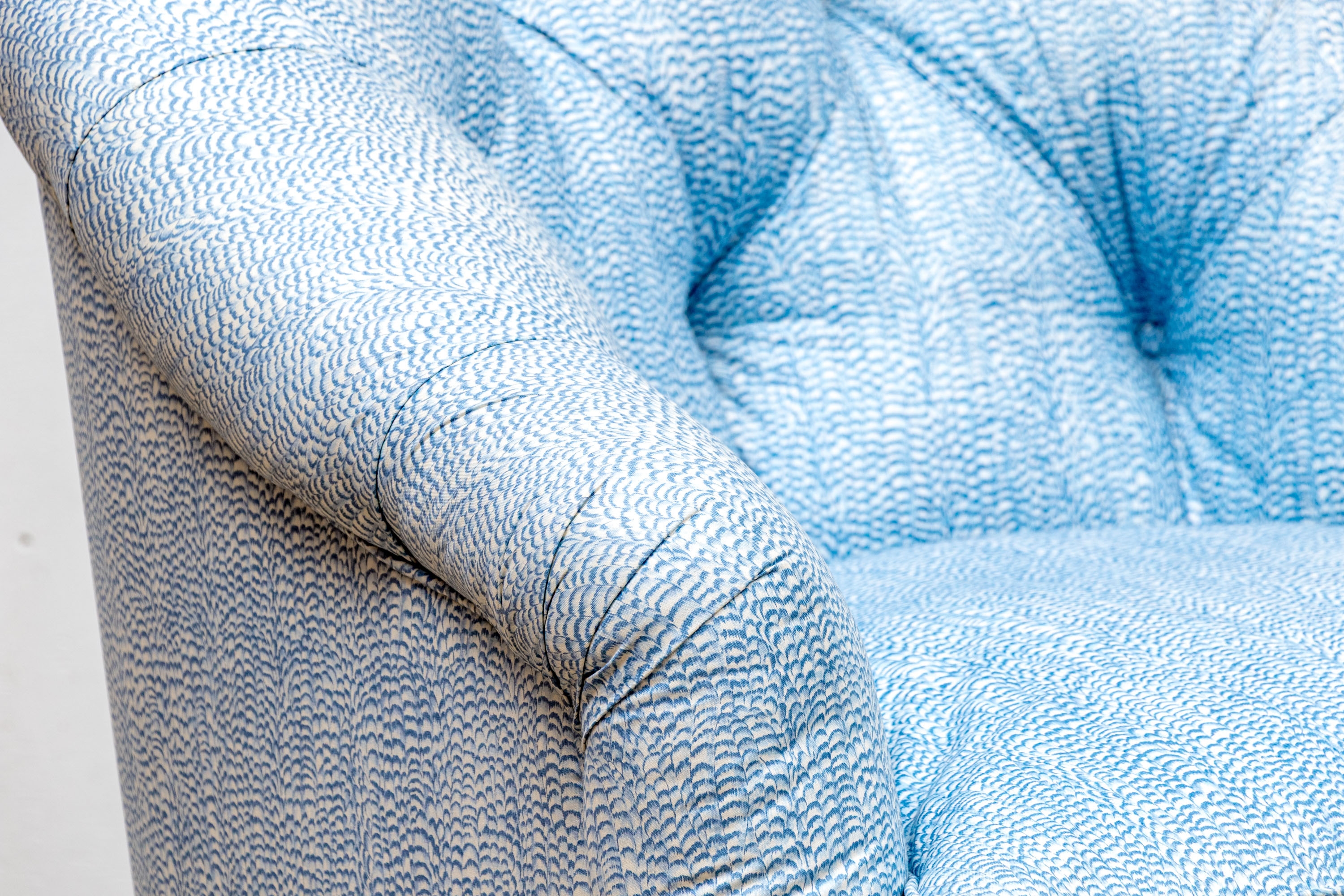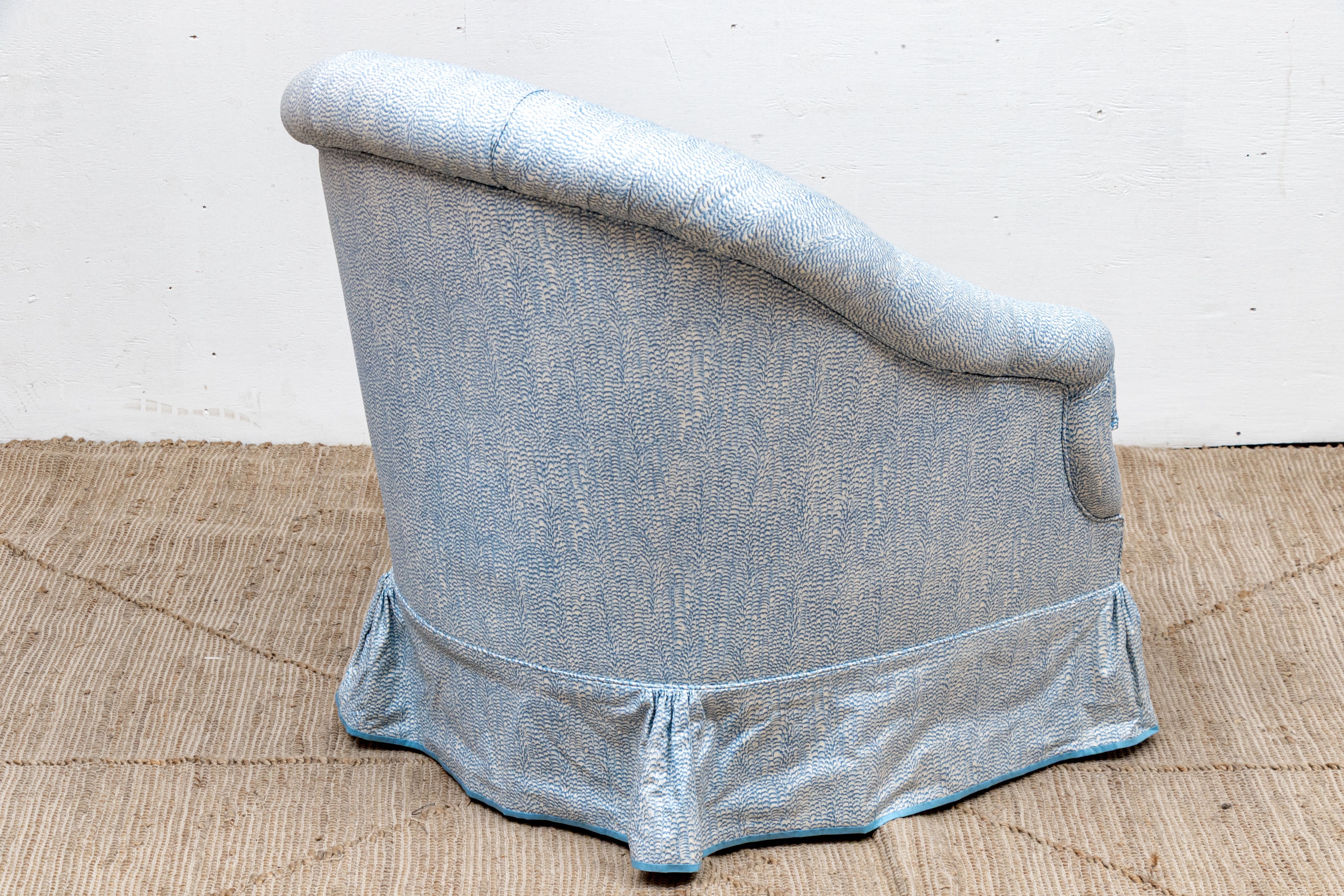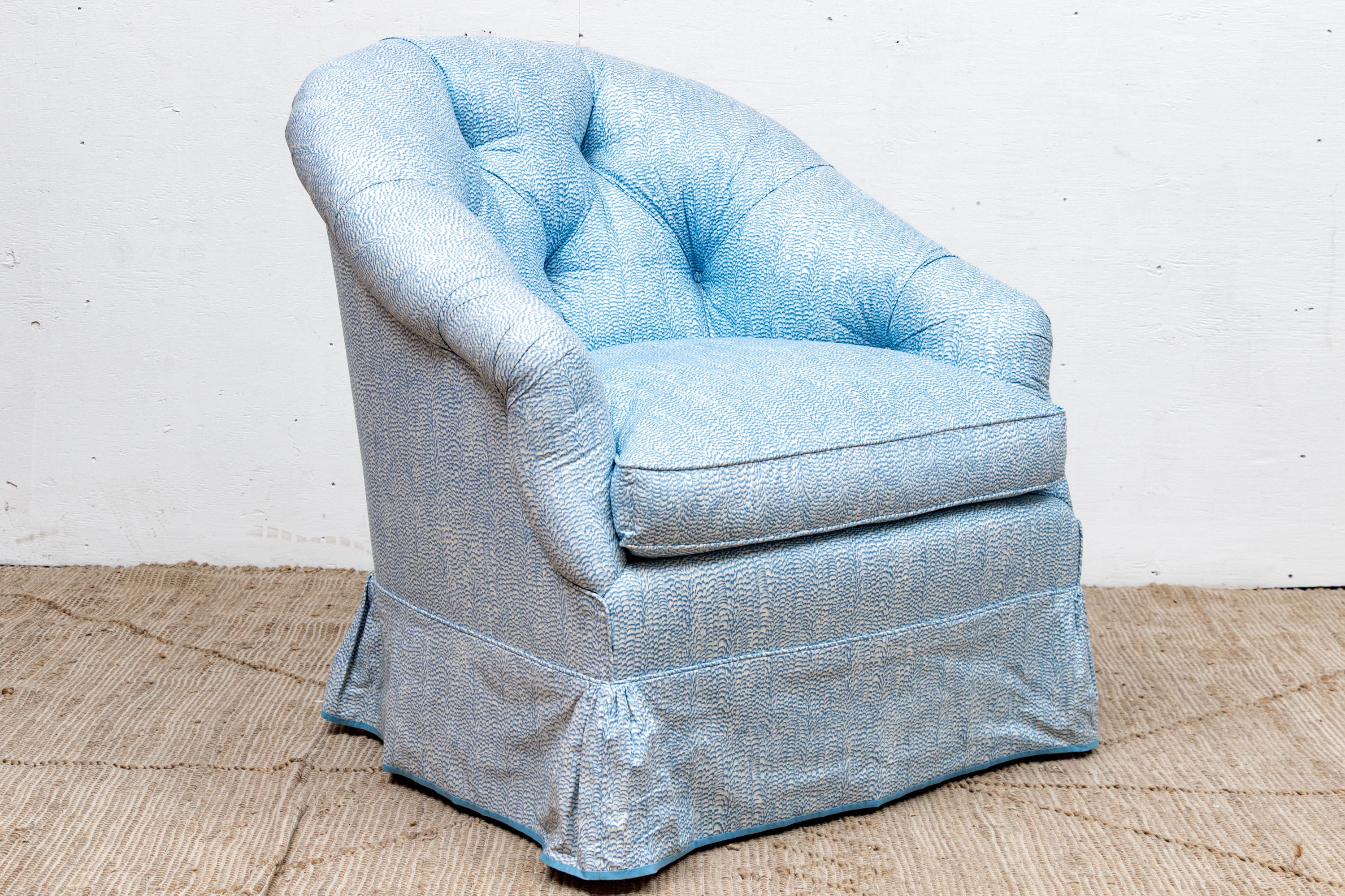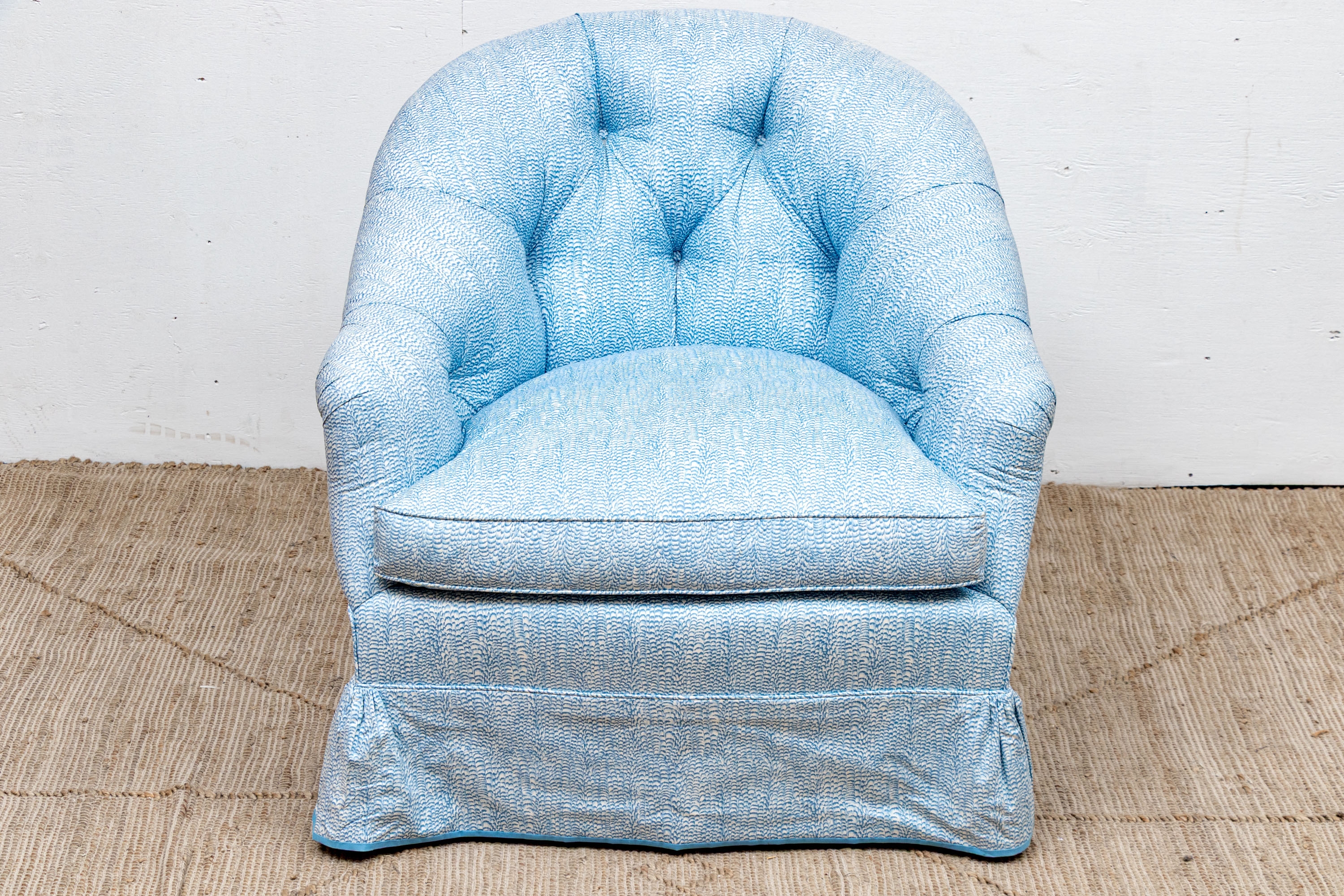 A fabulous tub back armchair with an English design showcasing a high rounded back and sloping, rolled arm detailed with button tufting on the interior. Fitted with a loose seat cushion and custom upholstered in gorgeous light blue fabric with a feathery pattern. Finished with a skirt concealing the legs beneath.