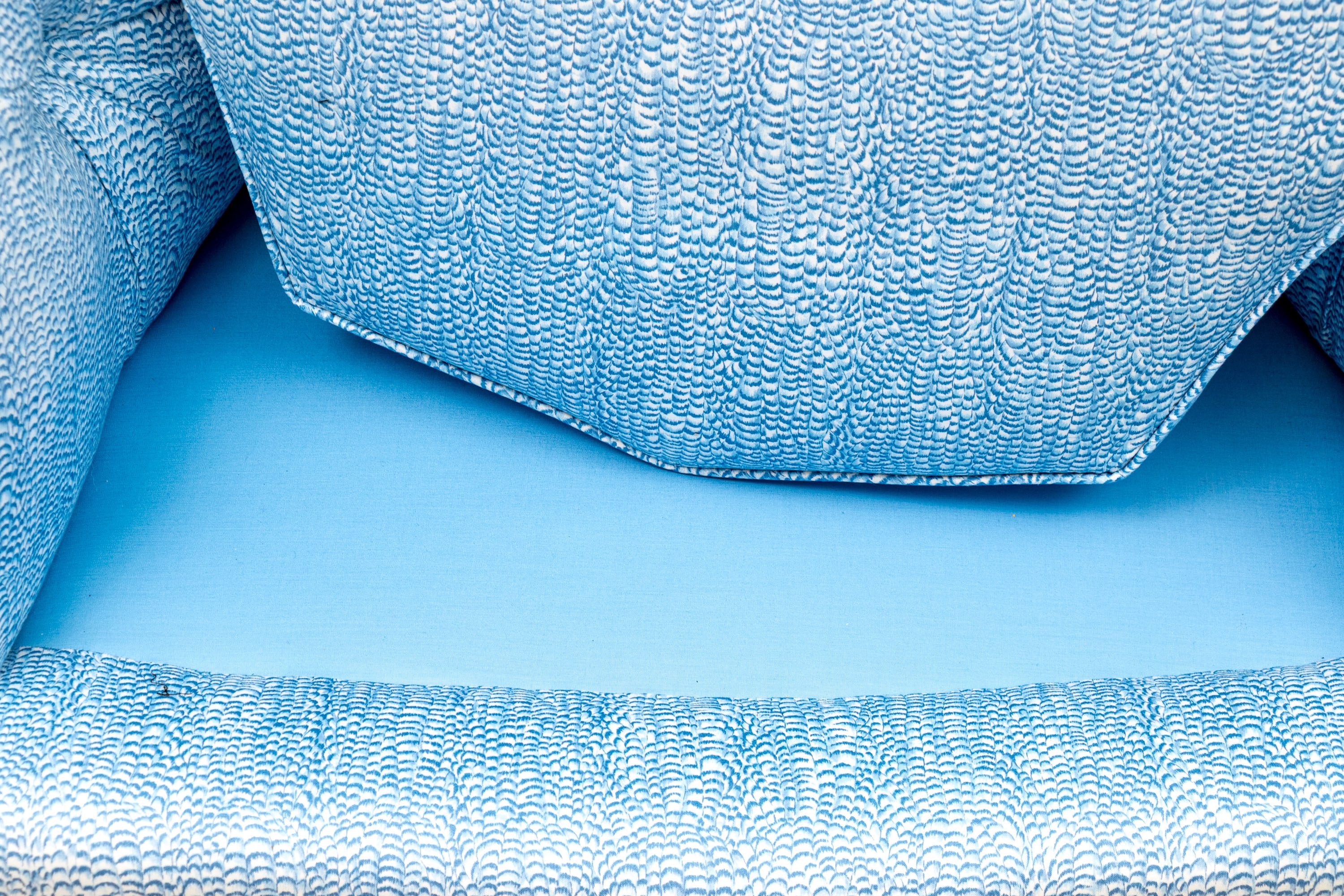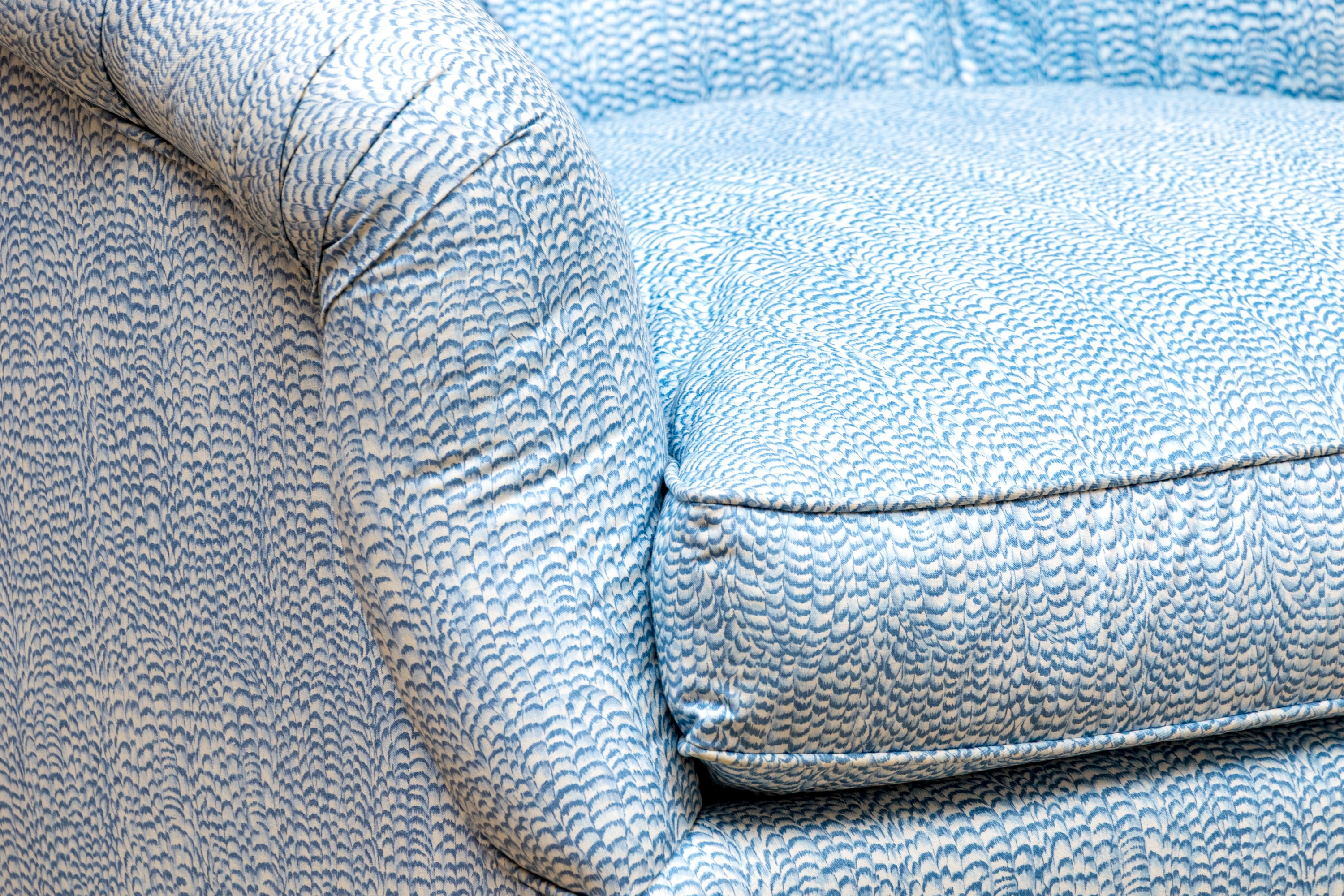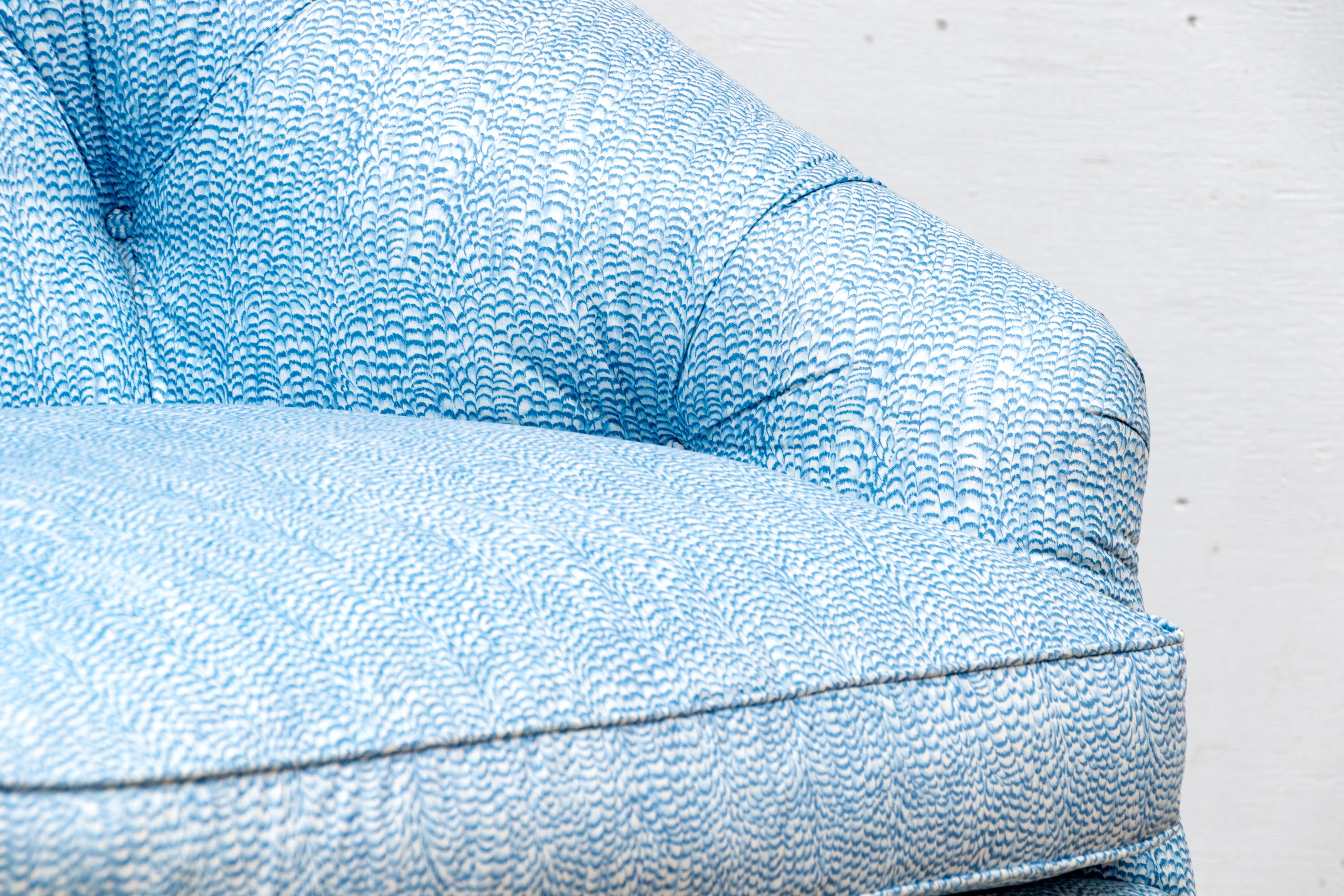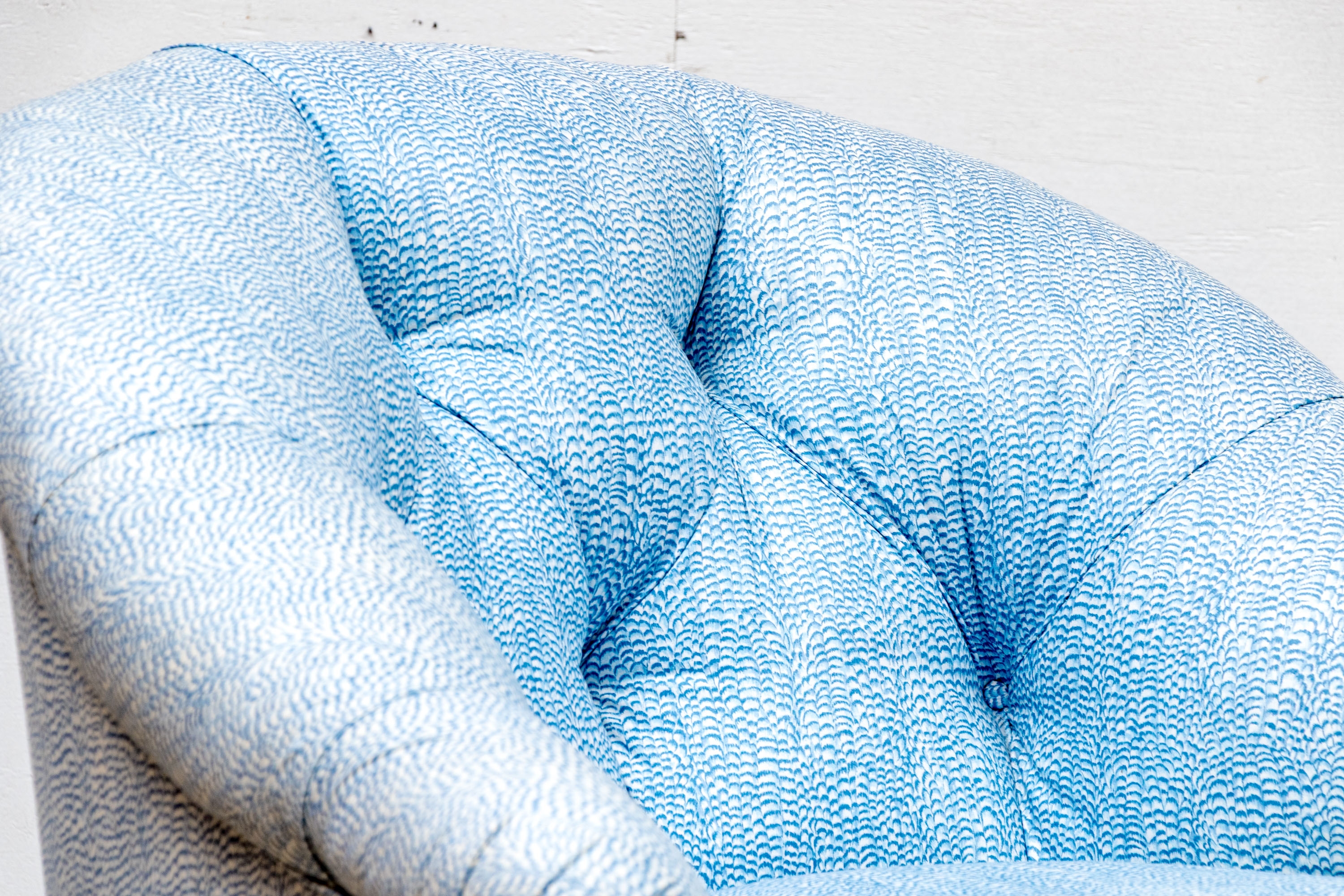 A fabulous tub back armchair with an English design showcasing a high rounded back and sloping, rolled arm detailed with button tufting on the interior. Fitted with a loose seat cushion and custom upholstered in gorgeous light blue fabric with a feathery pattern. Finished with a skirt concealing the legs beneath.