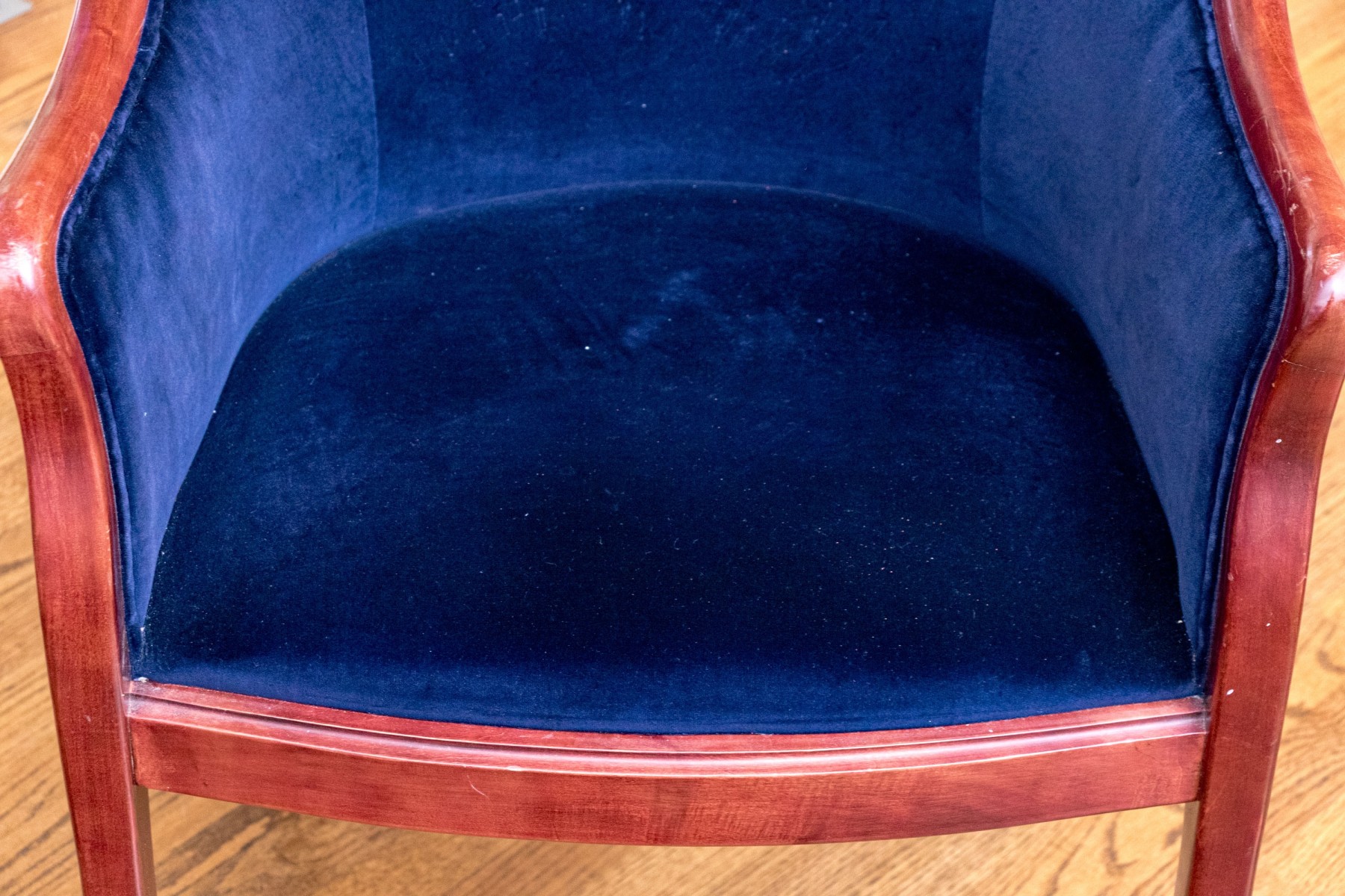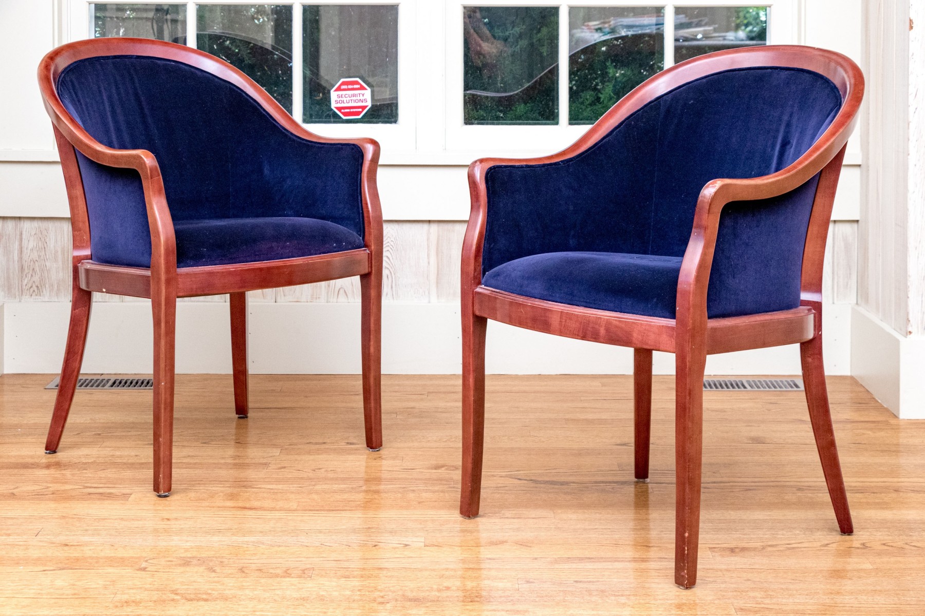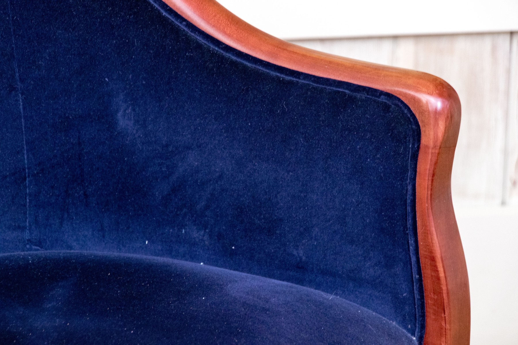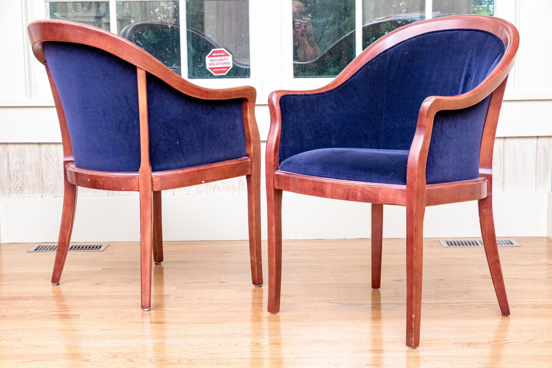 A delightful pair of bergeres beautifully blending traditional elegance with contemporary versatility. The chairs feature barrel backs and seats upholstered in luxurious royal blue velvet, surrounded by exposed wood frame with arched backs swooping into shaped arms before finishing with straight and tapered front legs and gently flared back legs in a cherry red-brown finish.