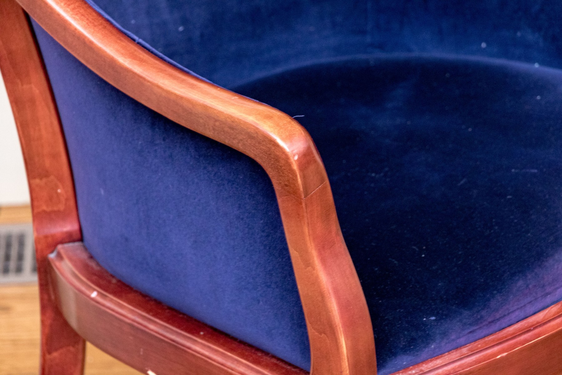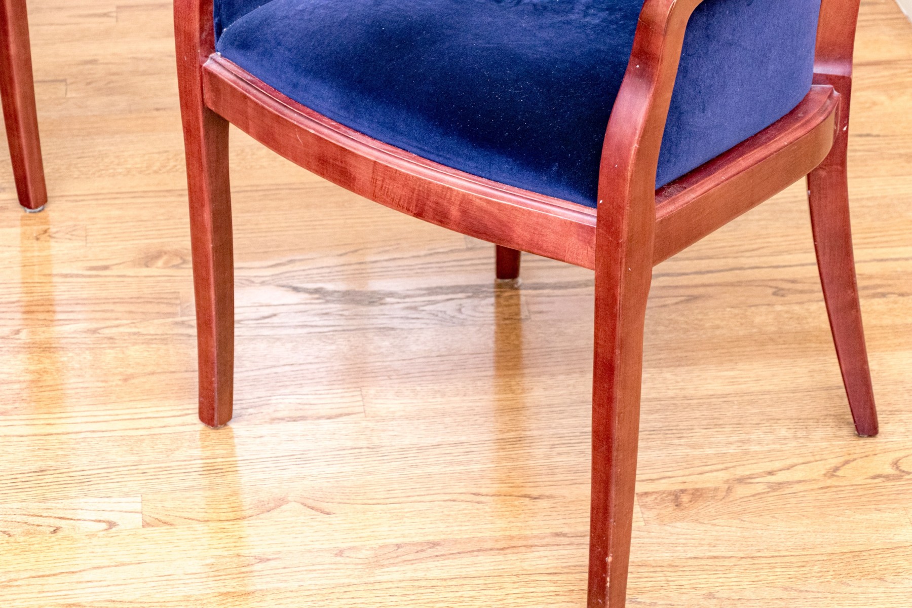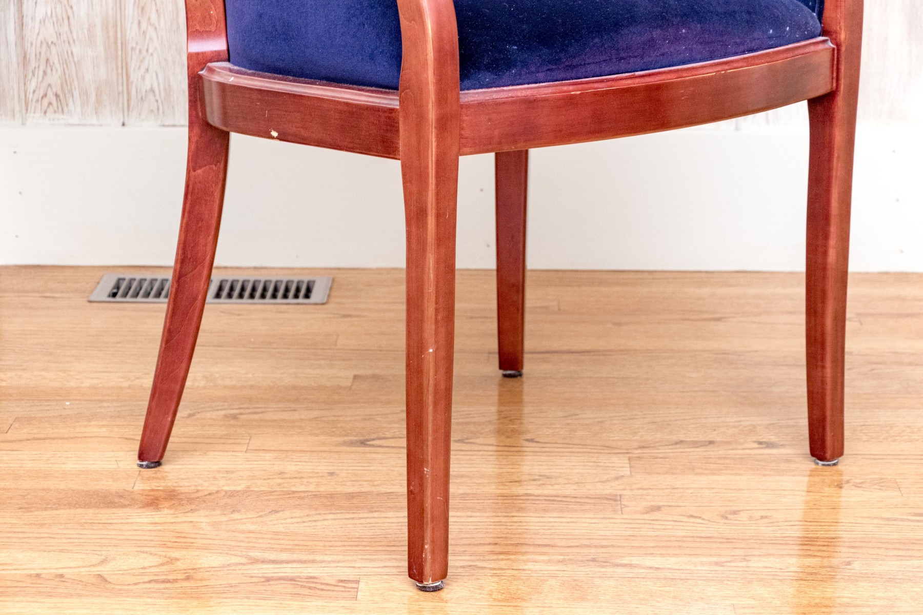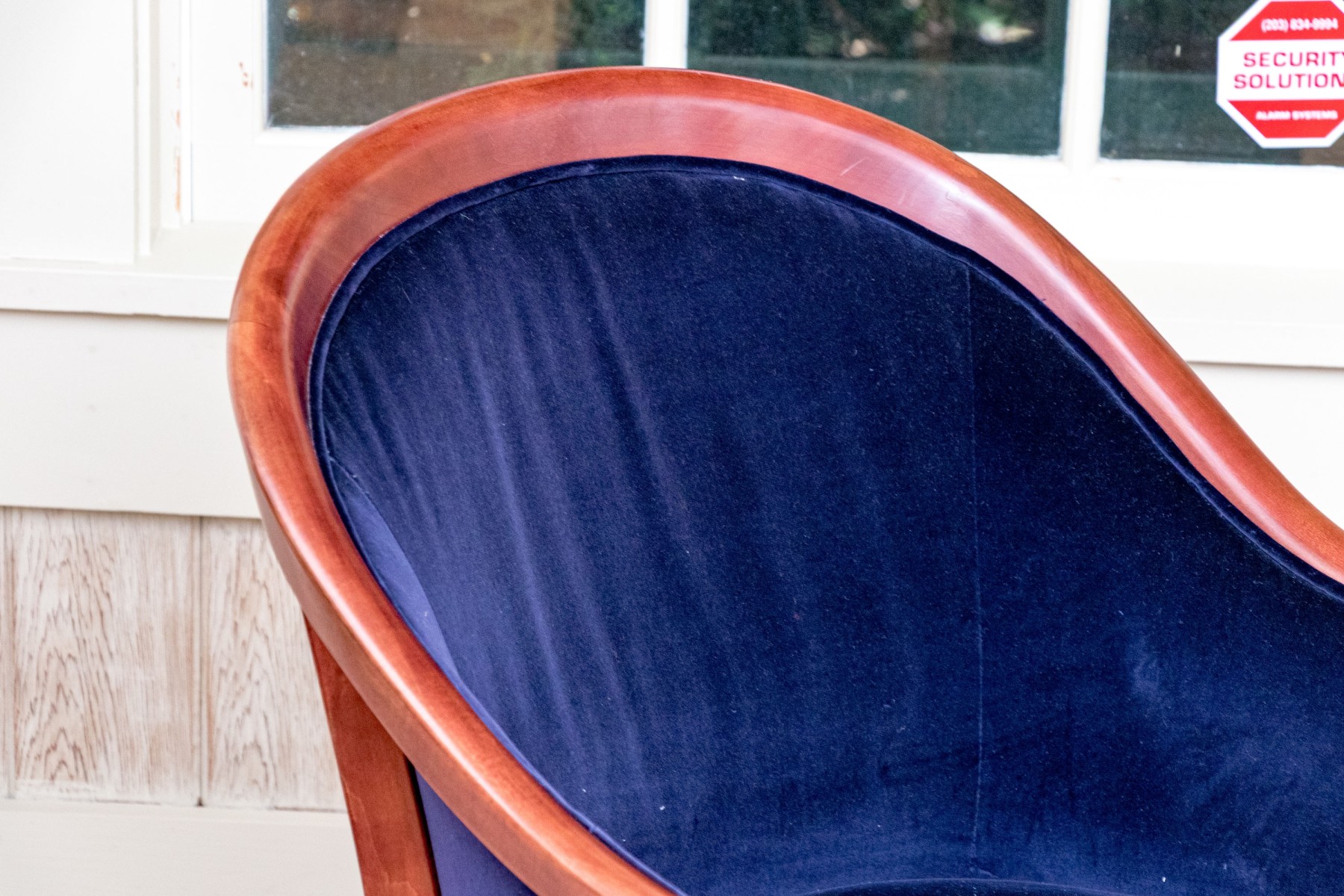 A delightful pair of bergeres beautifully blending traditional elegance with contemporary versatility. The chairs feature barrel backs and seats upholstered in luxurious royal blue velvet, surrounded by exposed wood frame with arched backs swooping into shaped arms before finishing with straight and tapered front legs and gently flared back legs in a cherry red-brown finish.