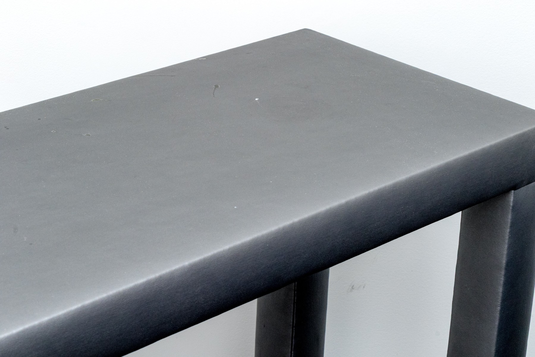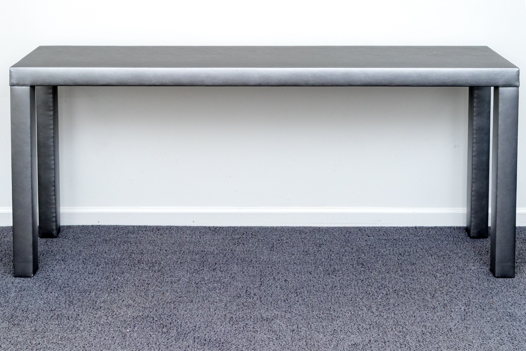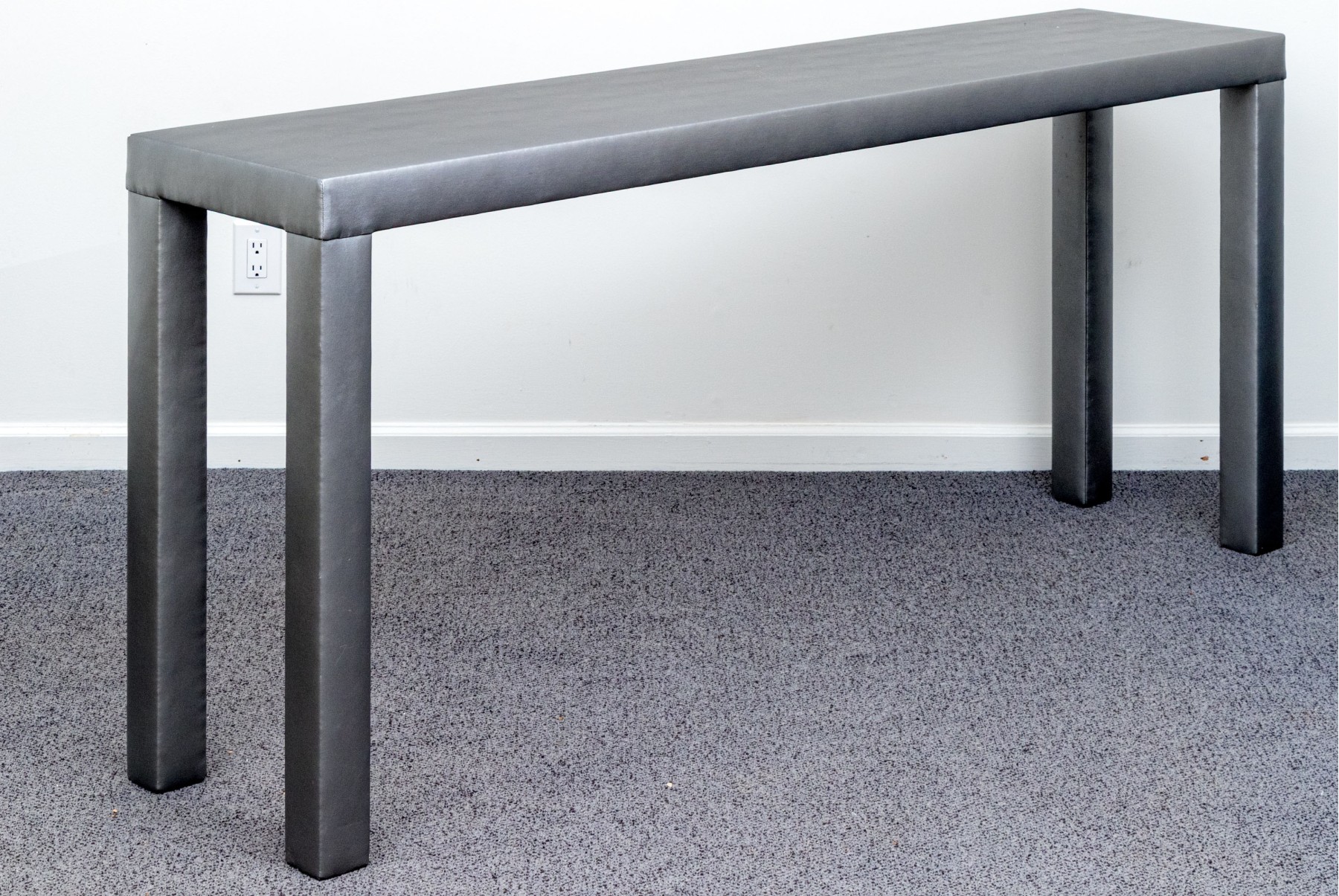A handsome contemporary console table with a sleek, minimalist form wrapped in silvertone vinyl throughout, balancing industrial brutalist style with versatile chic charm.