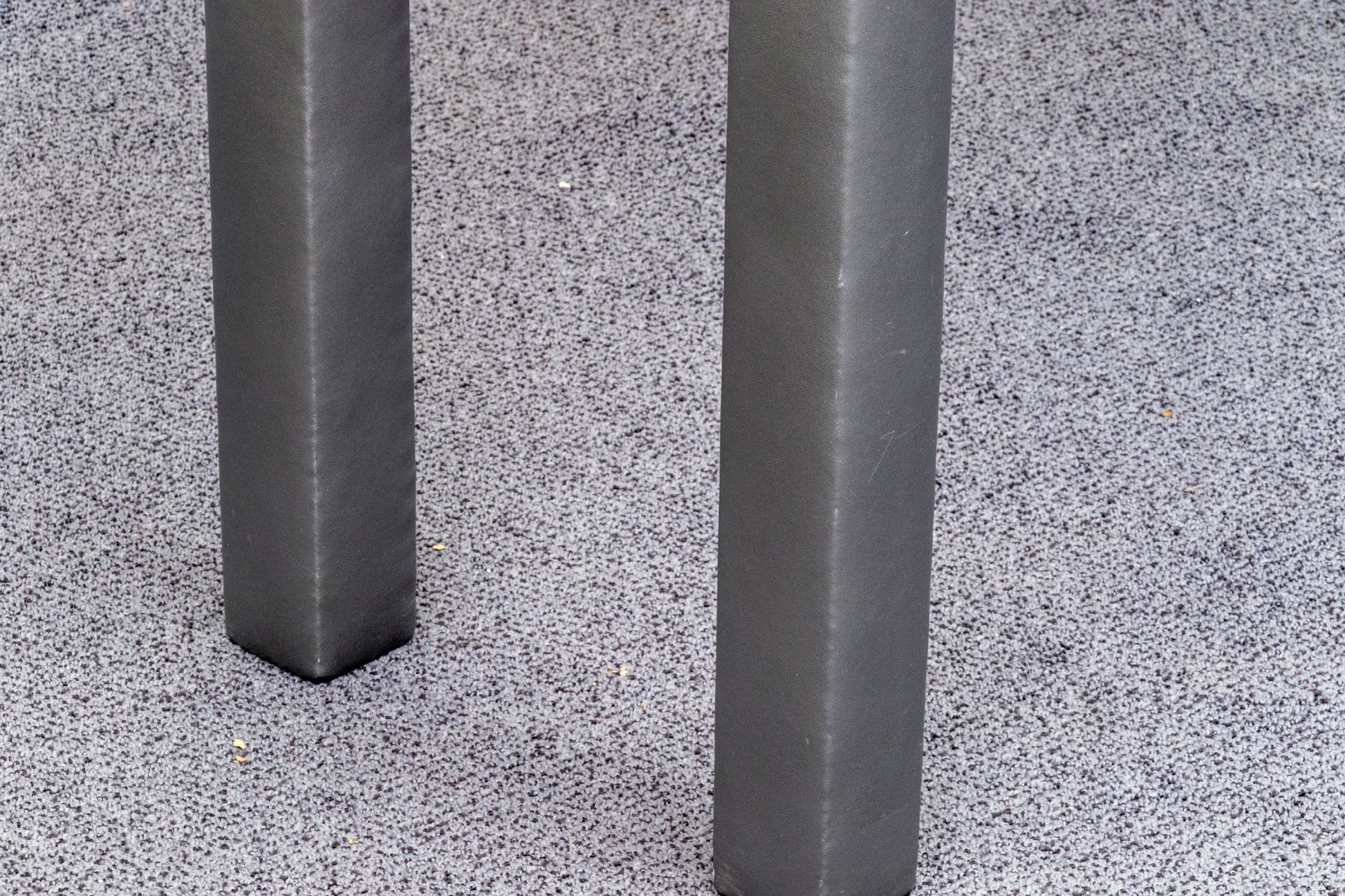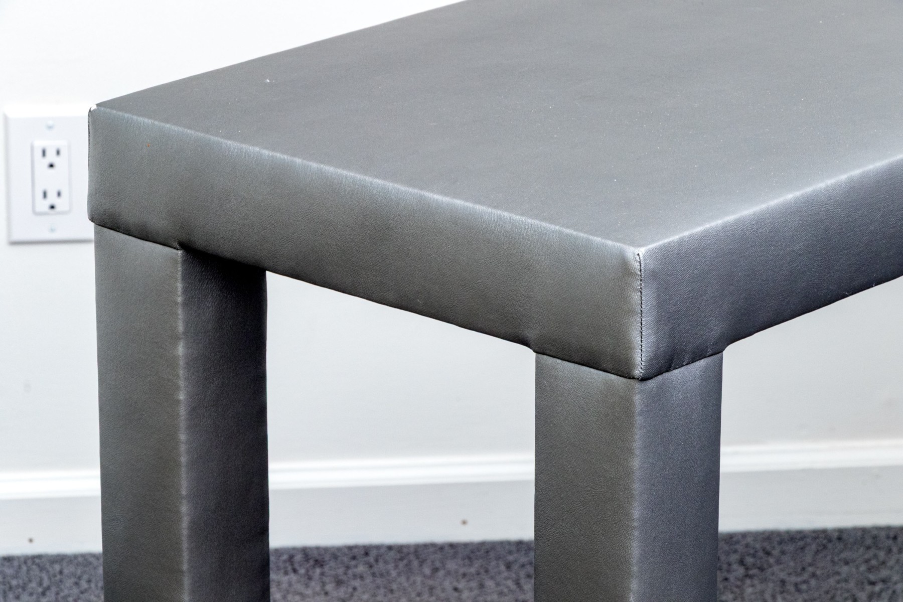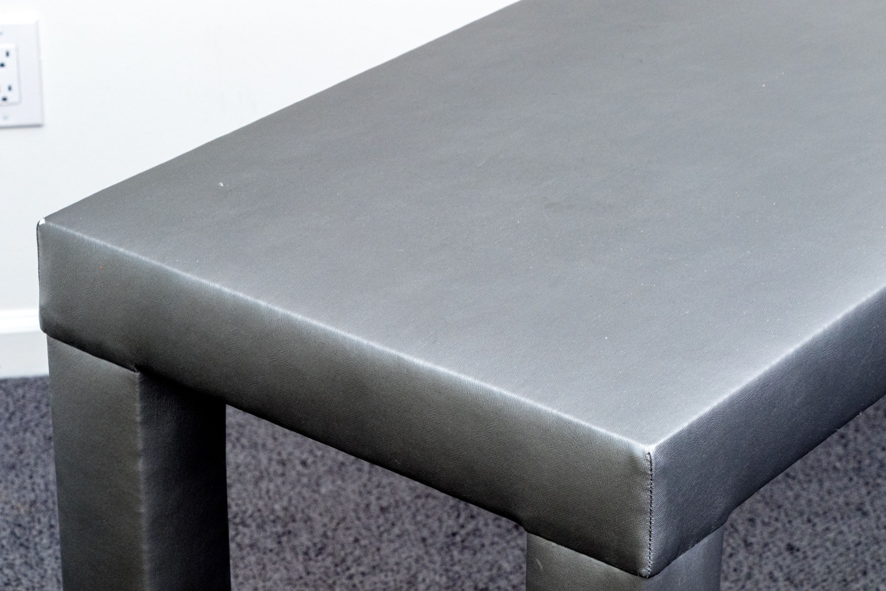 A handsome contemporary console table with a sleek, minimalist form wrapped in silvertone vinyl throughout, balancing industrial brutalist style with versatile chic charm.
