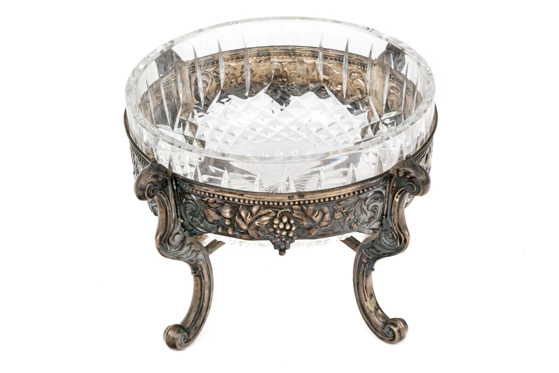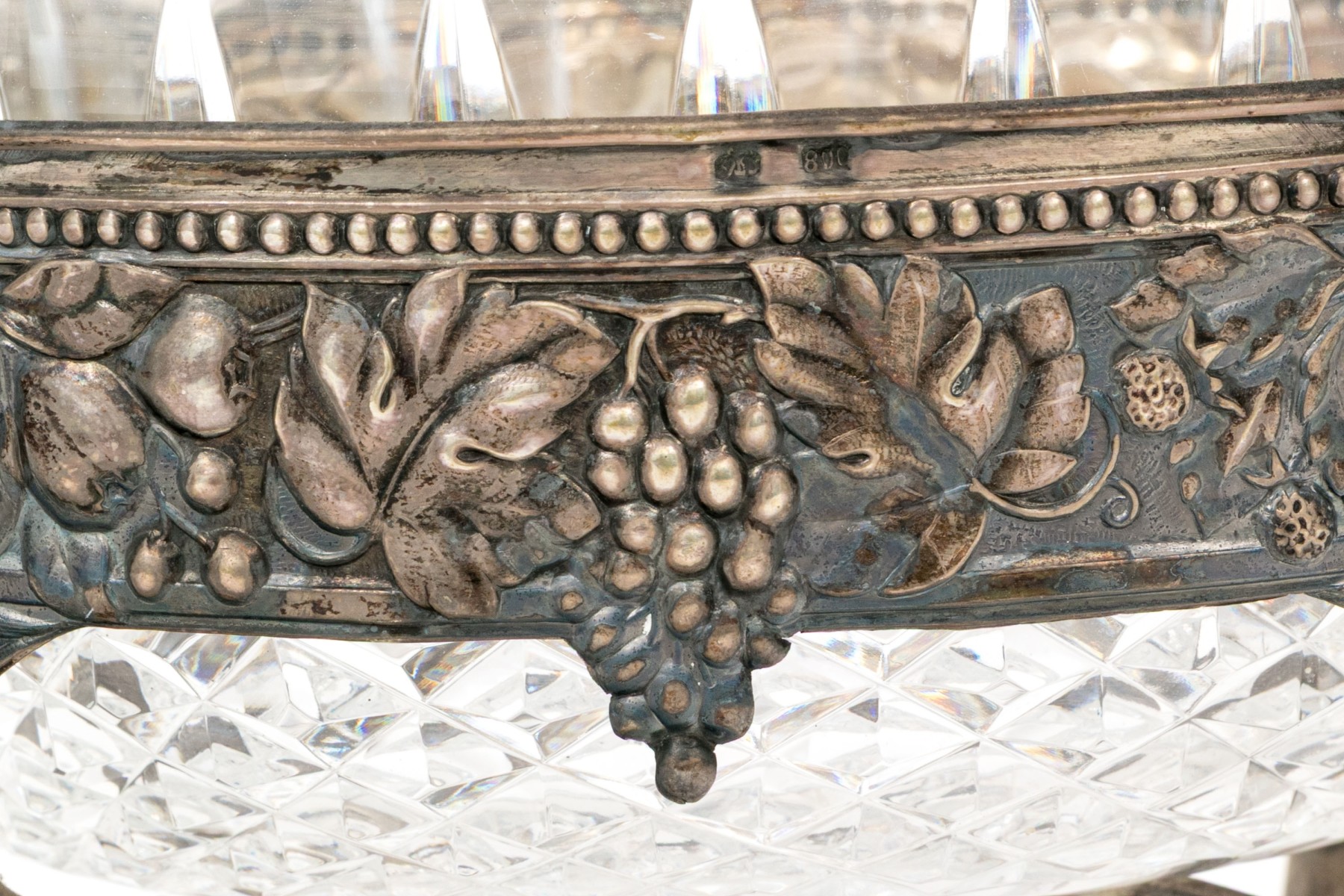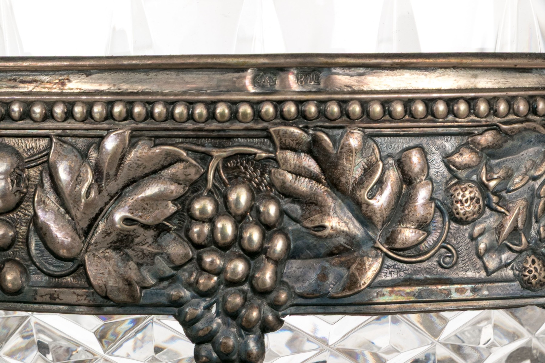 A fabulous and elegantly cut crystal bowl fitting within a lavish coin silver footed frame with scrolled posts supporting a rim with a beaded trim over ornate grapevine relief.