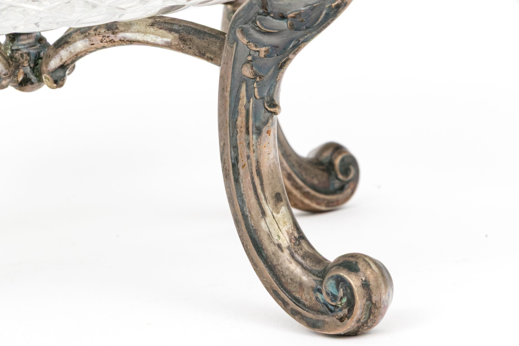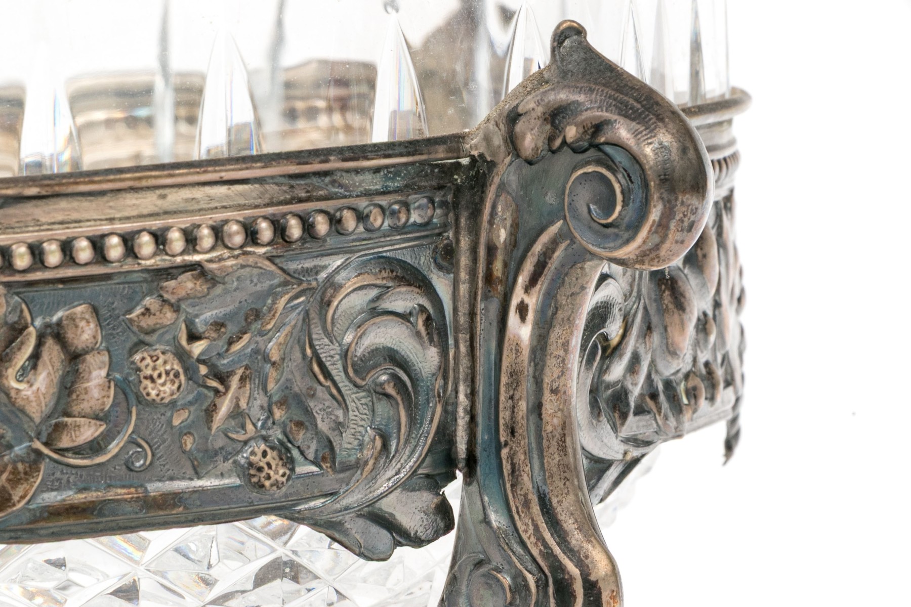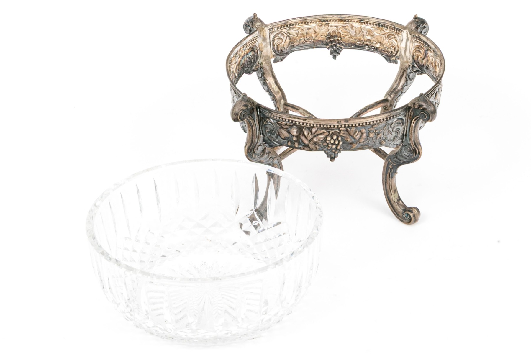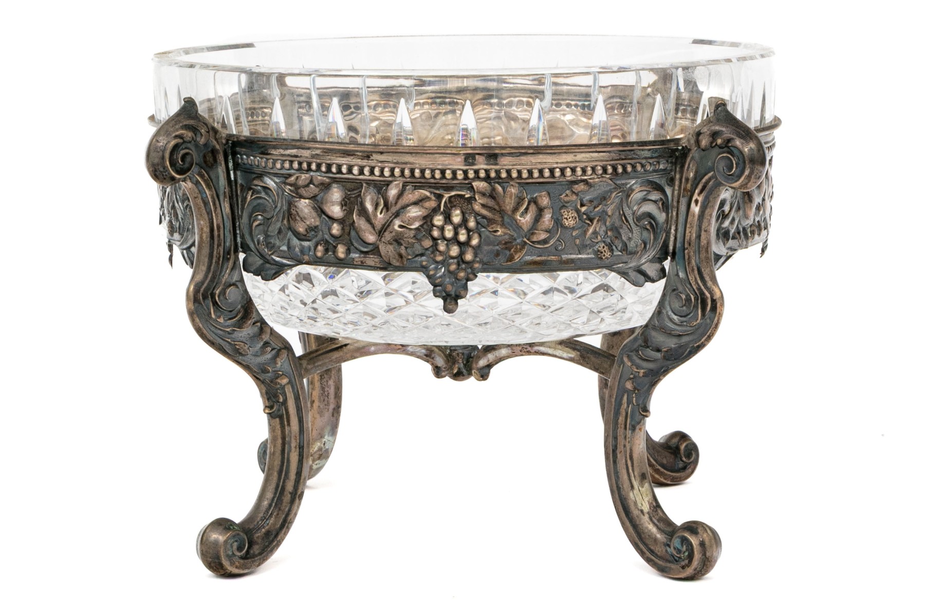 A fabulous and elegantly cut crystal bowl fitting within a lavish coin silver footed frame with scrolled posts supporting a rim with a beaded trim over ornate grapevine relief.
