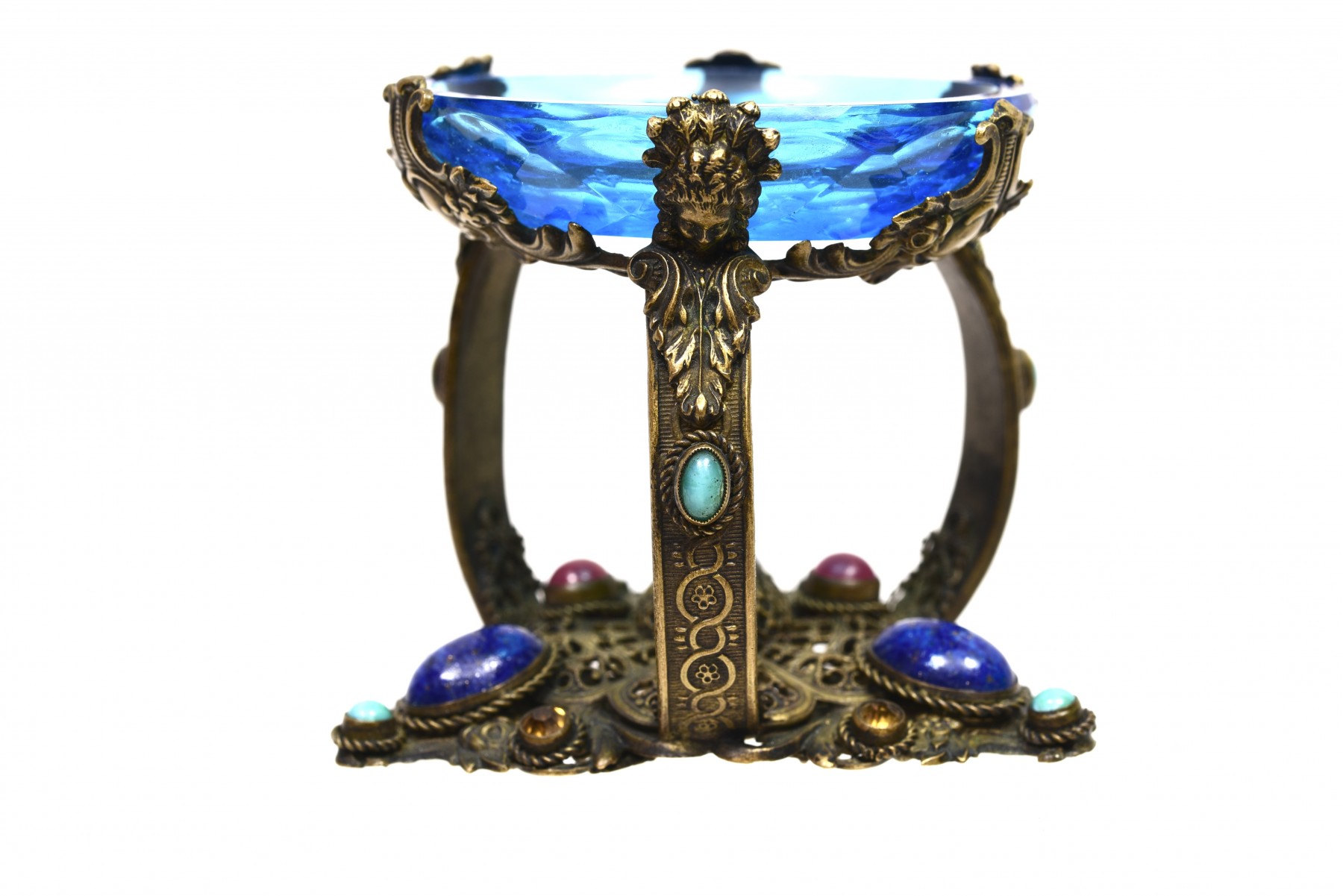 ACzech jeweled brass filigree open salt cellar with intaglio glass insert and was made around 1920s-1930s. The base has three large glass blue lapis stones, each being surrounded by a cabochon turquoise and two faceted amber glass stones. In the center is another turquoise stone and three cabochon caramel colored stones fill out the base.