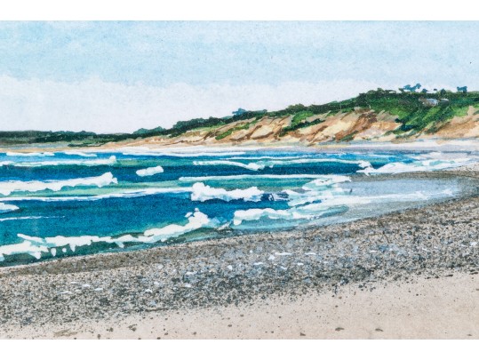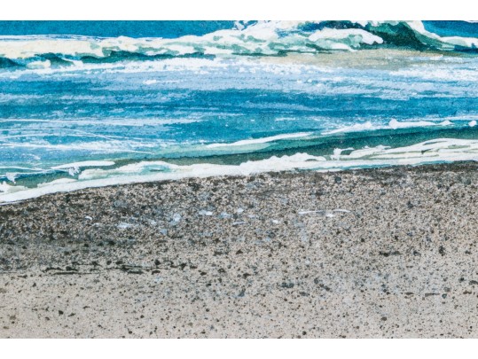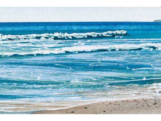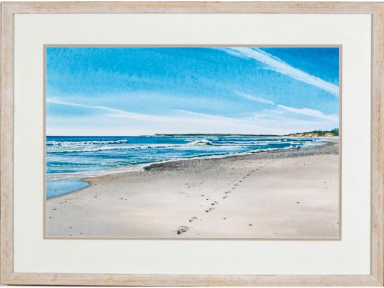 Signed in plate lower right. A lovely seascape featuring tracks in the sand along the shore with the surf rolling in under a blue sky. Presented in a textured pale wood frame with glass.