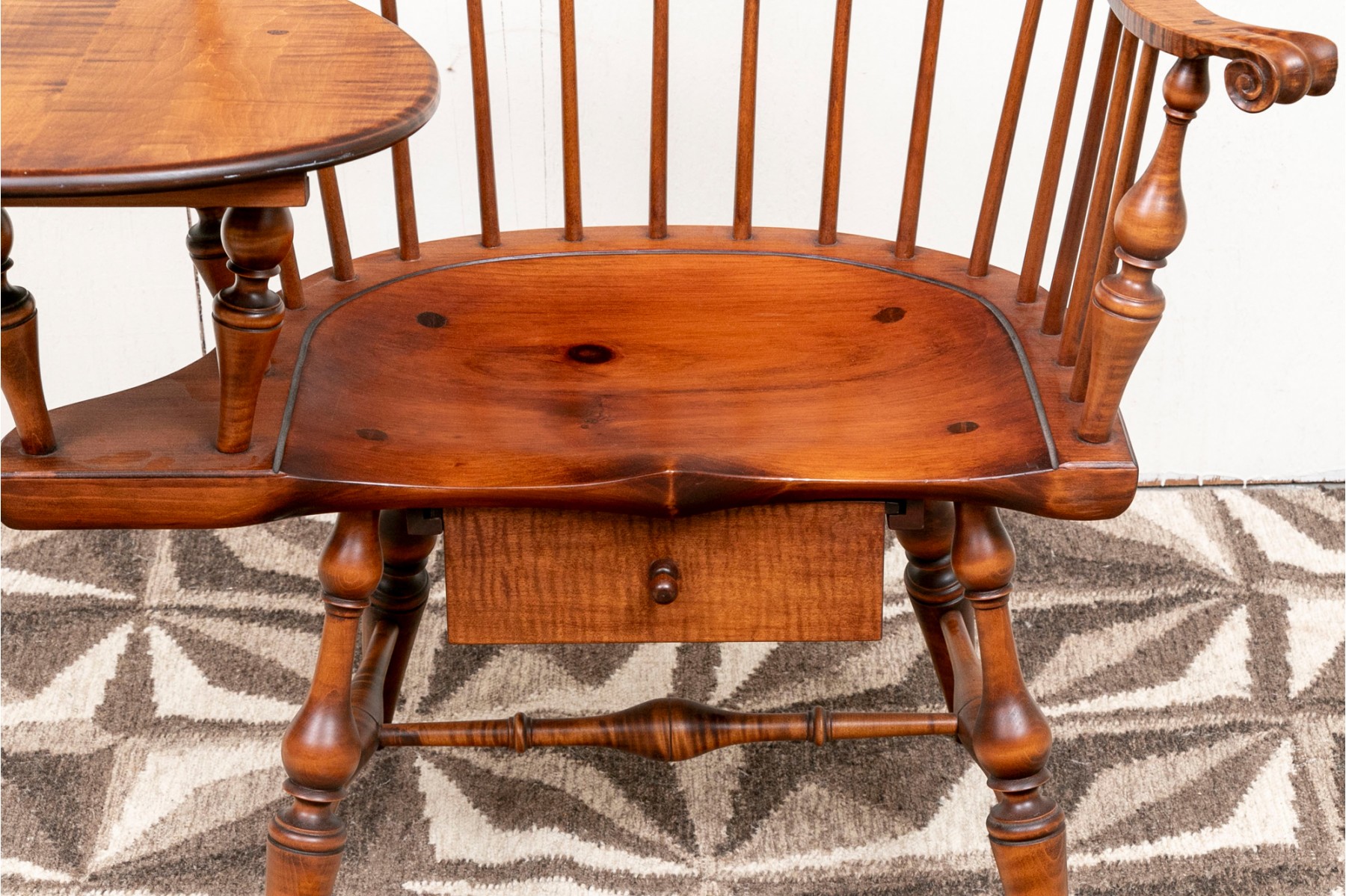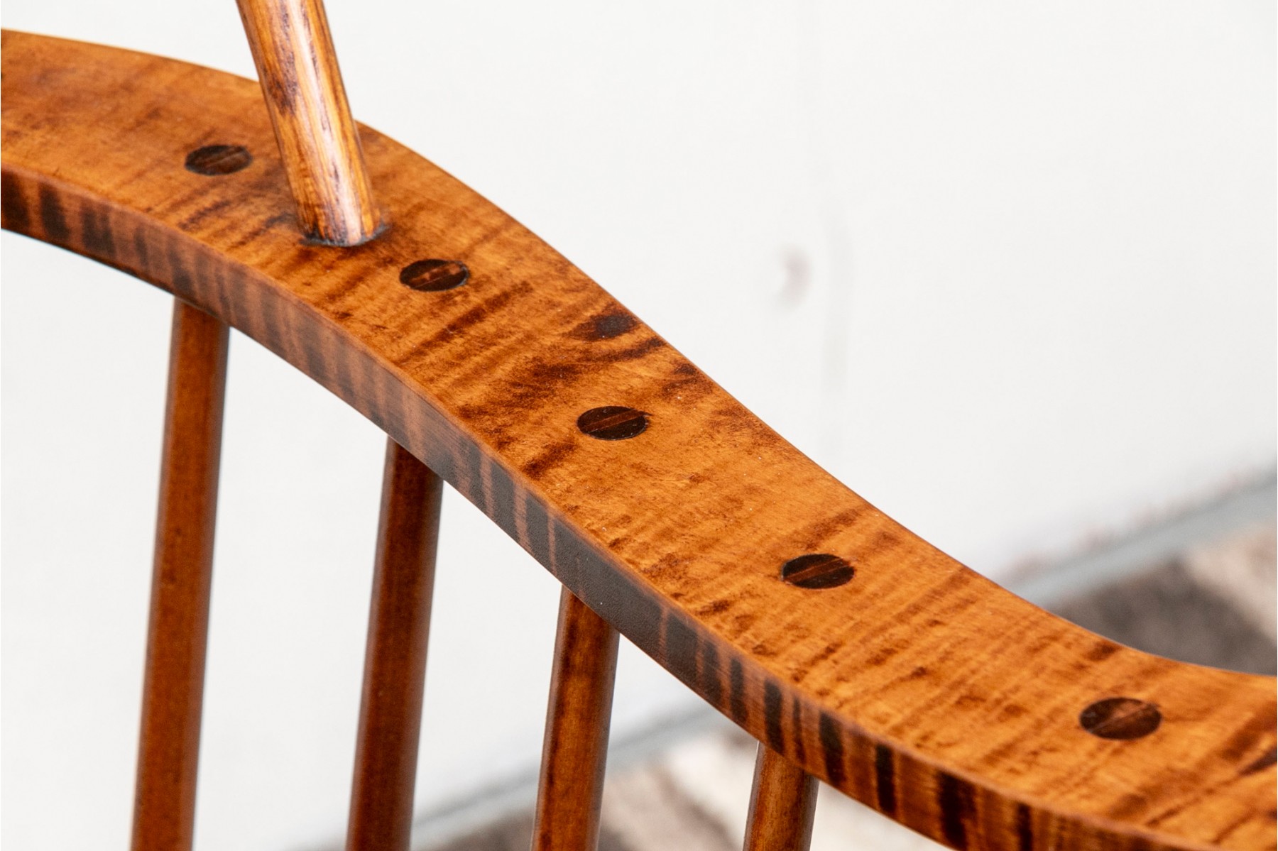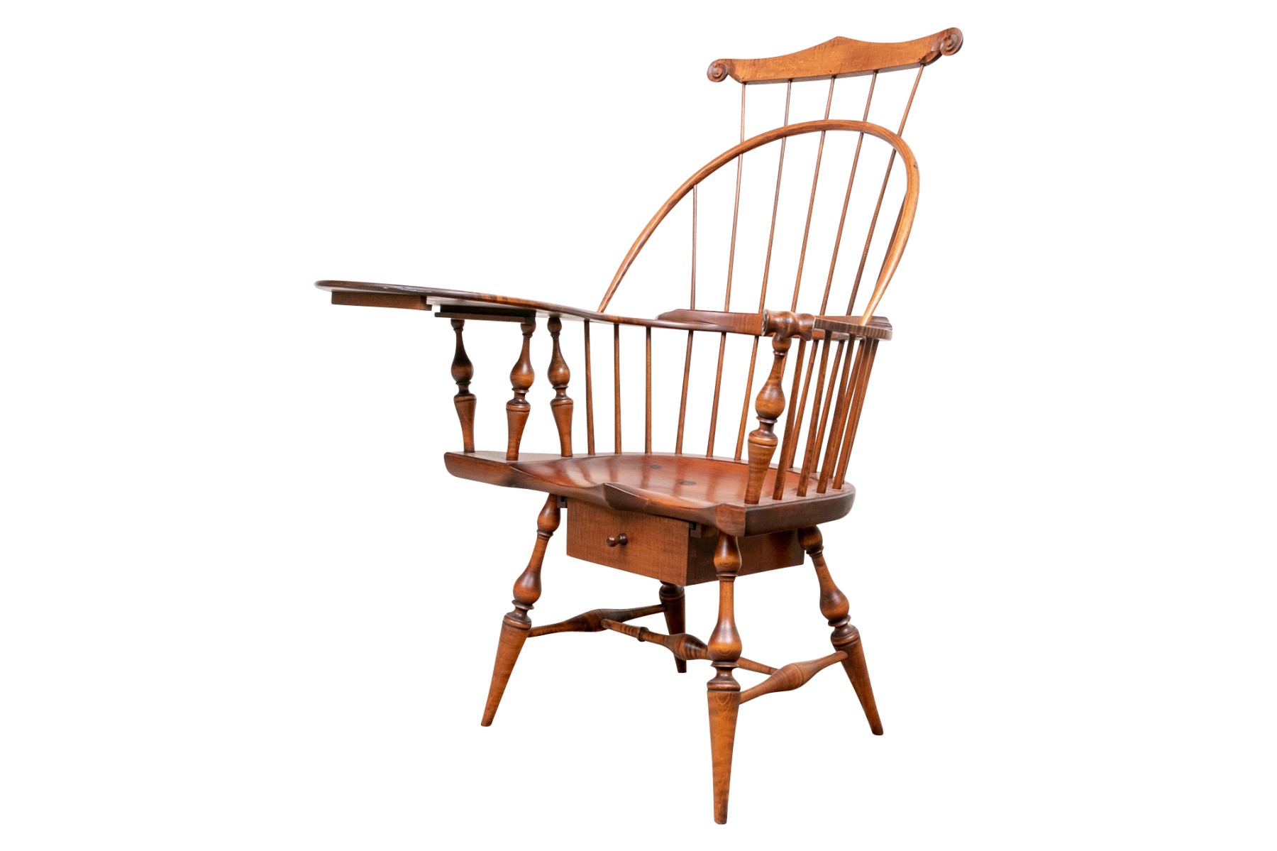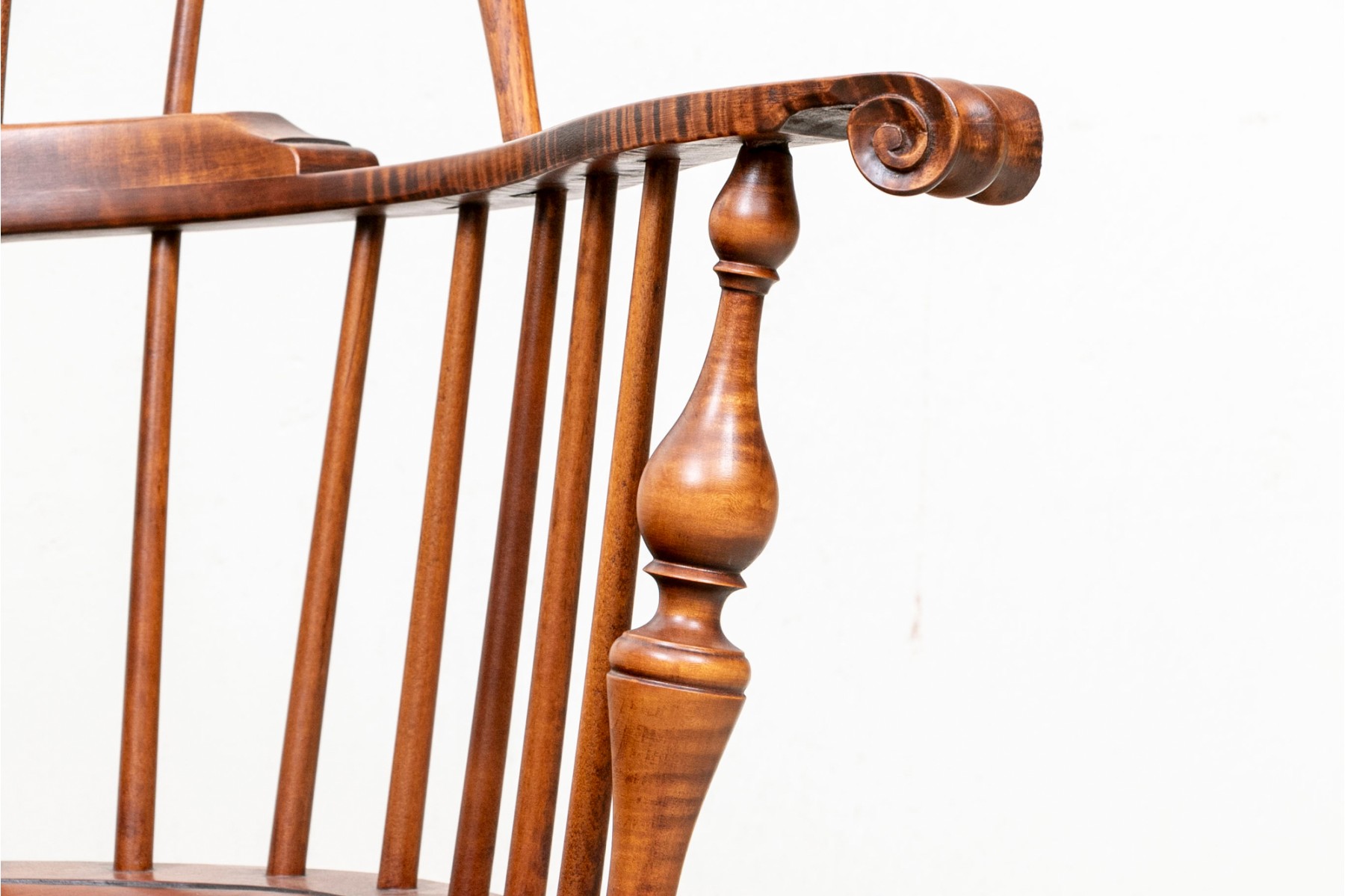 Incredible craftsmanship from celebrated furniture maker D.R. Dimes who is known for his noted Windsor Chairs. With Classic Windsor form in mixed woods with Oak Hoop Back and finished in Honey tone.