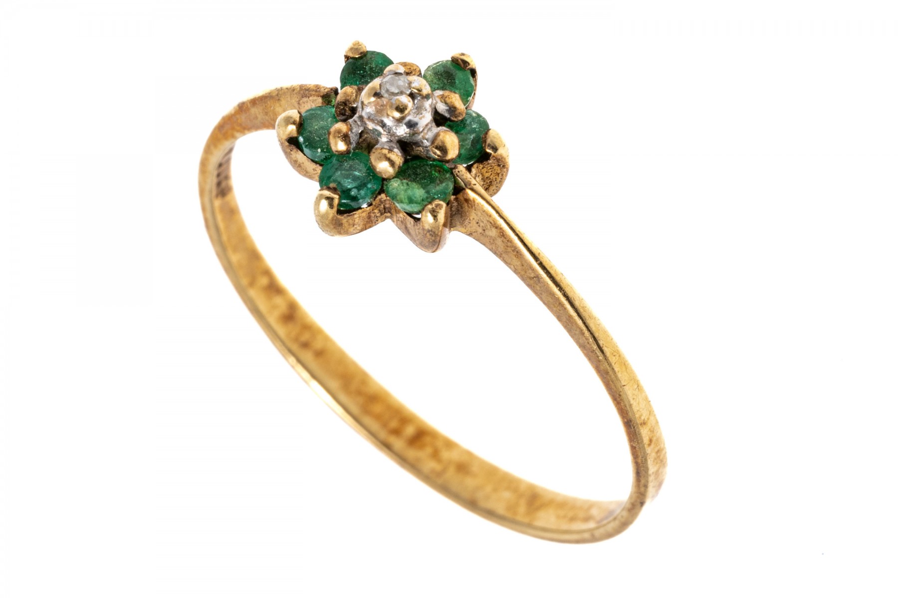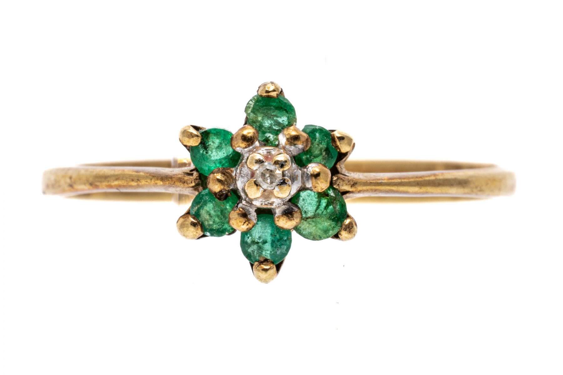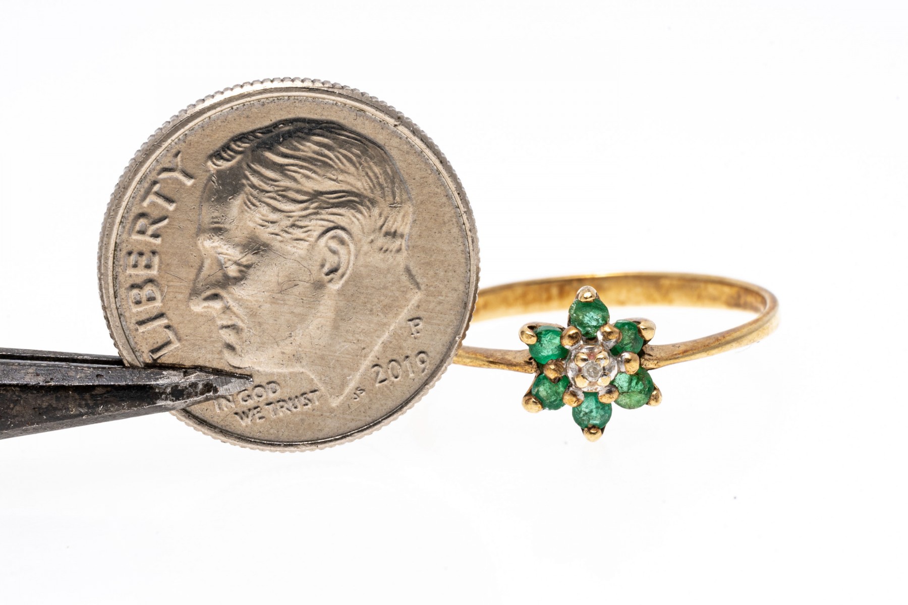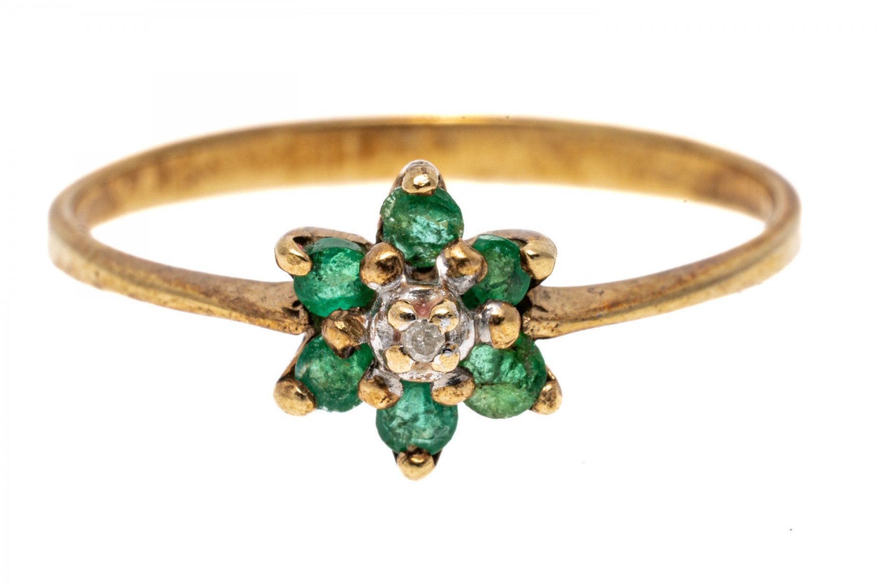 This dainty 10K yellow gold ring is set with a cluster of round faceted emeralds surrounding a raised accent diamond. The emeralds are approximately 0.12 TCW. Ring size 7-.