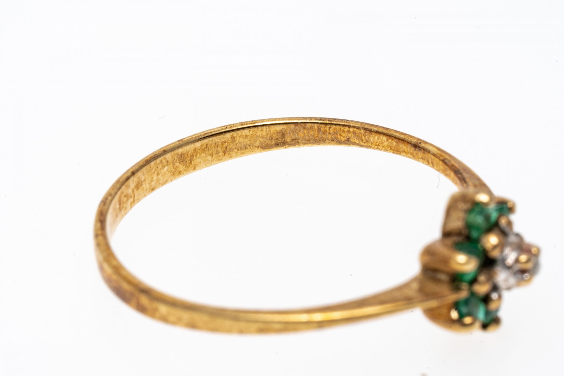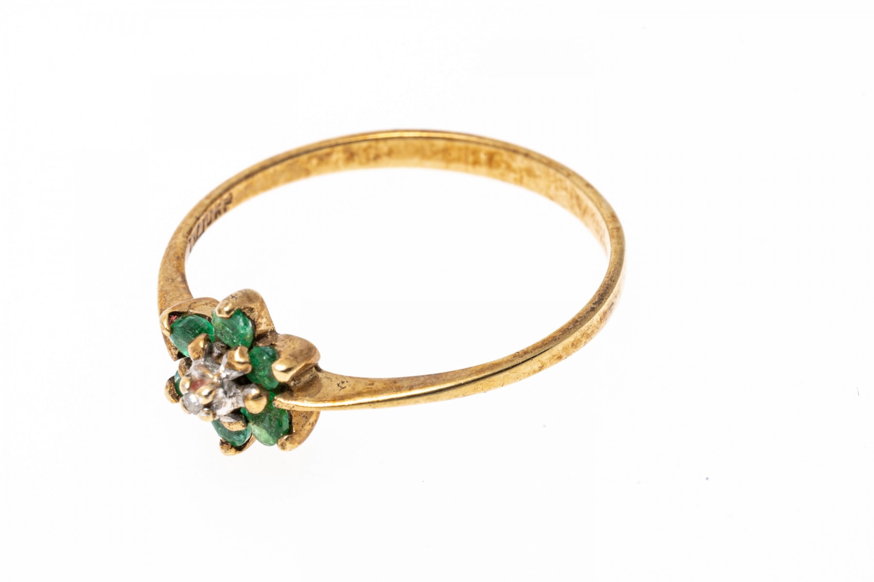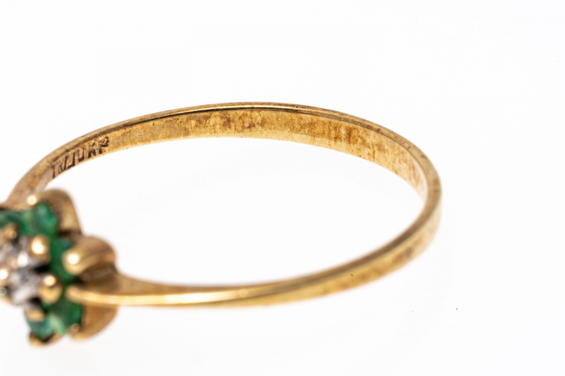 This dainty 10K yellow gold ring is set with a cluster of round faceted emeralds surrounding a raised accent diamond. The emeralds are approximately 0.12 TCW. Ring size 7-.