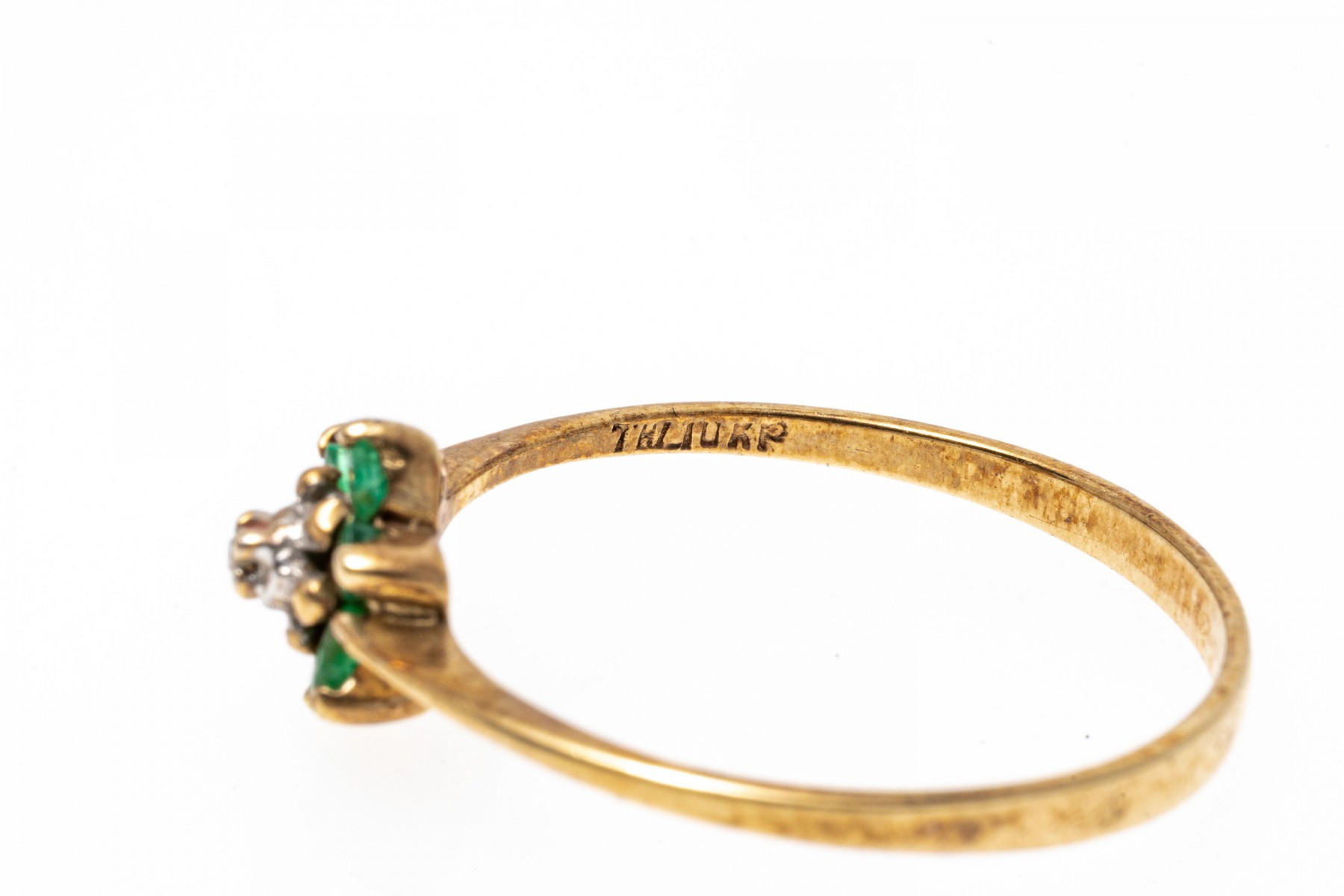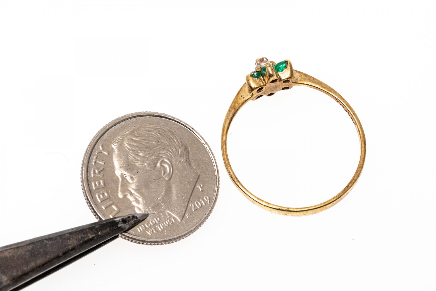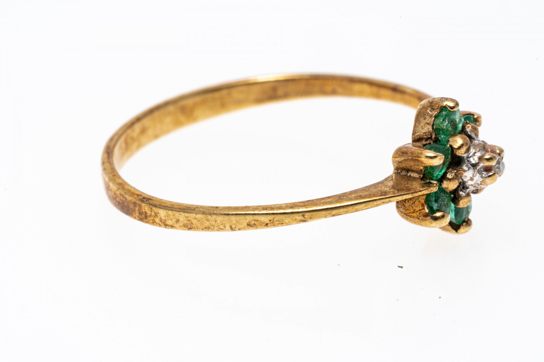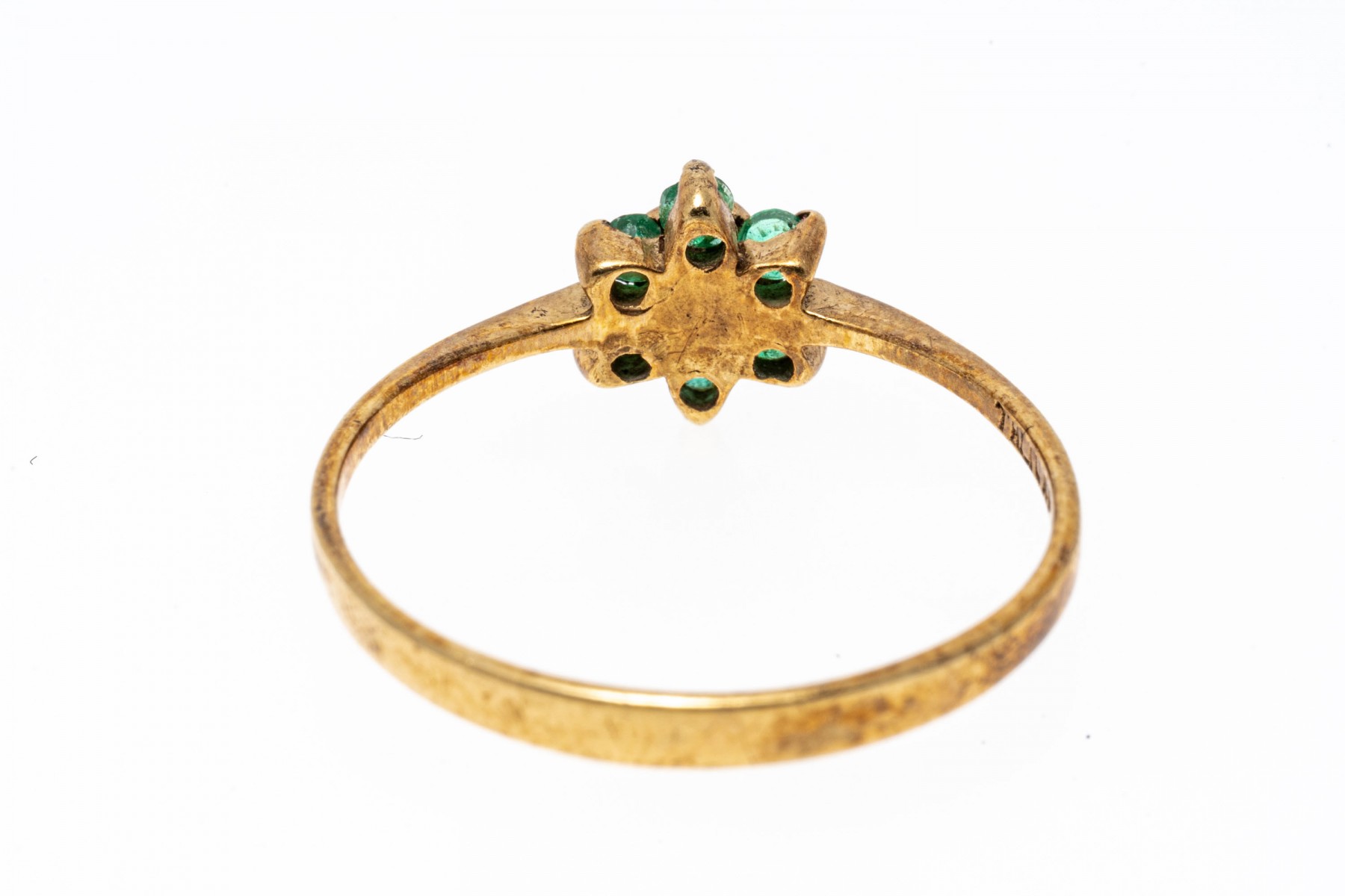 This dainty 10K yellow gold ring is set with a cluster of round faceted emeralds surrounding a raised accent diamond. The emeralds are approximately 0.12 TCW. Ring size 7-.