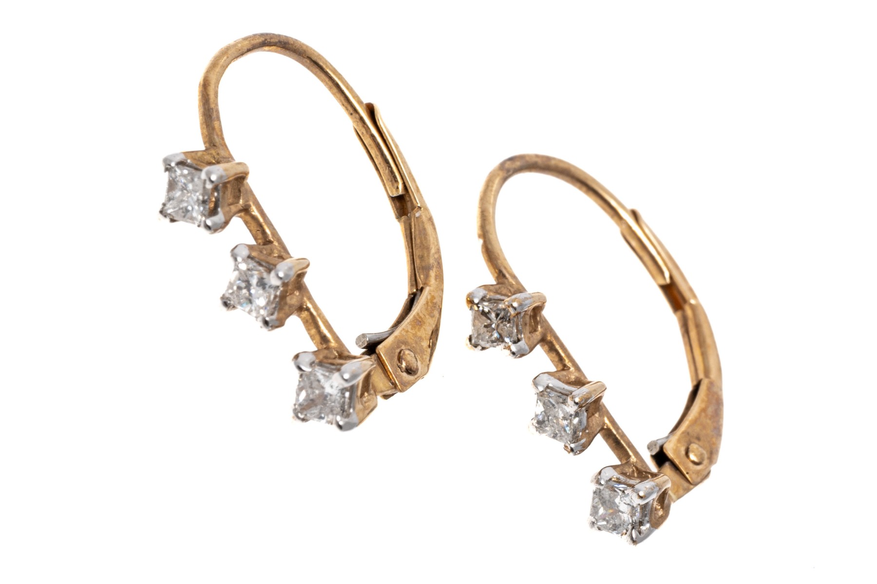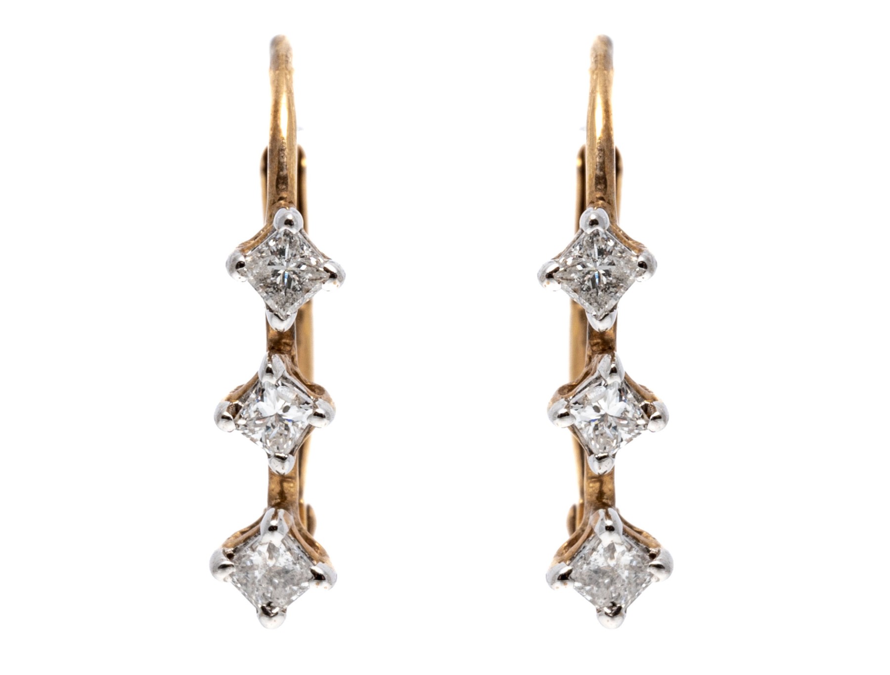 A pair of dainty earrings crafted in 10K yellow gold. Set into each of the earrings are three princess cut diamonds, approximately 0.21 TCW. Hook style backings.