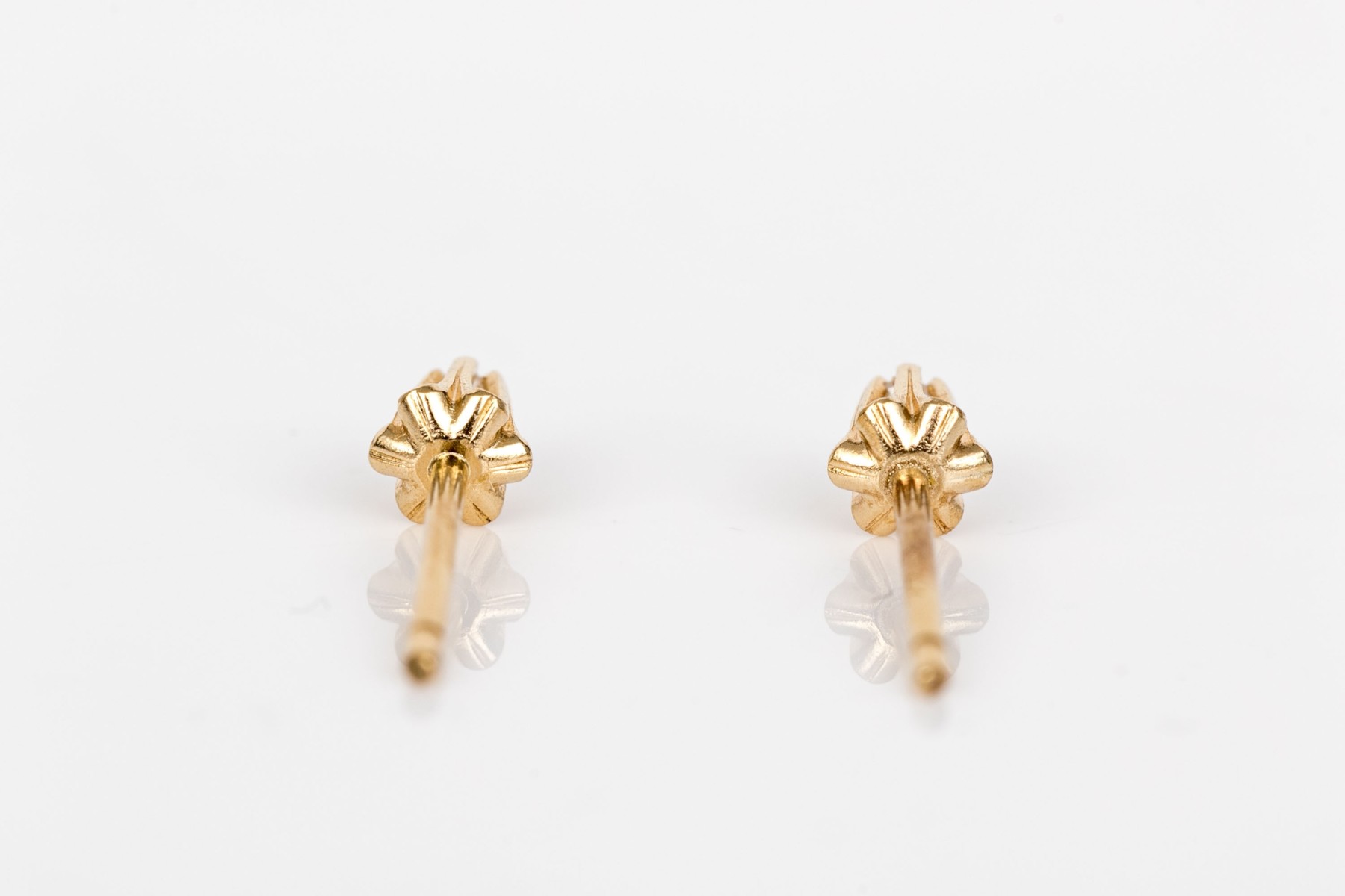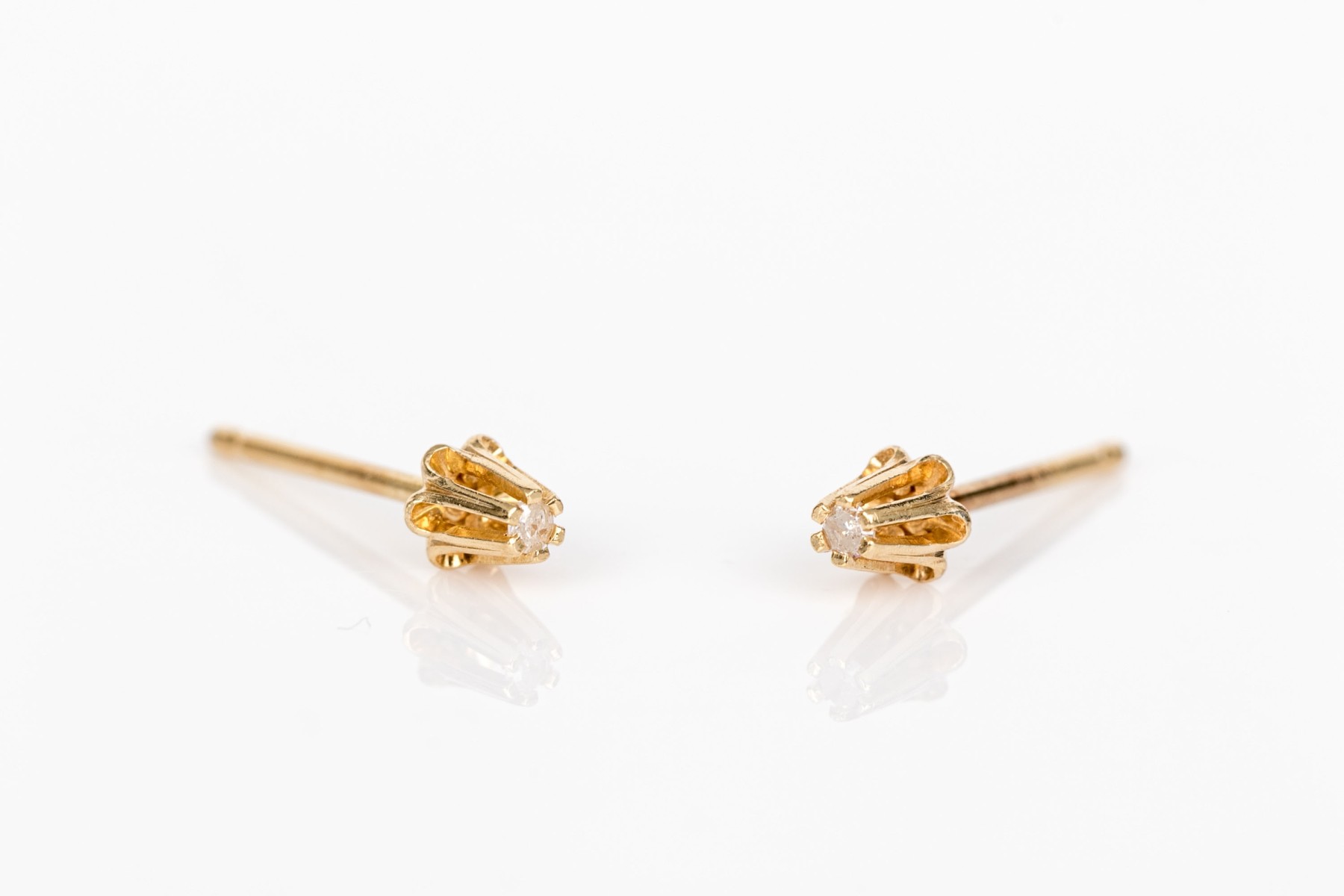 Dainty pair of 14K yellow gold stud earrings. Set into the earrings are round cut accent diamonds. Post backings.