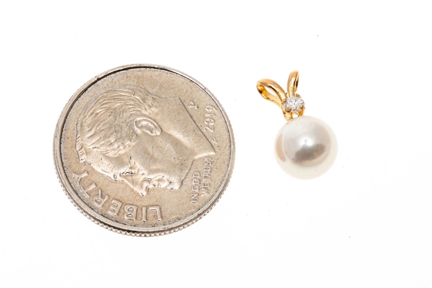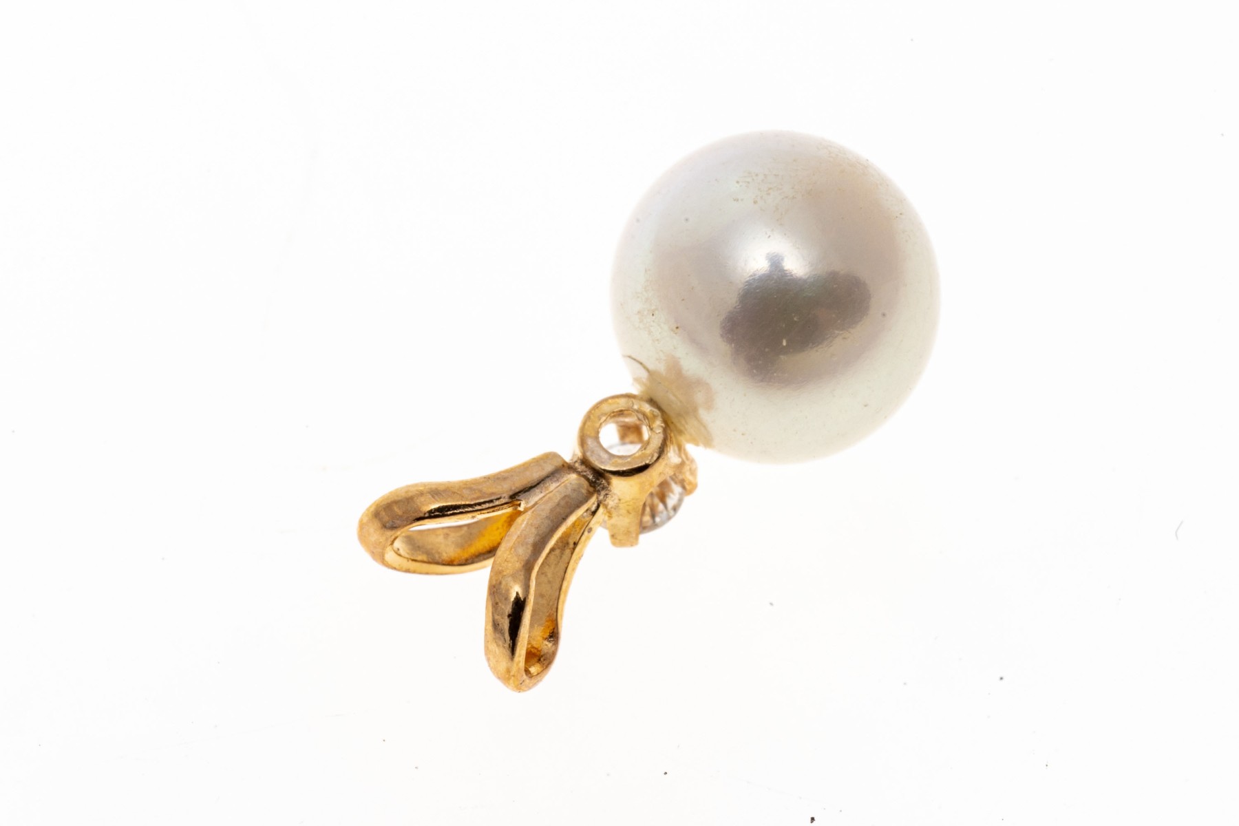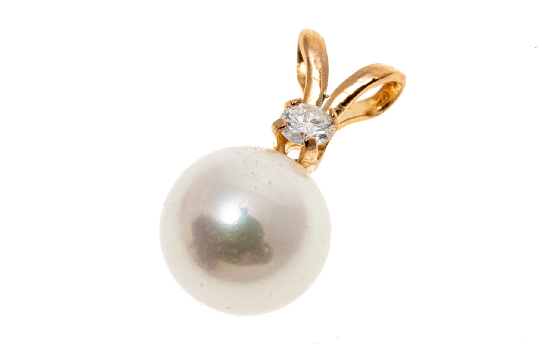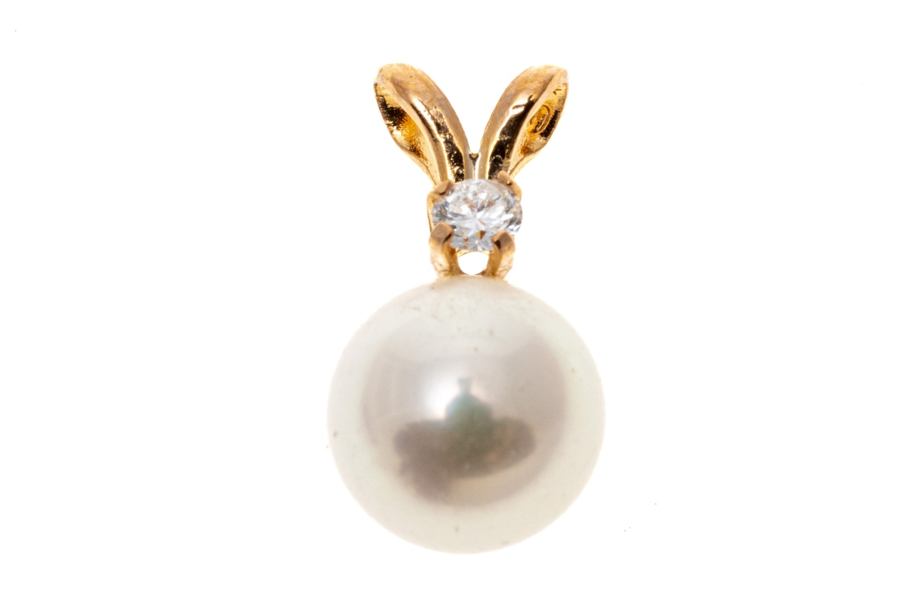 Dainty cultured freshwater pearl pendant with a 14K yellow gold split style bale. Set over the 6.3mm pearl is a single round faceted diamond, approximately 0.02 cts.