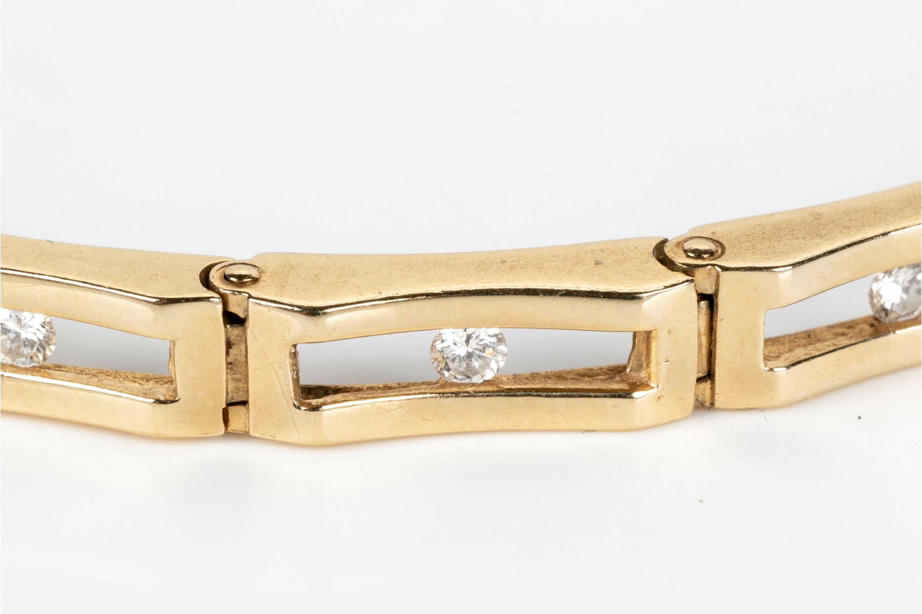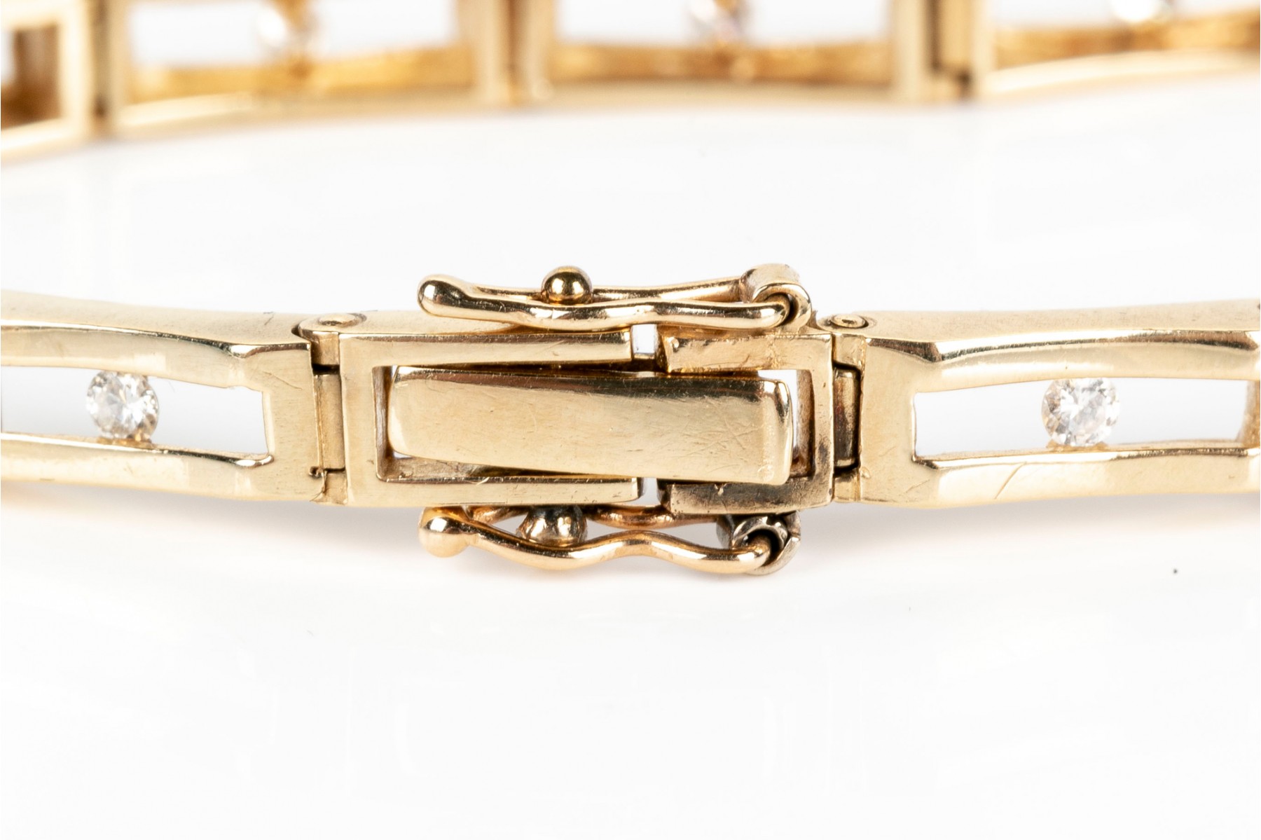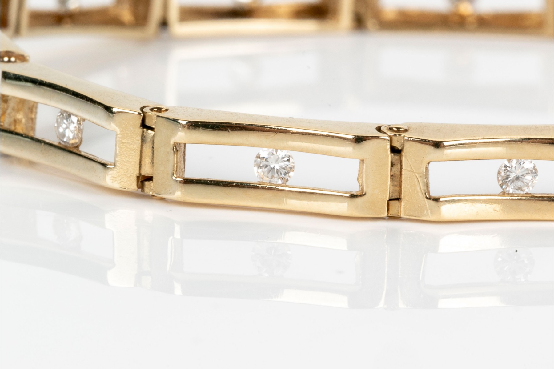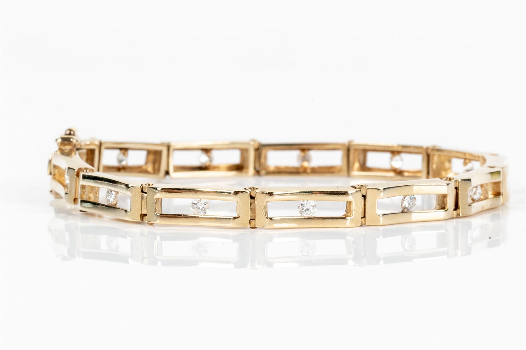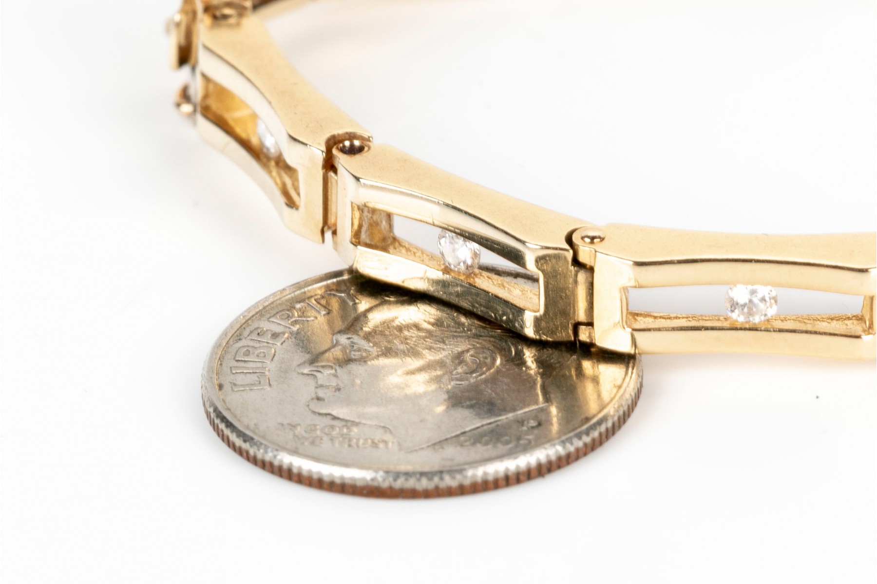 This 14K yellow gold chain link bracelet. The open style links of this bracelet are each set with a single round brilliant cut diamond, approximately 0.43 TCW. The bracelet secures with a hidden latch style clasp with two safety latches.