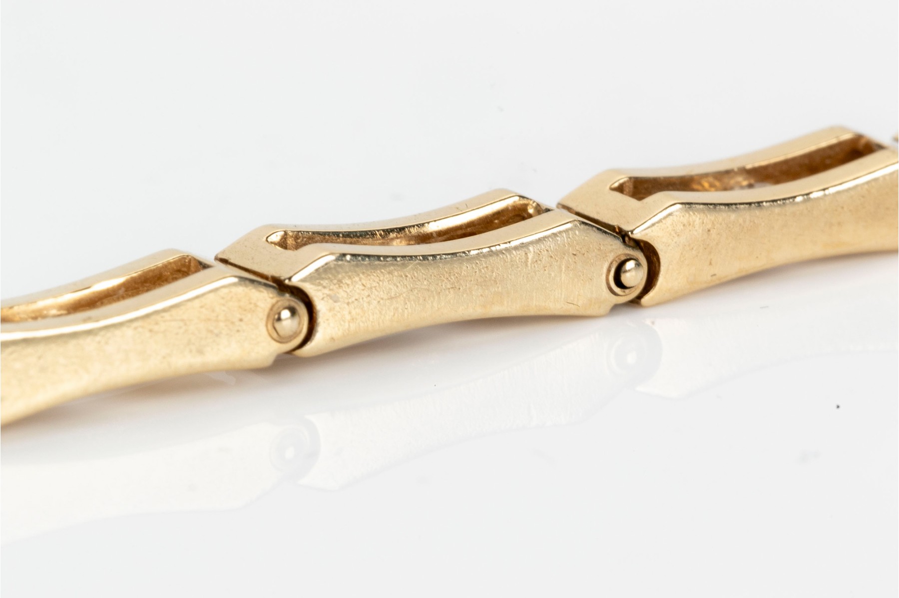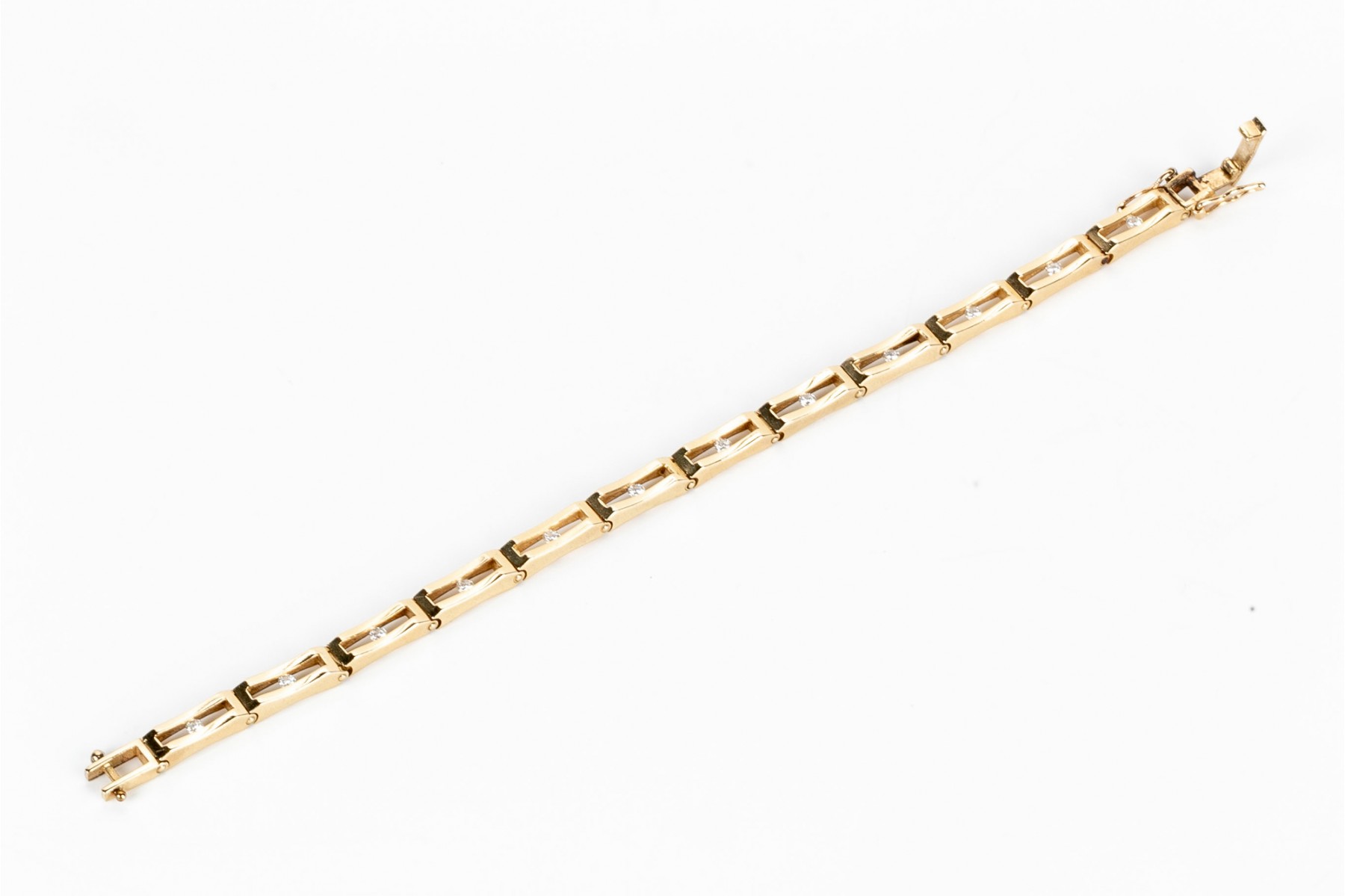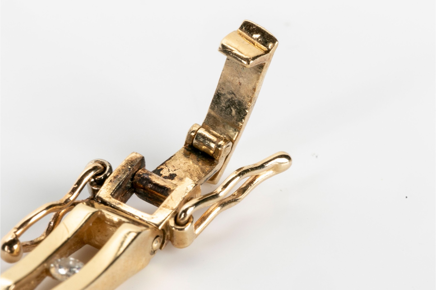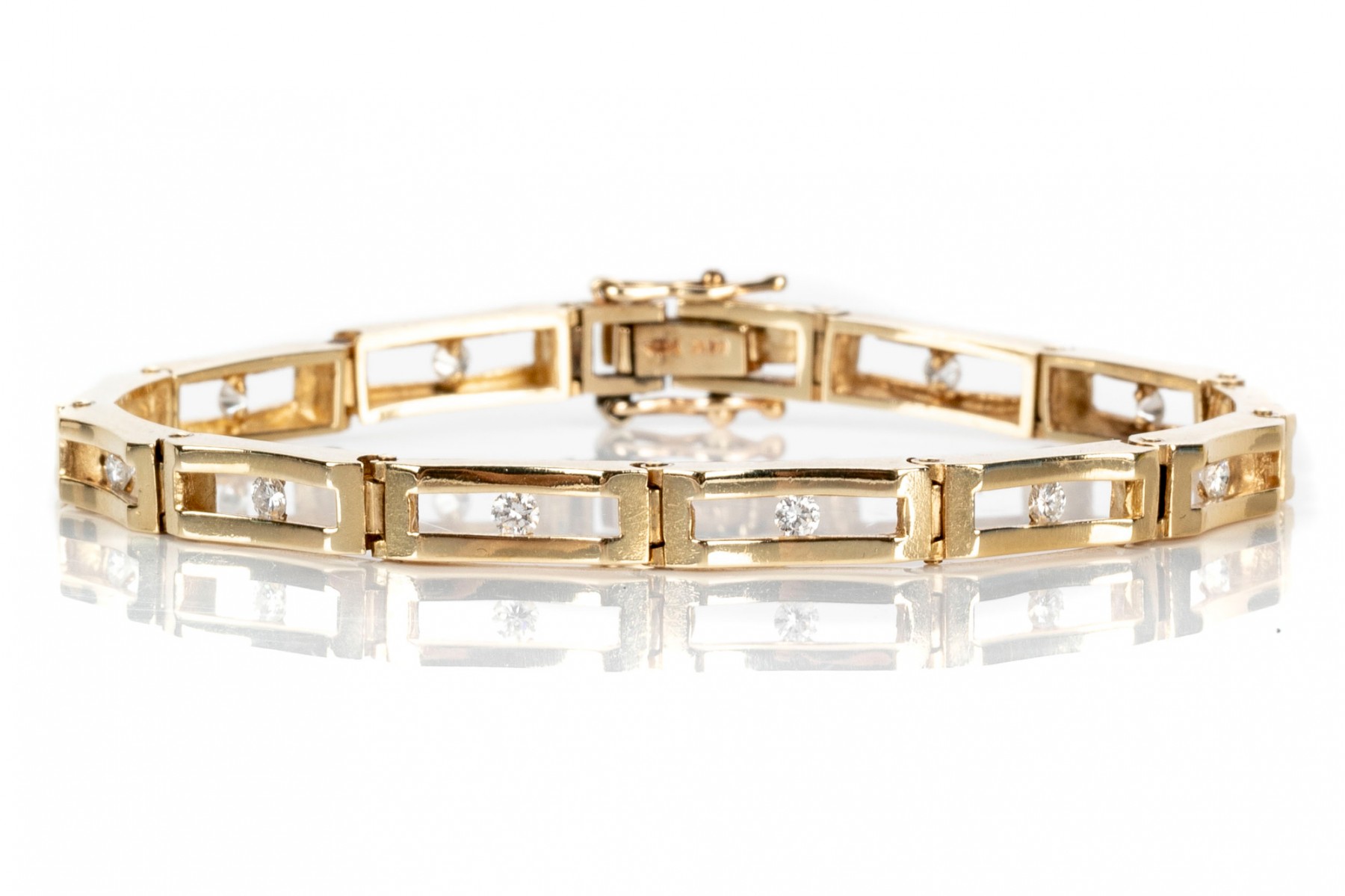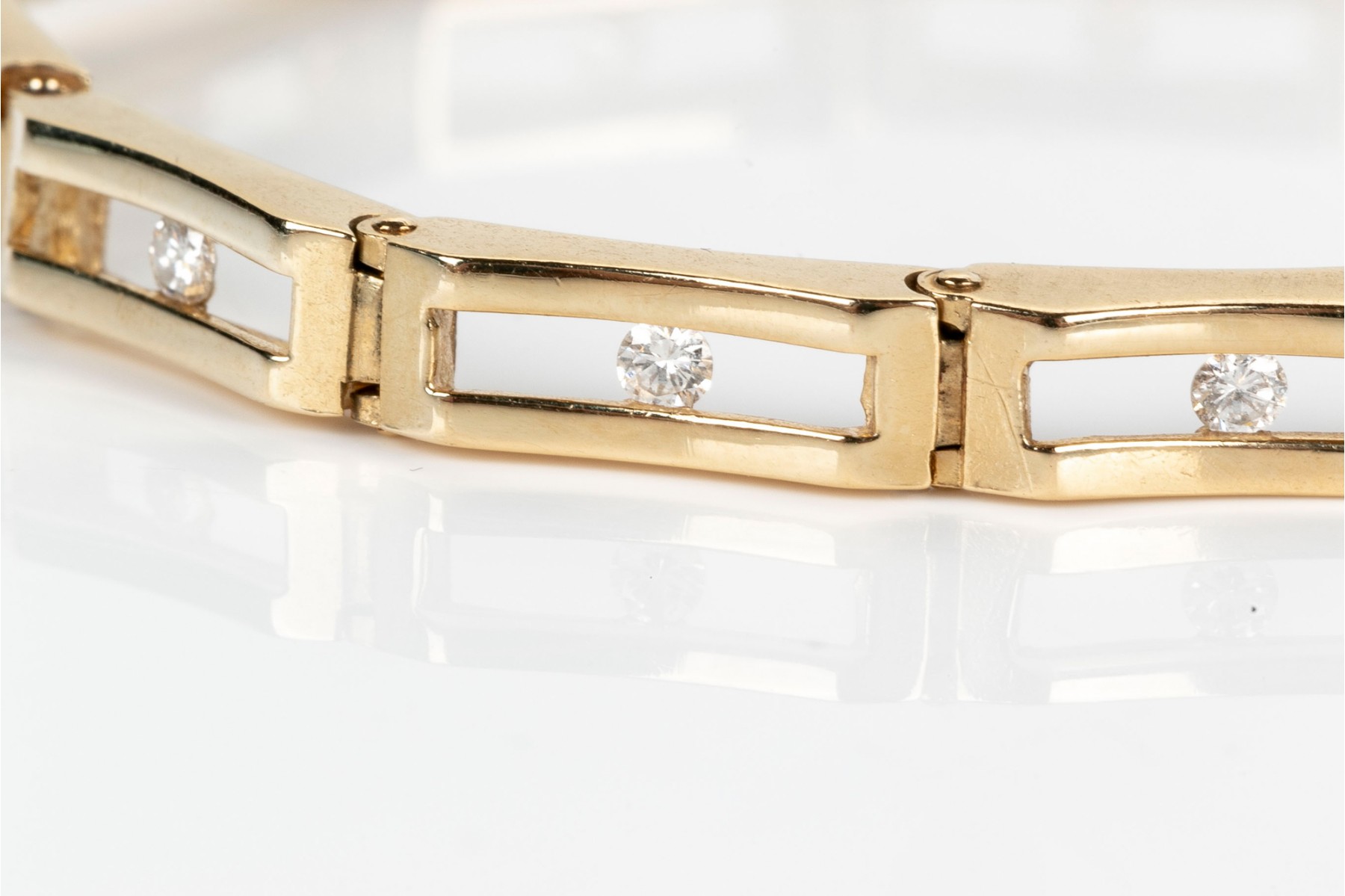 This 14K yellow gold chain link bracelet. The open style links of this bracelet are each set with a single round brilliant cut diamond, approximately 0.43 TCW. The bracelet secures with a hidden latch style clasp with two safety latches.