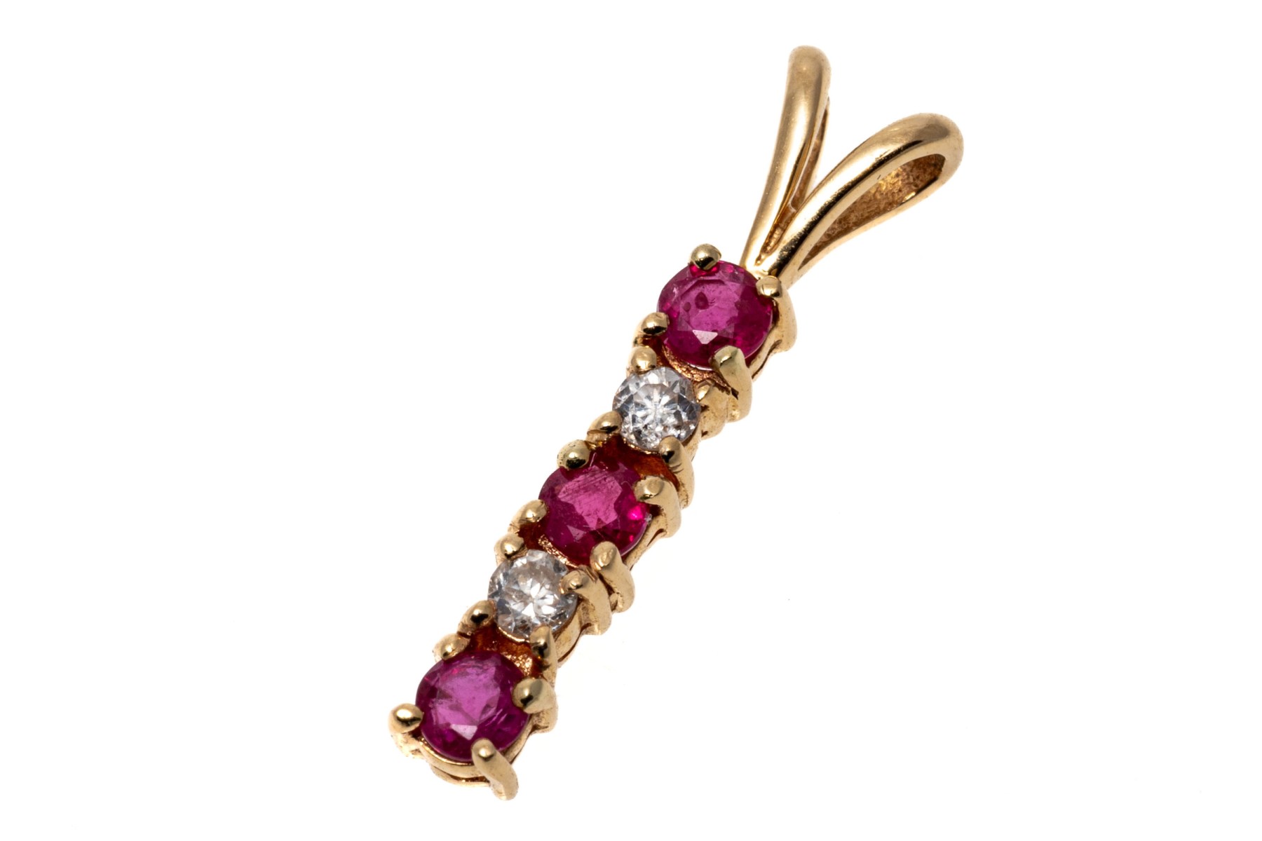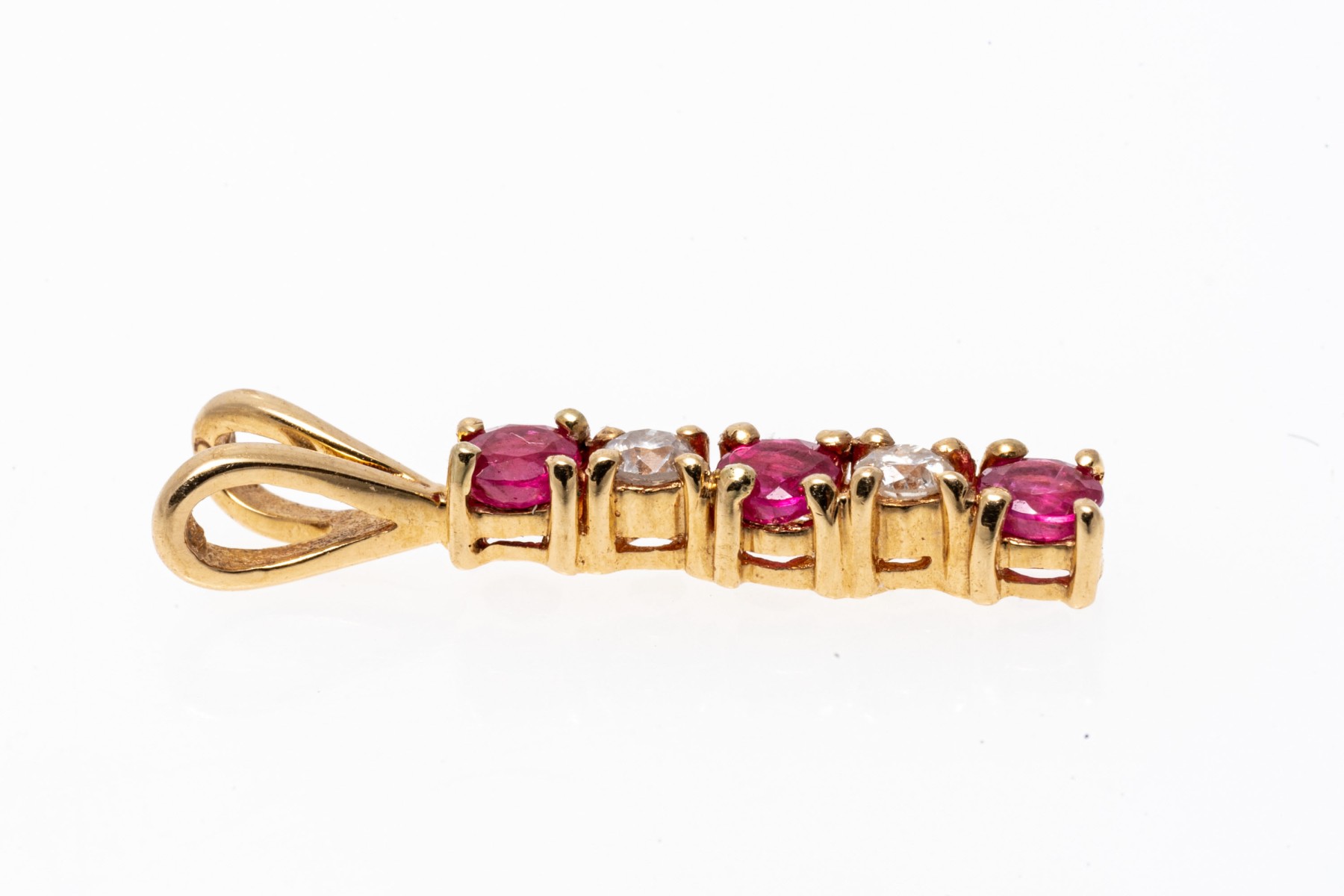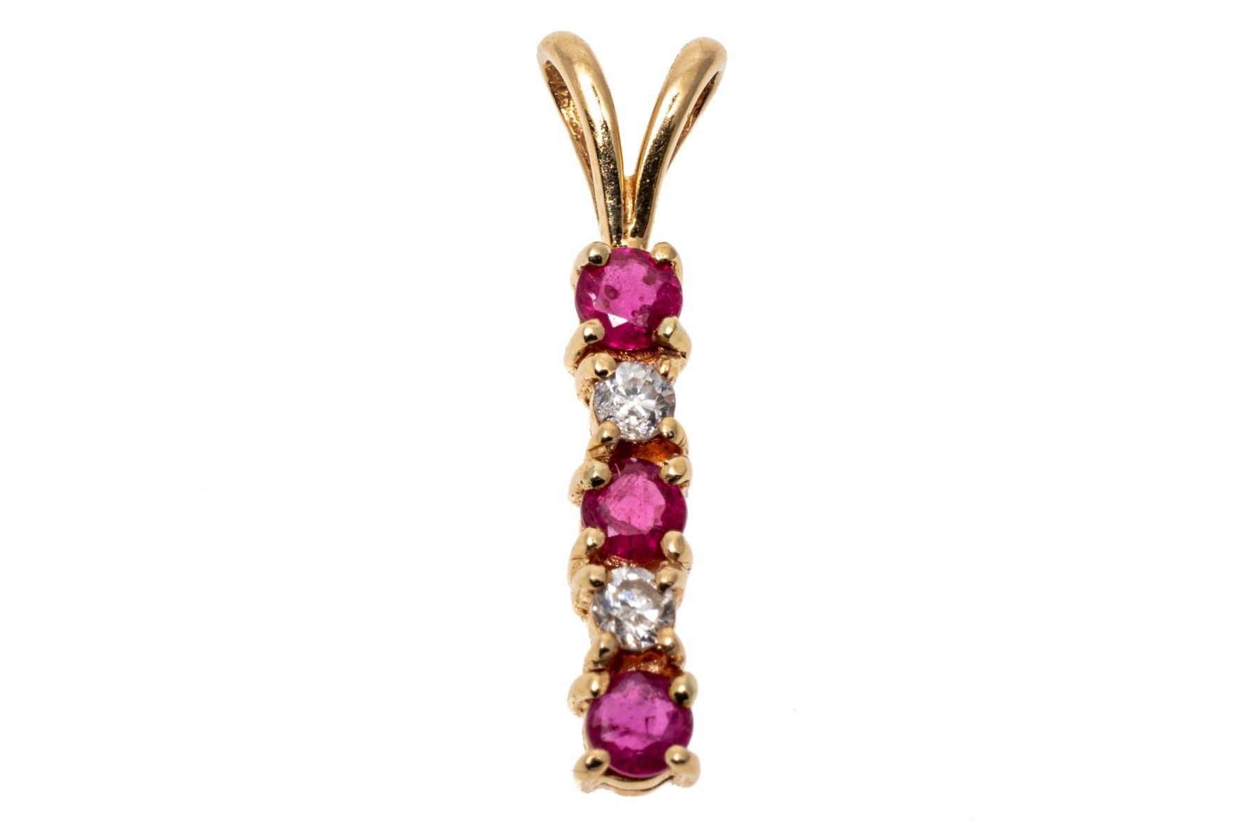 14K bar drop pendant. The pendant is set with alternating round cut rubies and diamonds. The rubies are approximately 0.17 TCW and the diamonds are approximately 0.06 TCW. Split style bale.