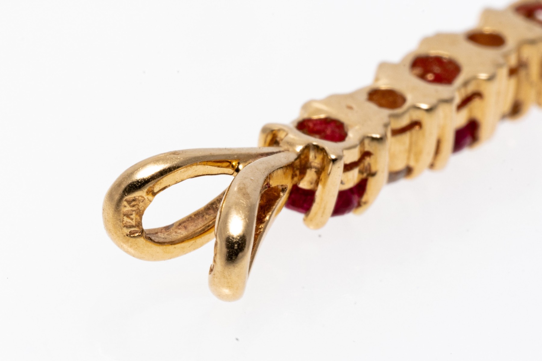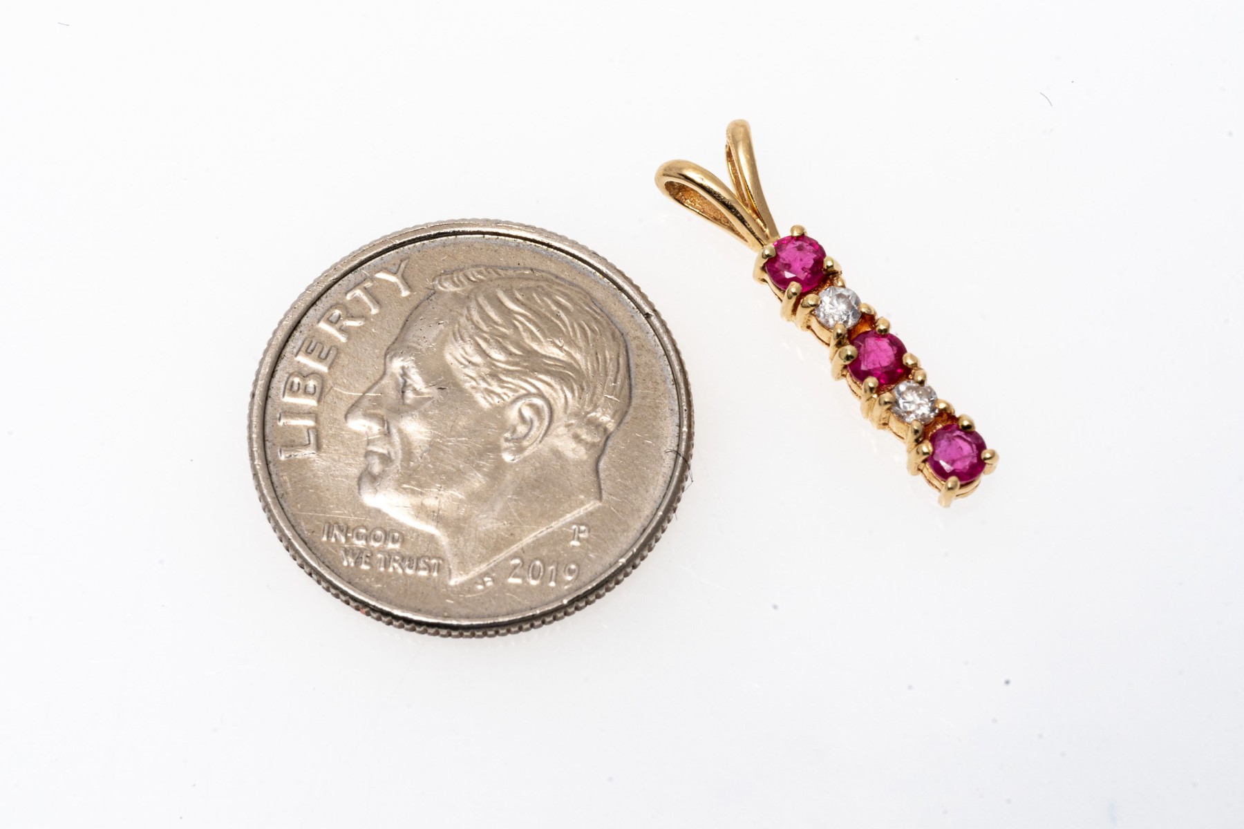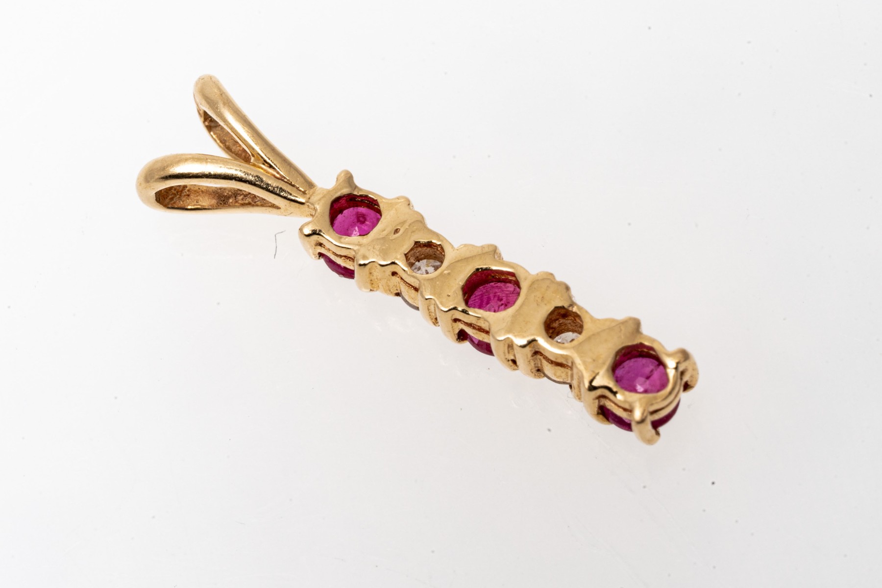 14K bar drop pendant. The pendant is set with alternating round cut rubies and diamonds. The rubies are approximately 0.17 TCW and the diamonds are approximately 0.06 TCW. Split style bale.