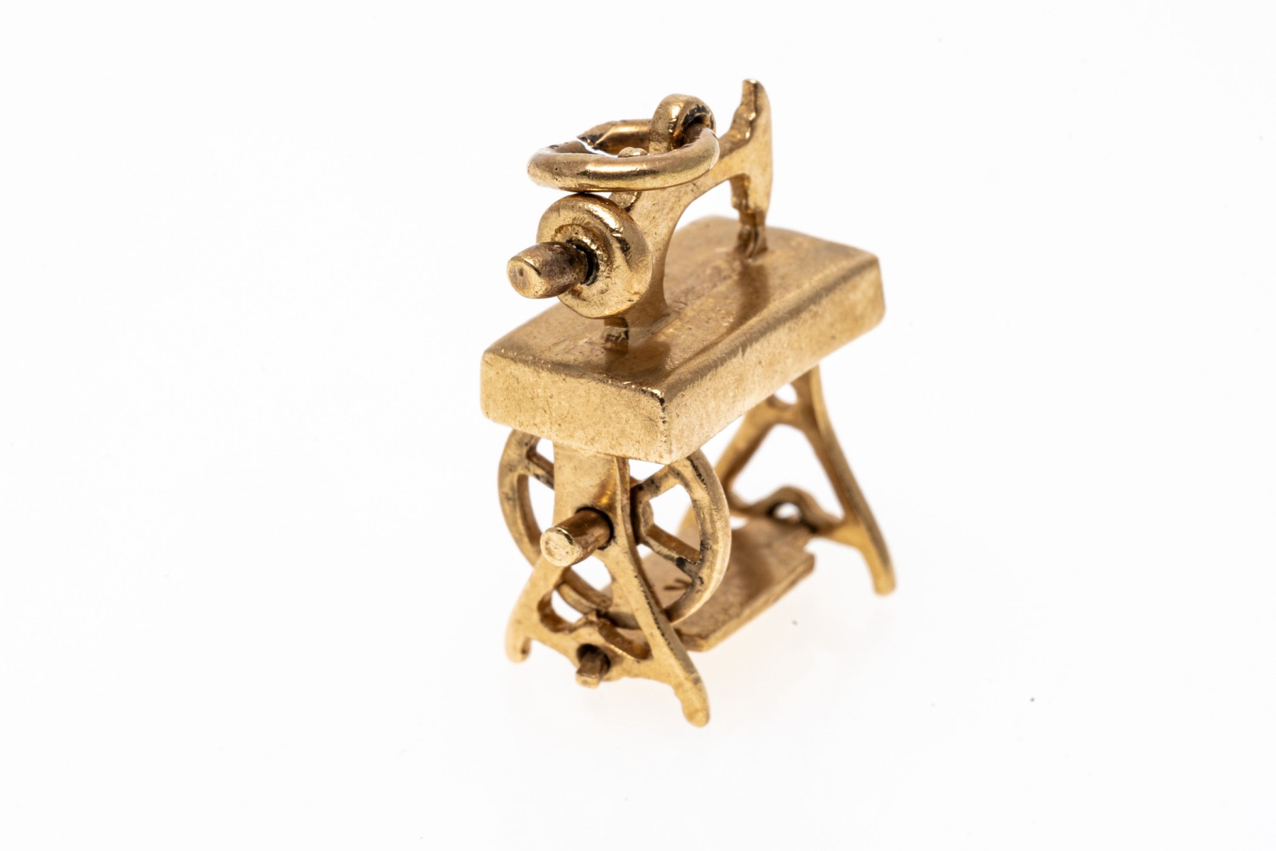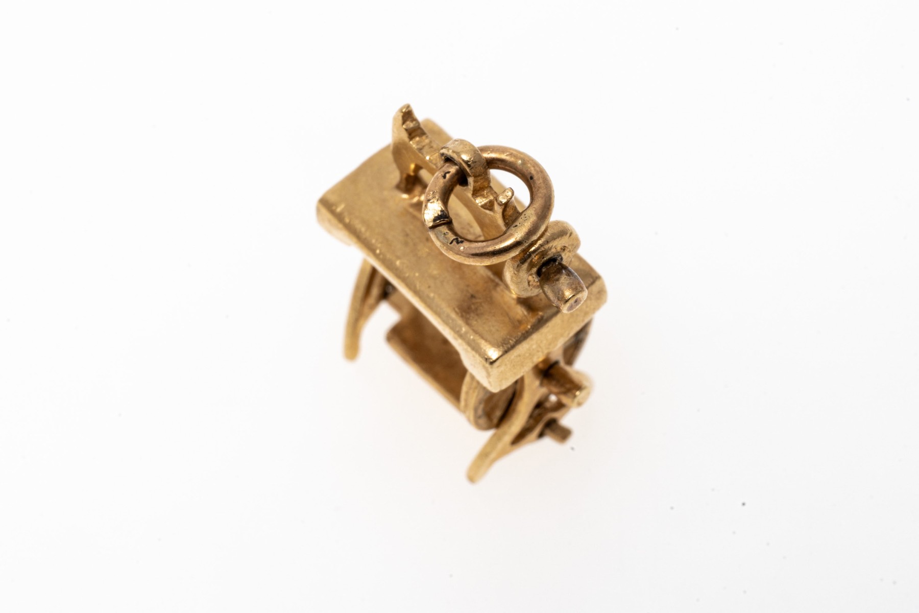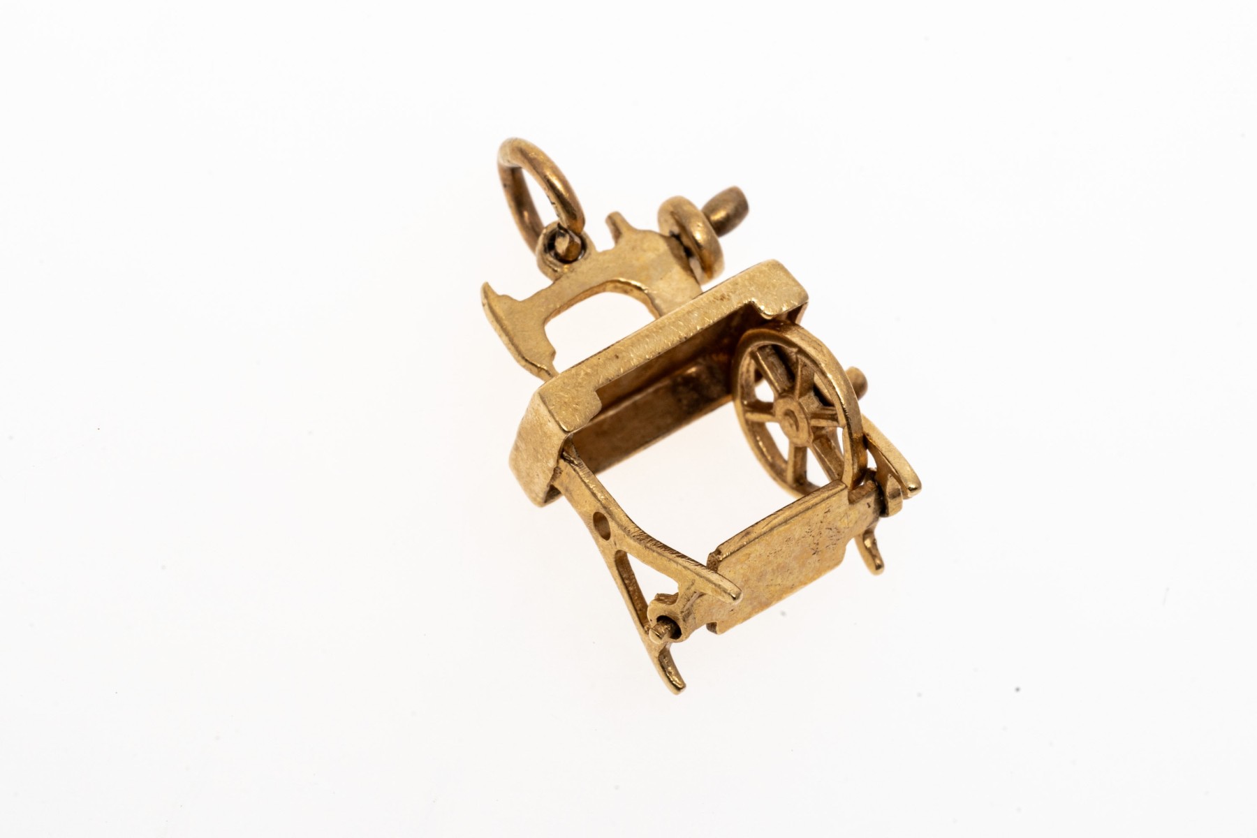 14K yellow gold charm pendant. This dainty charm has been crafted in the form of a sewing machine.