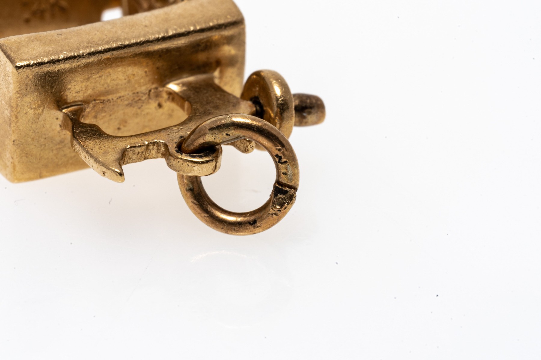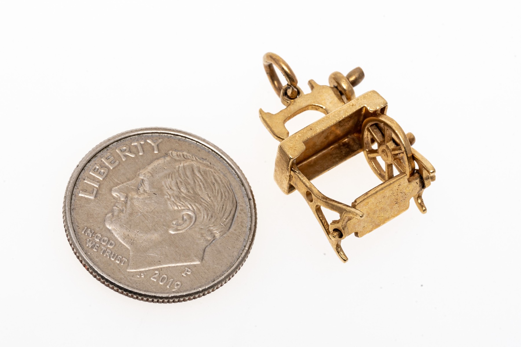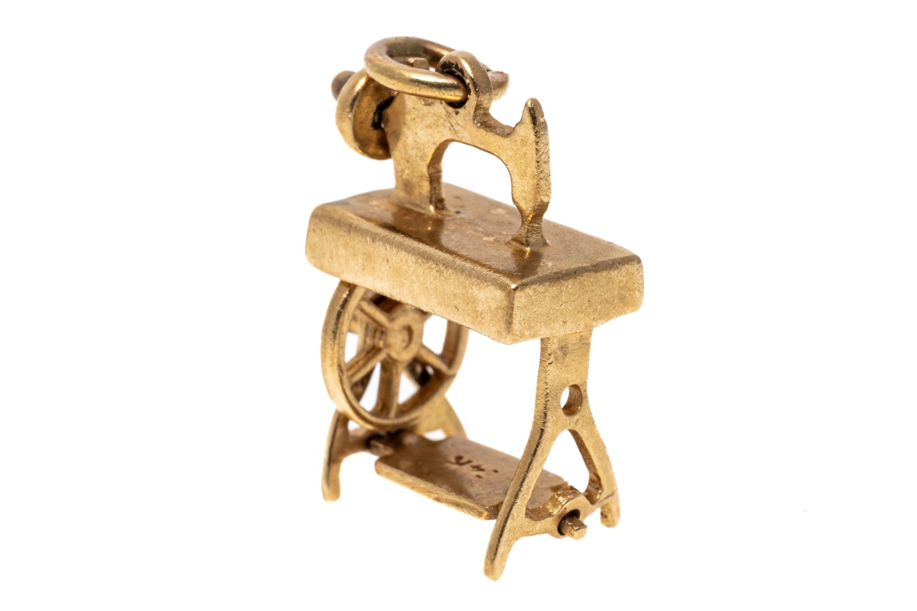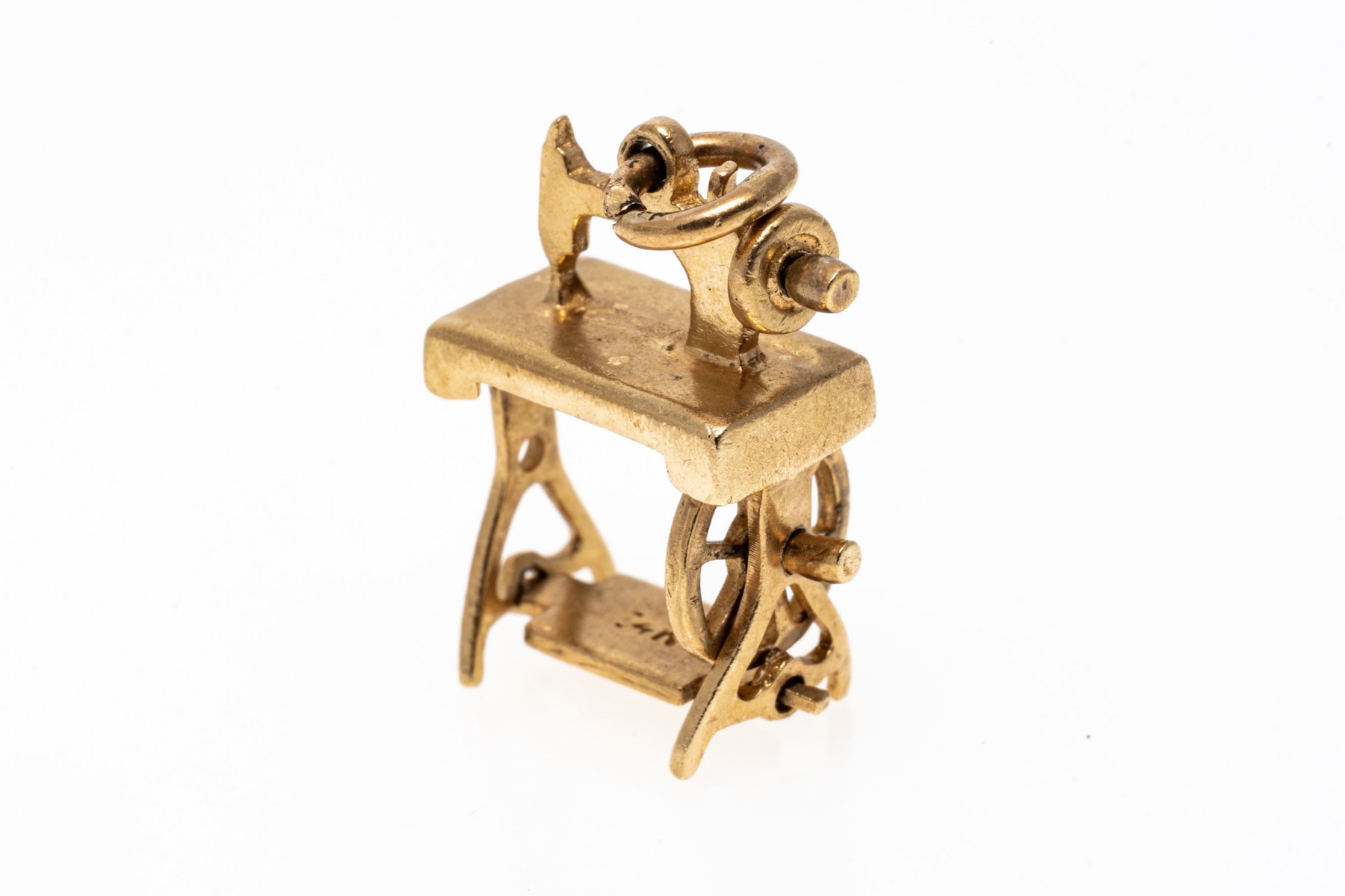 14K yellow gold charm pendant. This dainty charm has been crafted in the form of a sewing machine.