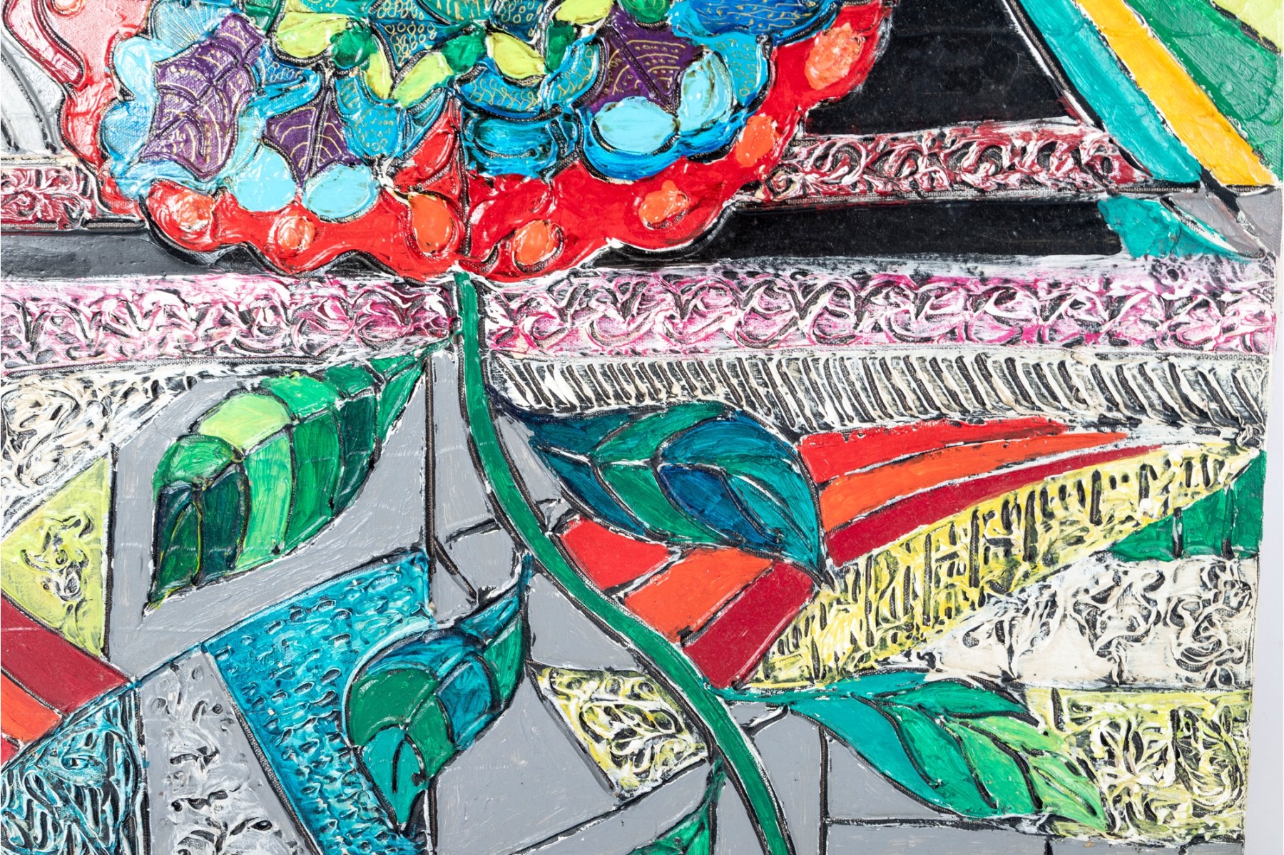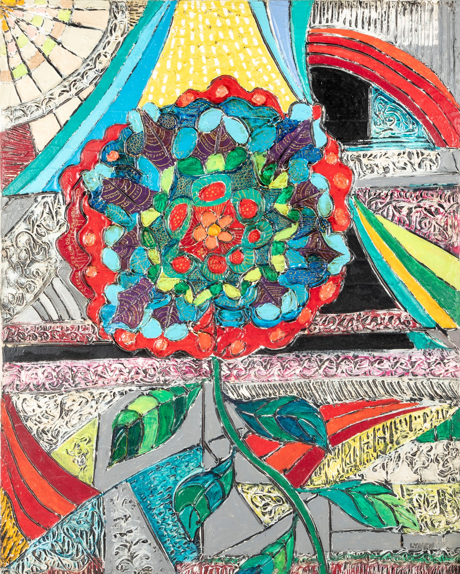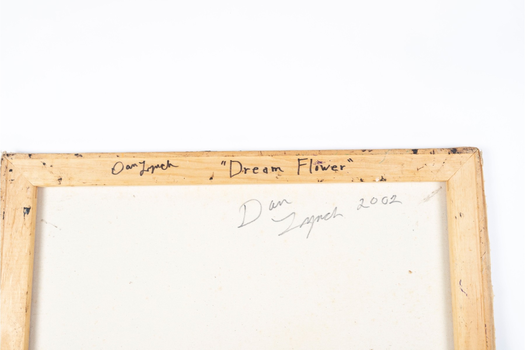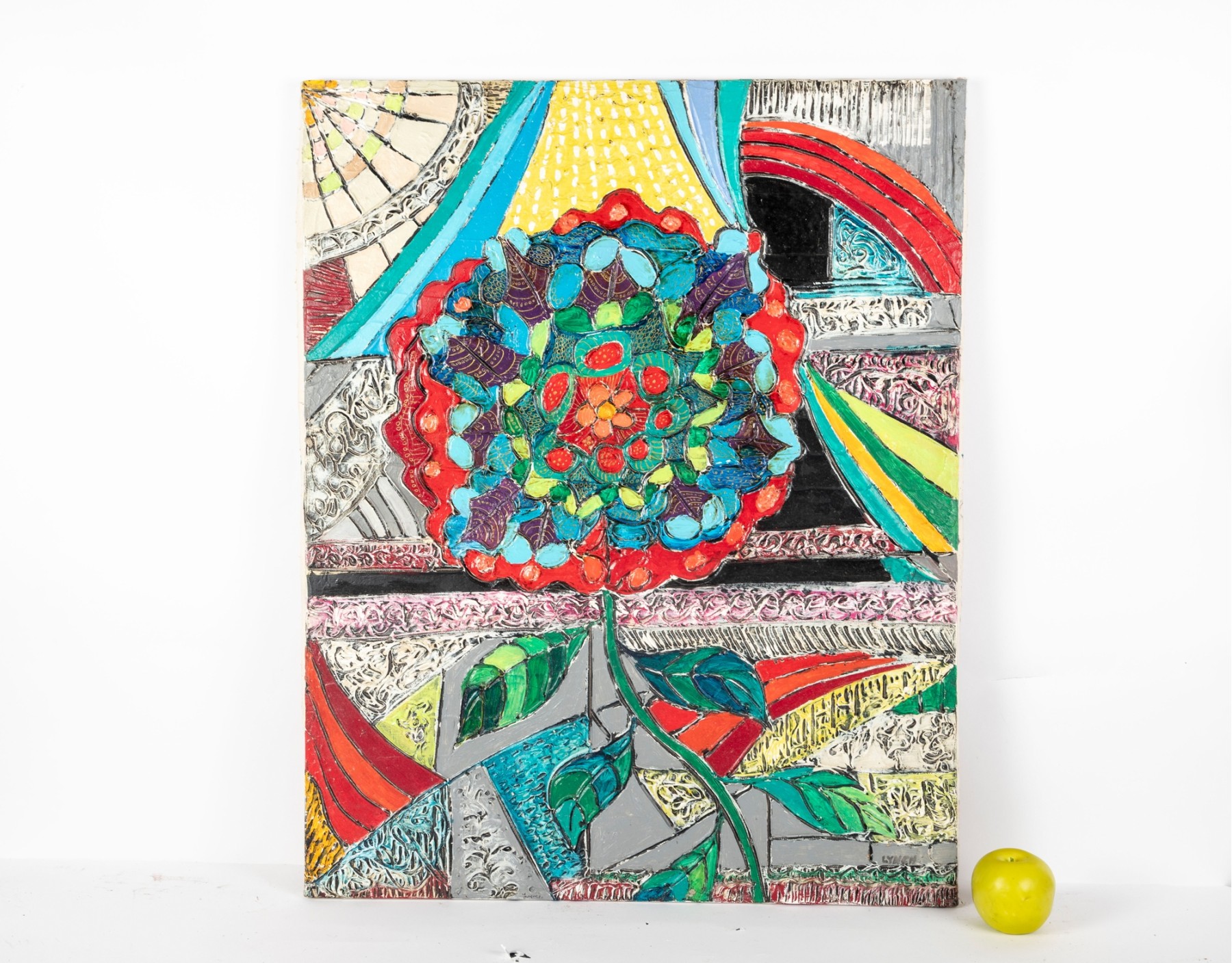 Dan Lynch (American [SC], 1930-2019) "Dream Flower" mixed media on canvas depicting an abstracted scene of a large, ornately patterned polychrome flower on a winding stem over a textural and vibrant background. Signed lower right and on the verso with the title. The canvas is mounted to a stretcher, unframed.