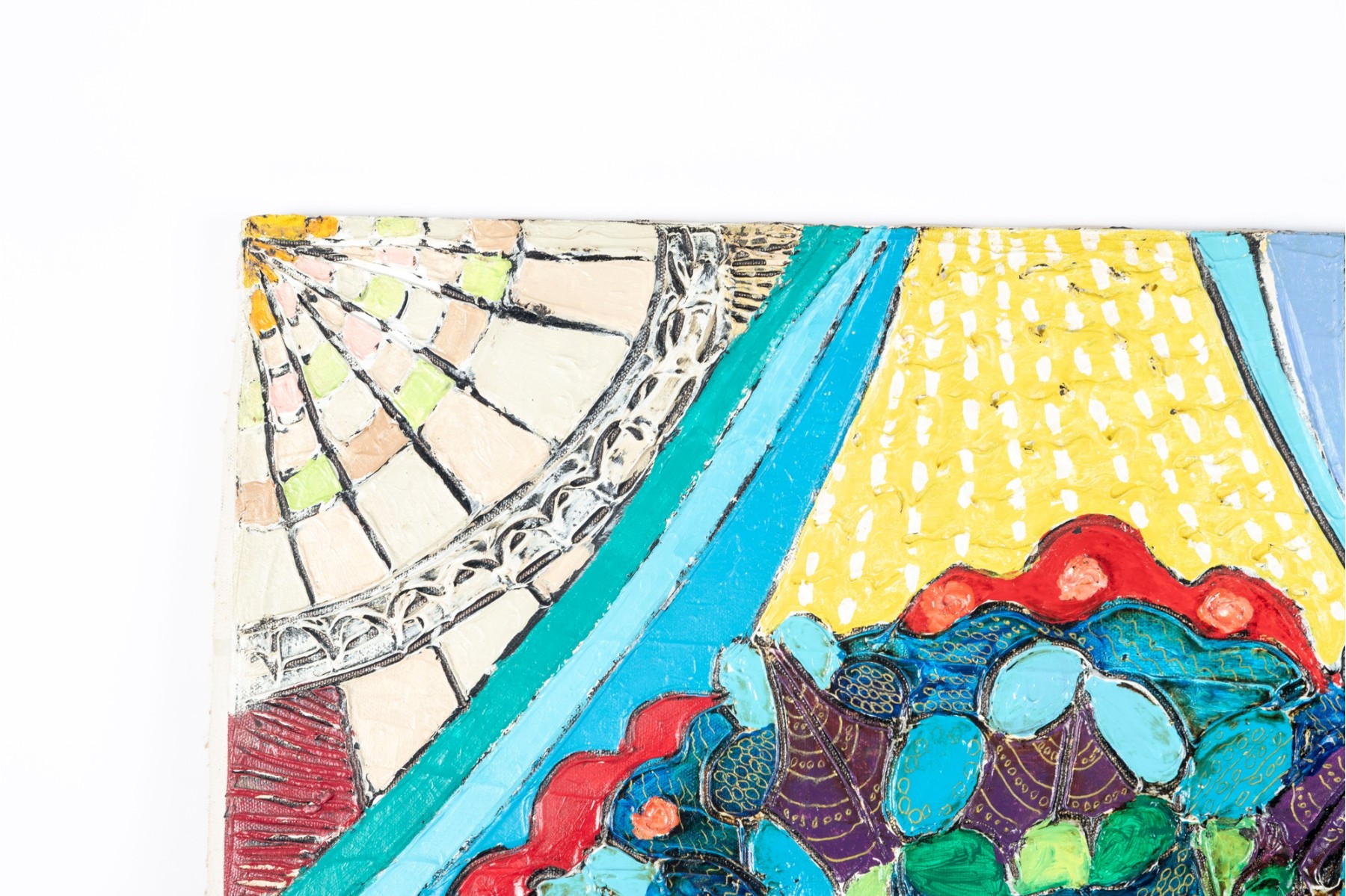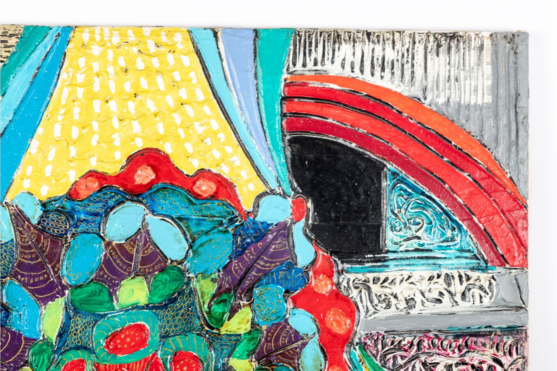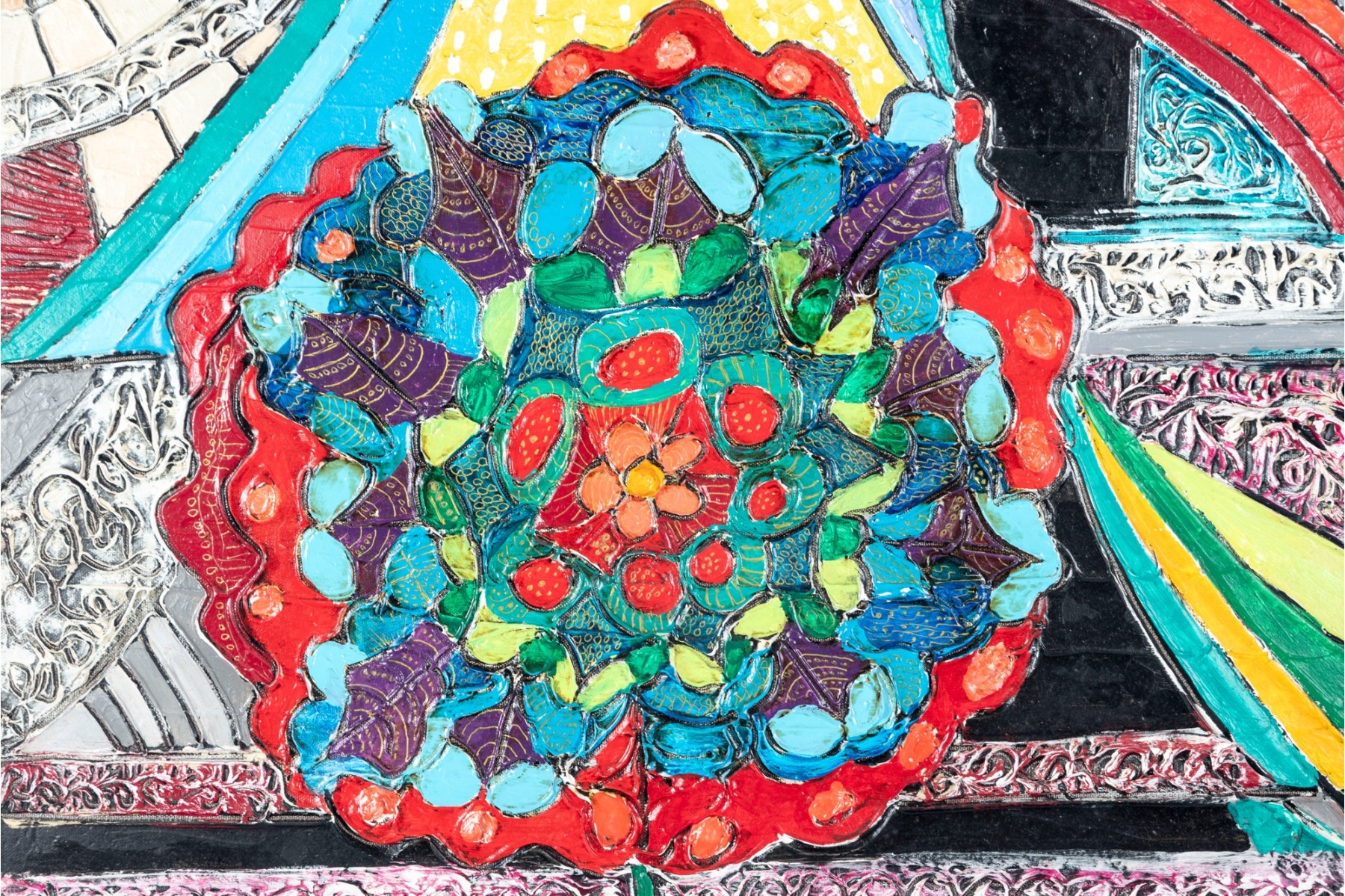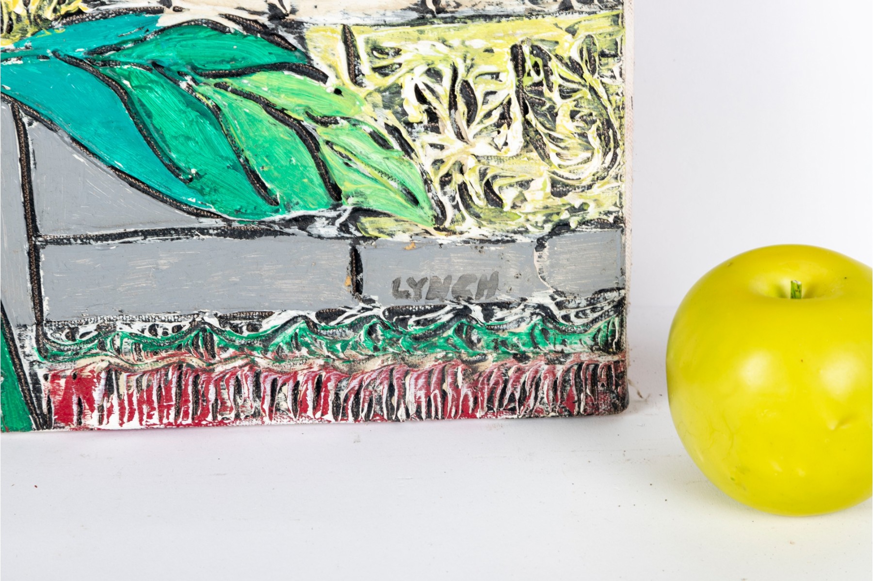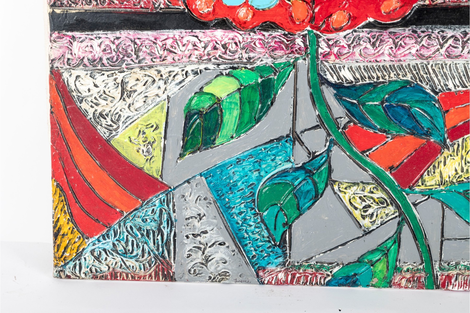 Dan Lynch (American [SC], 1930-2019) "Dream Flower" mixed media on canvas depicting an abstracted scene of a large, ornately patterned polychrome flower on a winding stem over a textural and vibrant background. Signed lower right and on the verso with the title. The canvas is mounted to a stretcher, unframed.