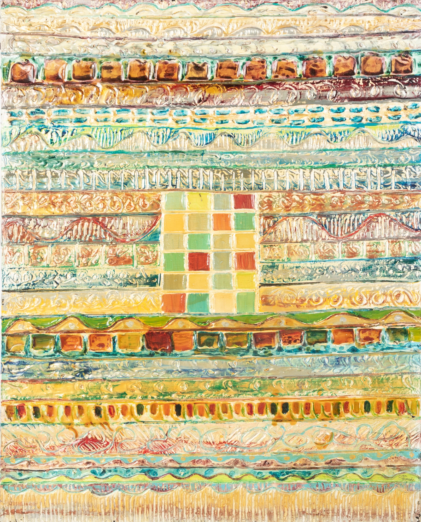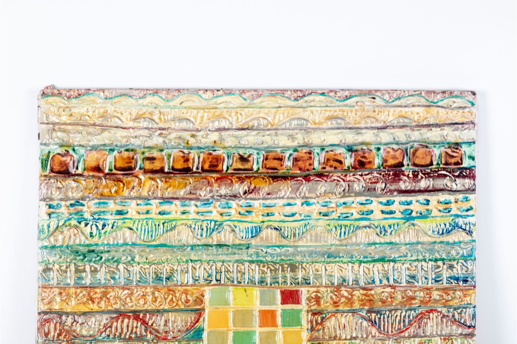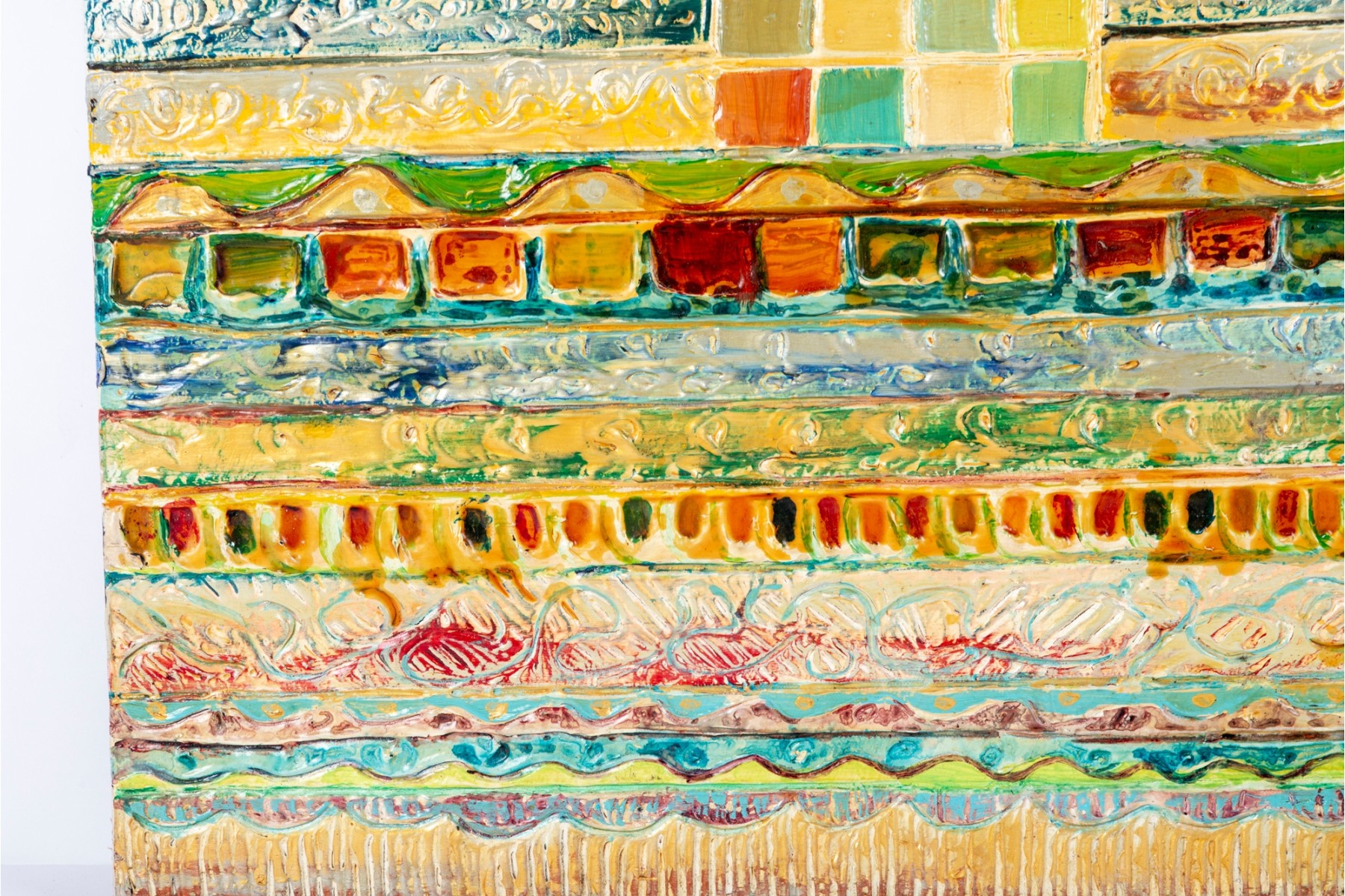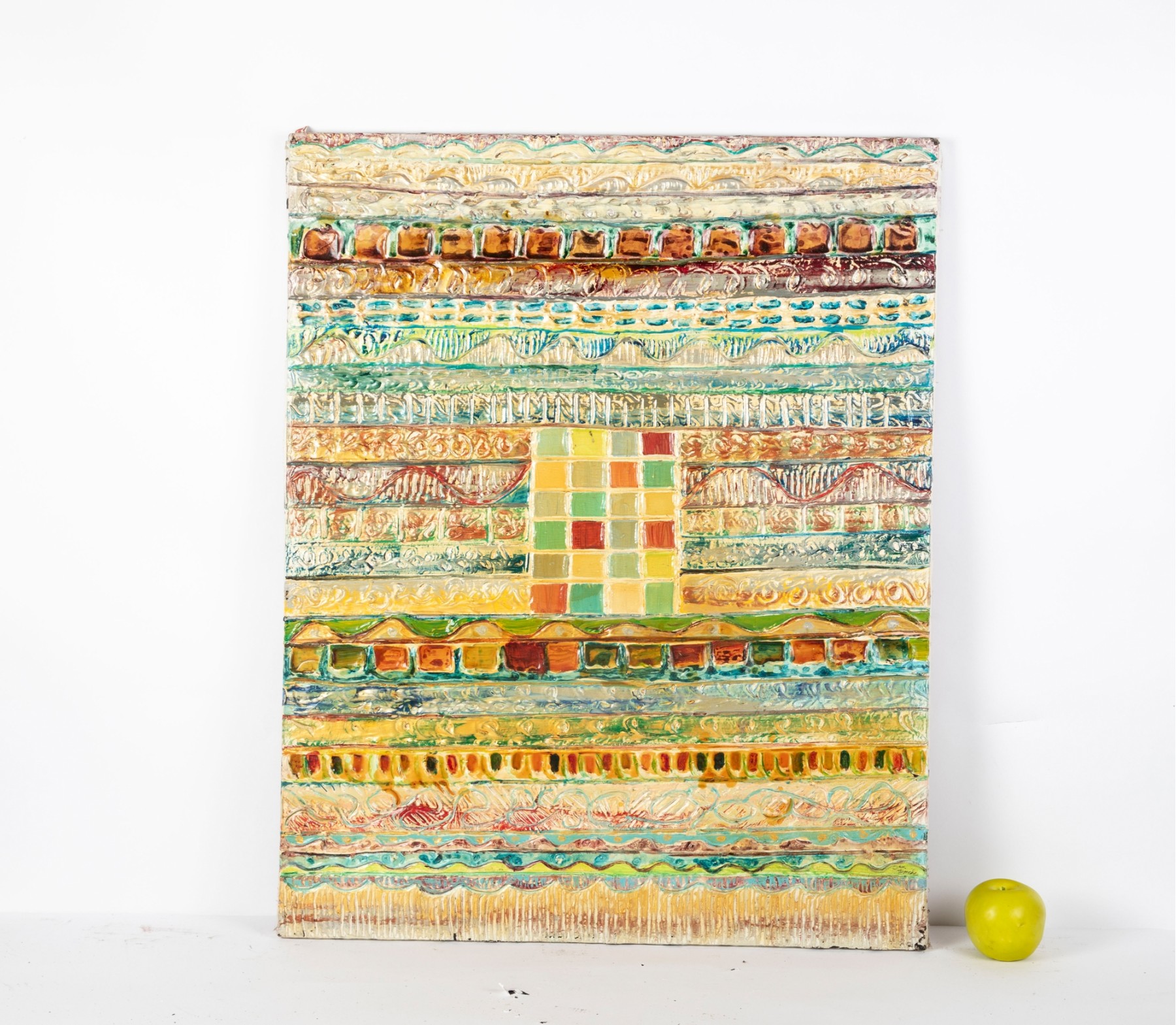 Dan Lynch (American [SC], 1930-2019) "Etched in Time" mixed media on canvas depicting an abstract composition with a checkered rectangular form at the center of horizontal striations with excellent texture in beautiful orange, blue, yellow, and green. Signed lower right and on the verso with the title. The canvas is mounted to a stretcher, unframed.