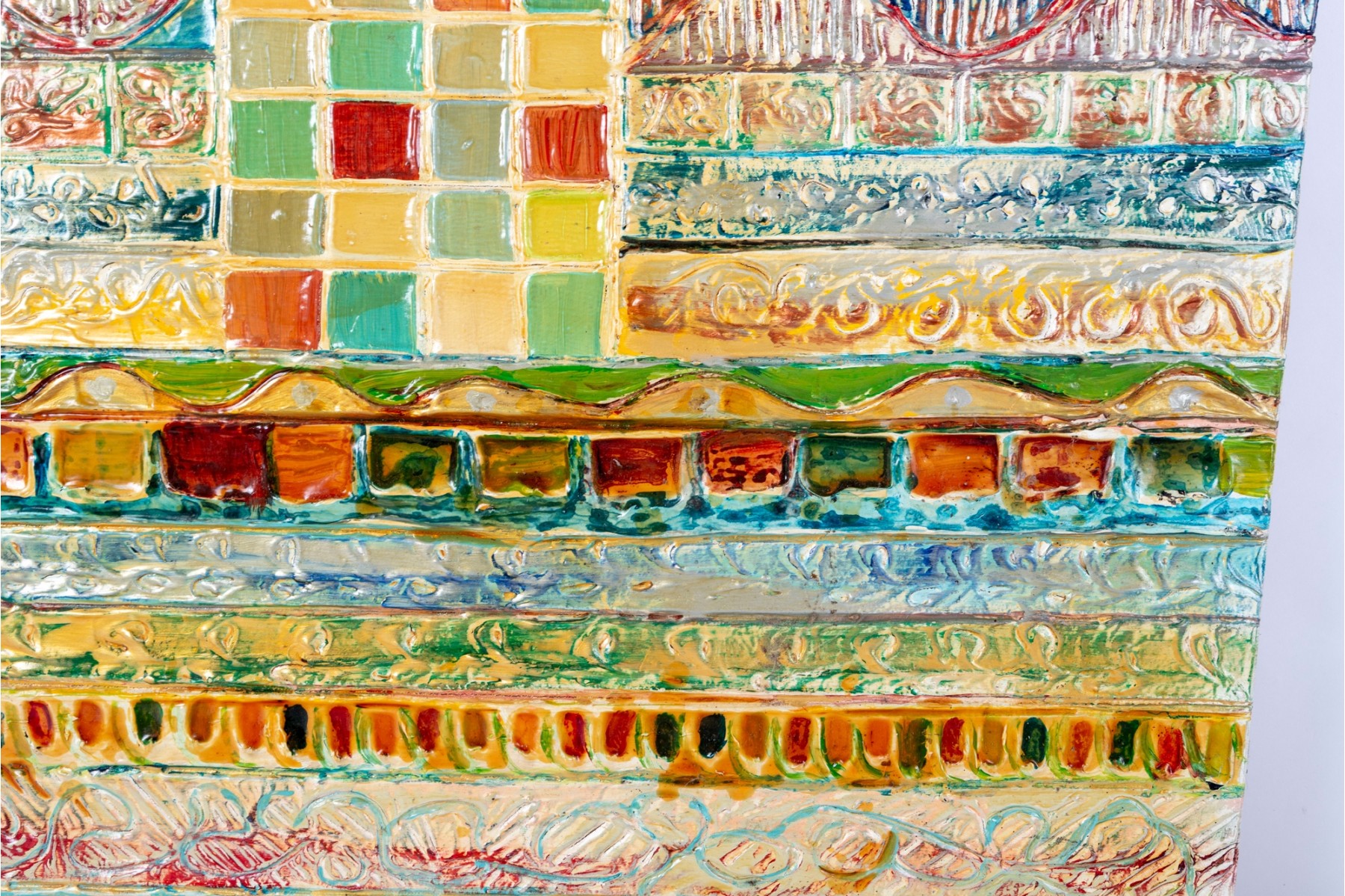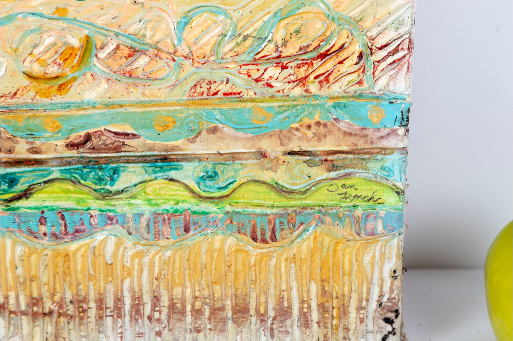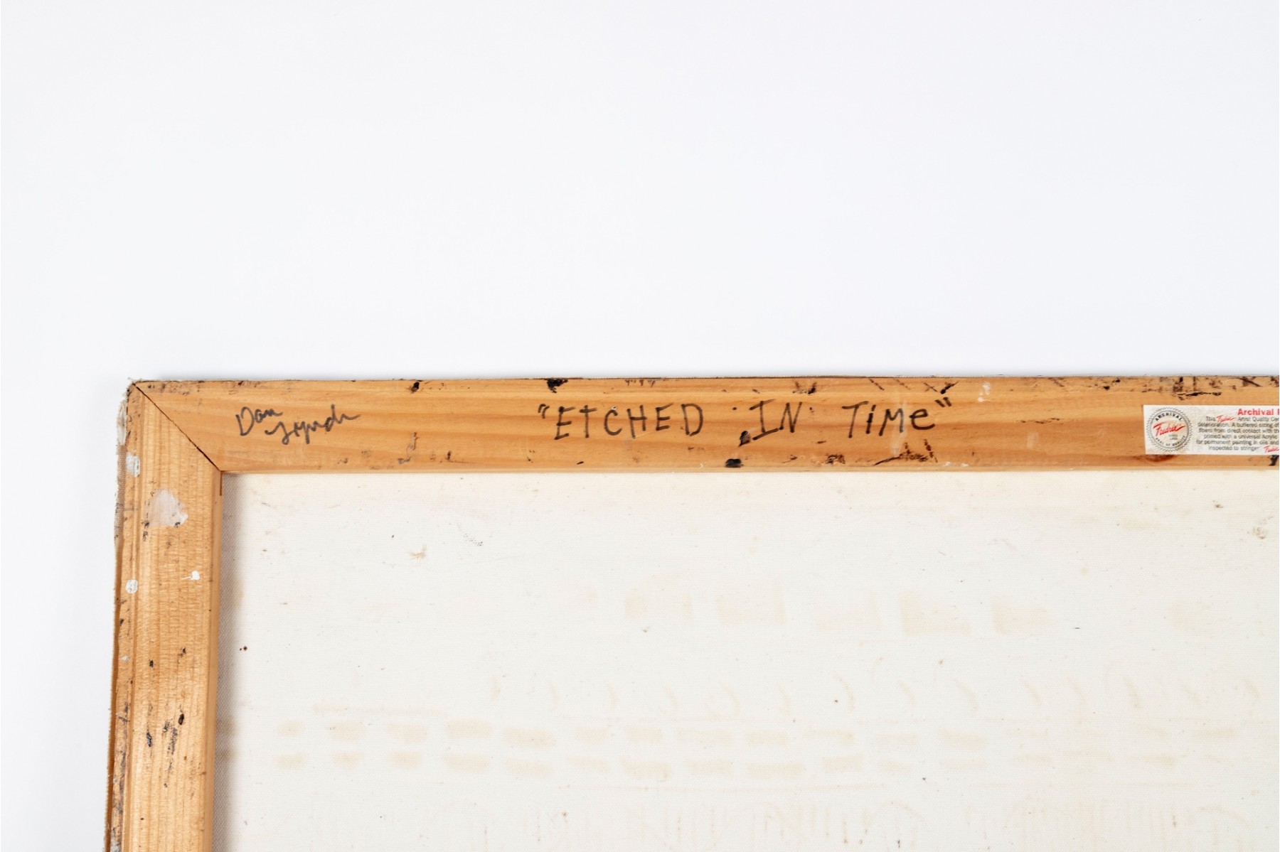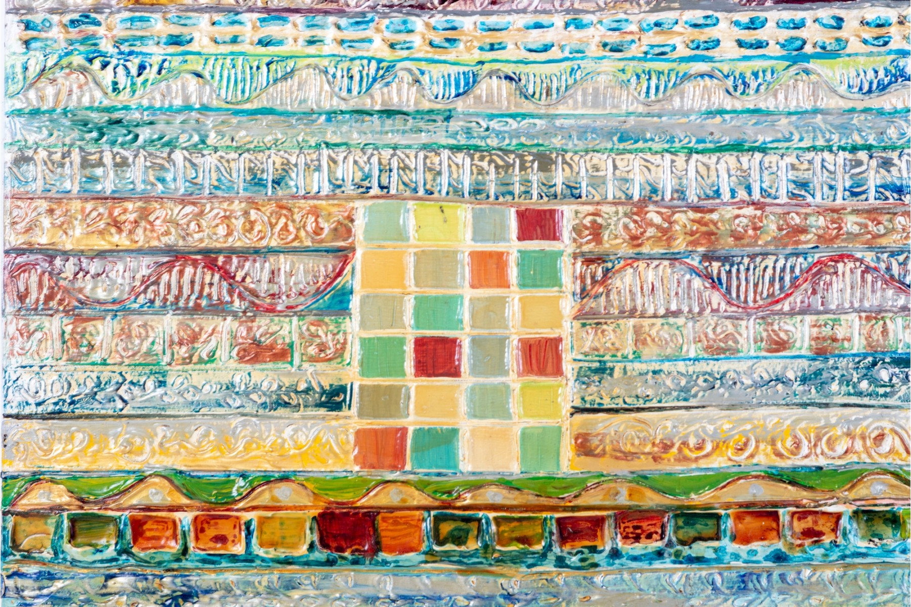 Dan Lynch (American [SC], 1930-2019) "Etched in Time" mixed media on canvas depicting an abstract composition with a checkered rectangular form at the center of horizontal striations with excellent texture in beautiful orange, blue, yellow, and green. Signed lower right and on the verso with the title. The canvas is mounted to a stretcher, unframed.