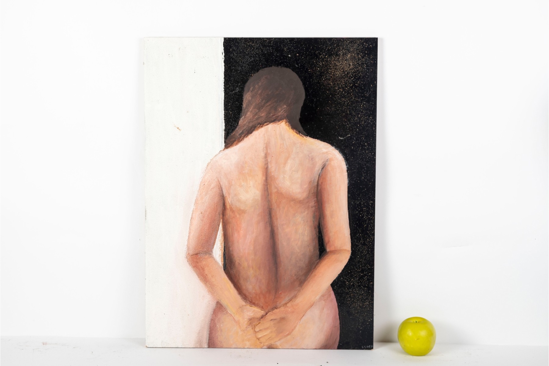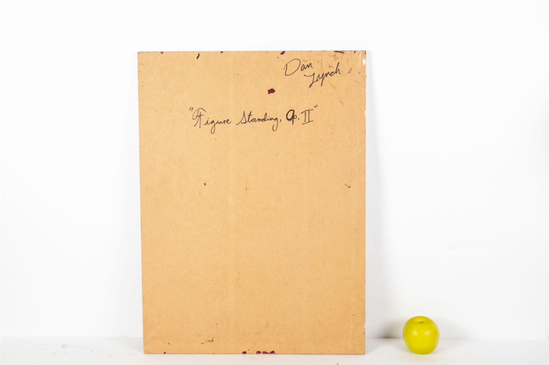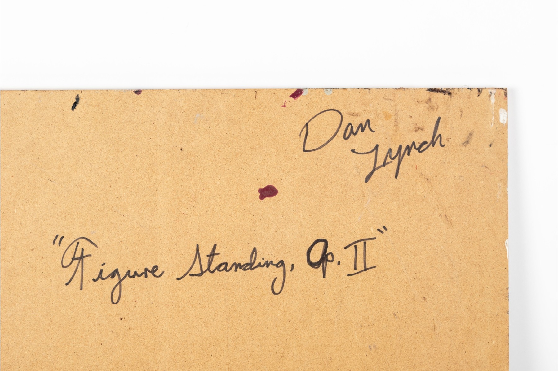 Dan Lynch (American [SC], 1930-2019) "Figure Standing, Op. II" oil painting on board depicting a female nude posed clasping hands behind her back, facing away from the viewer with long brunette hair against a black and white background. Signed lower right and on the verso with the title. Unframed.