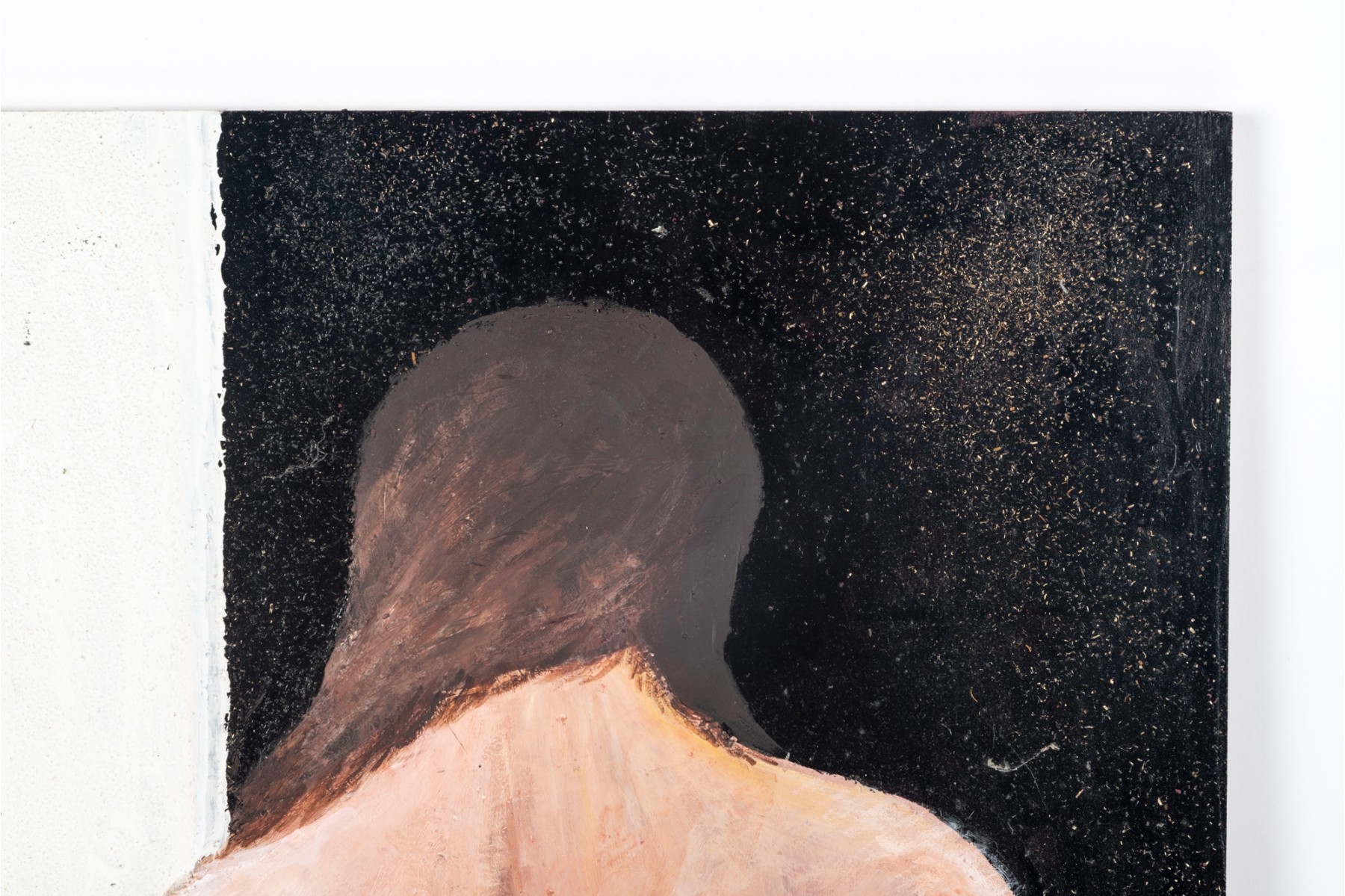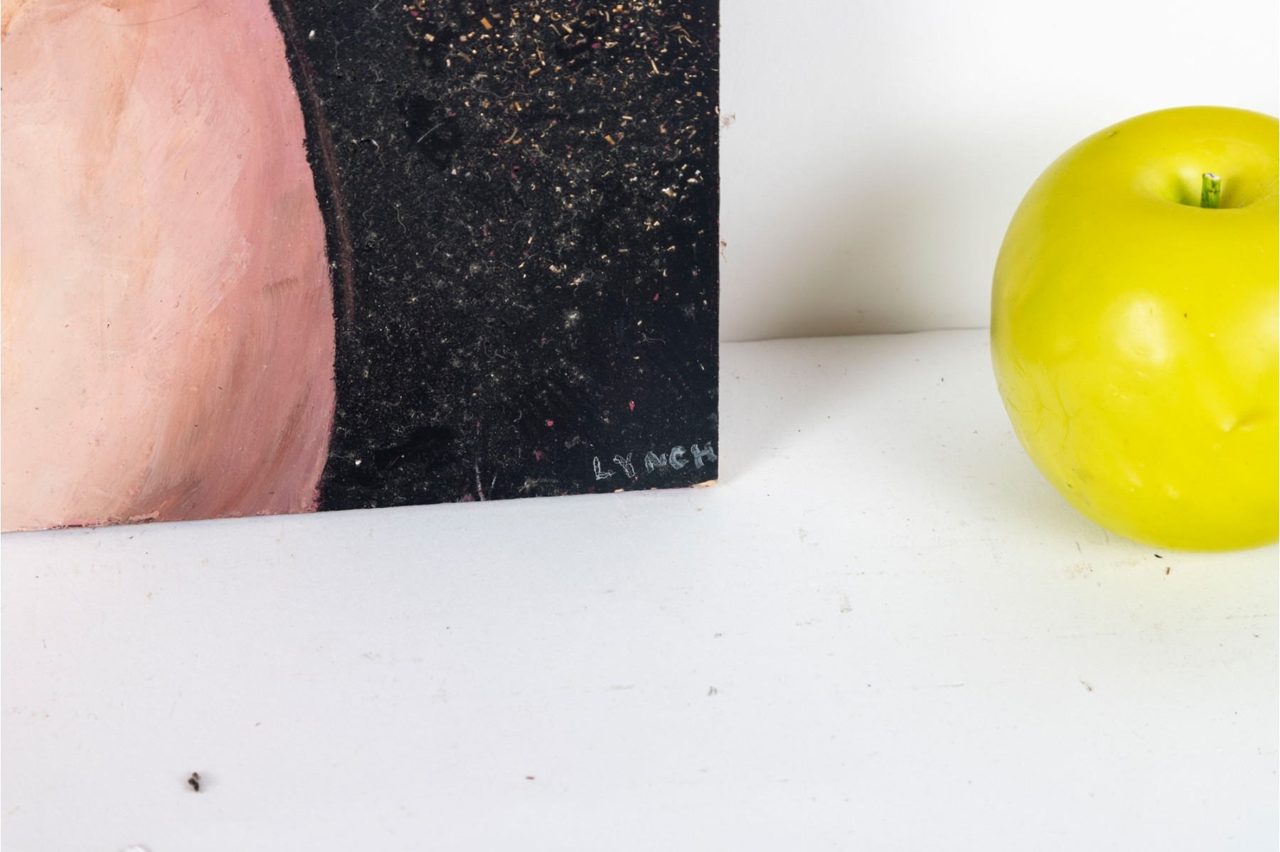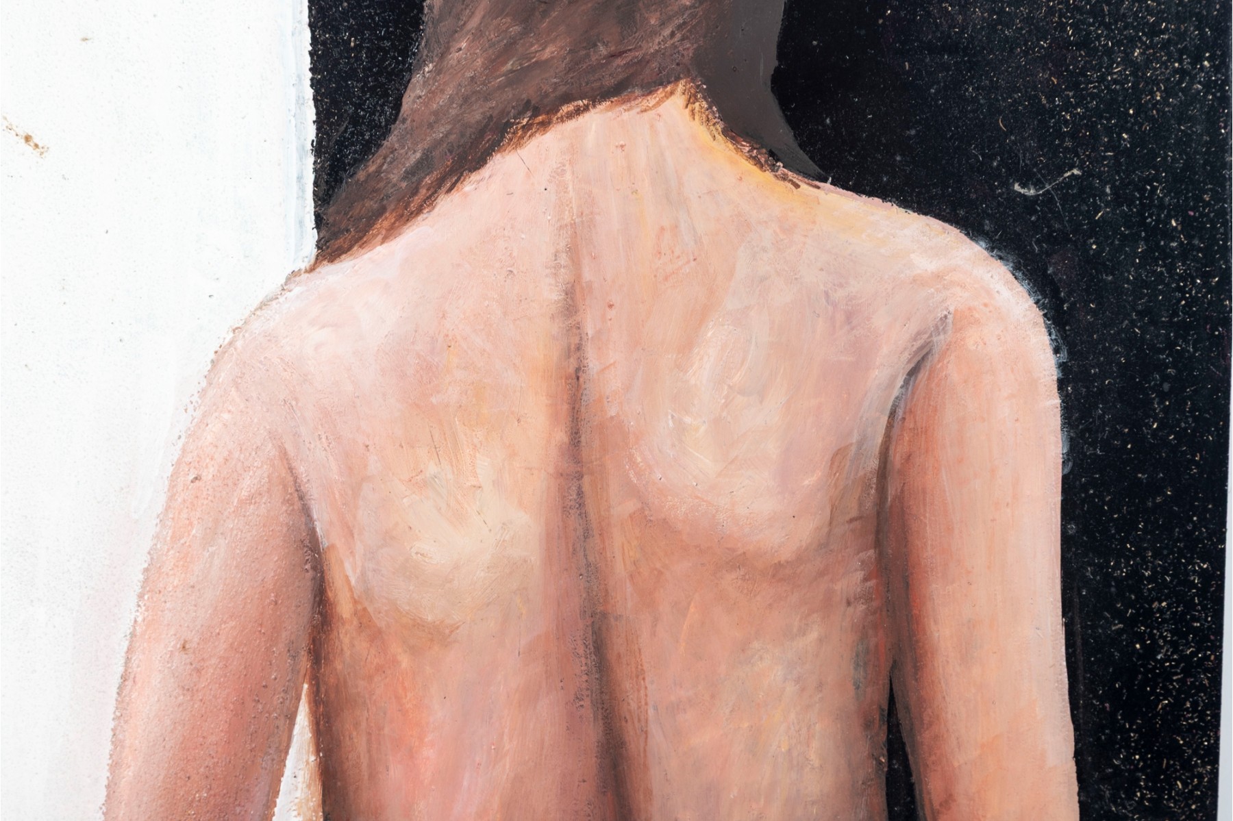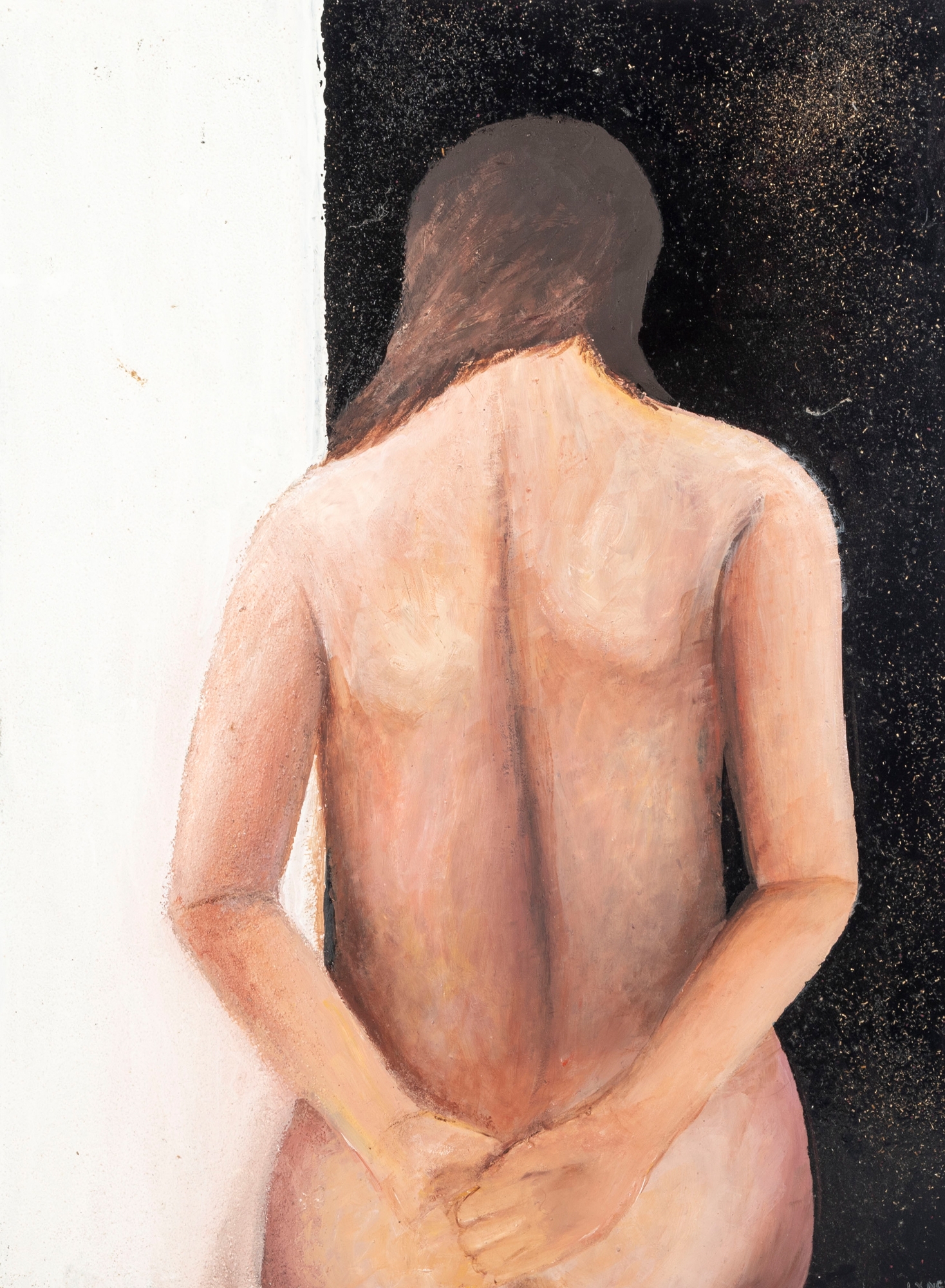 Dan Lynch (American [SC], 1930-2019) "Figure Standing, Op. II" oil painting on board depicting a female nude posed clasping hands behind her back, facing away from the viewer with long brunette hair against a black and white background. Signed lower right and on the verso with the title. Unframed.
