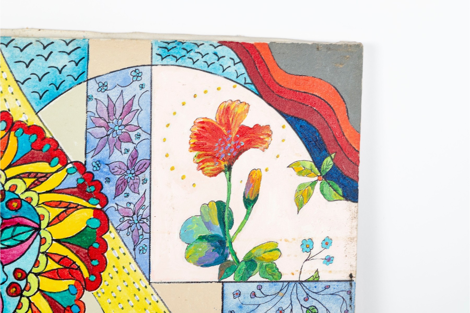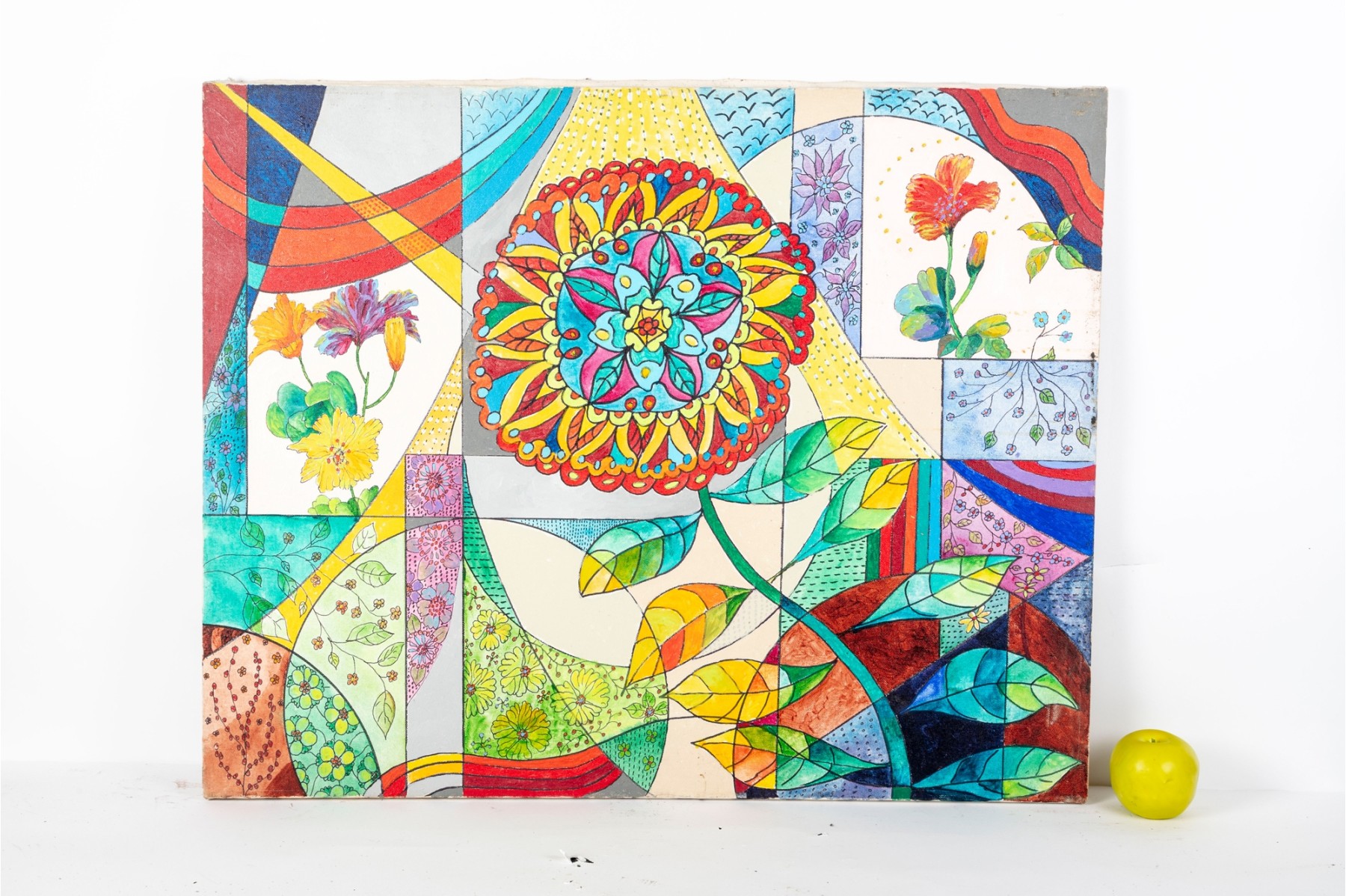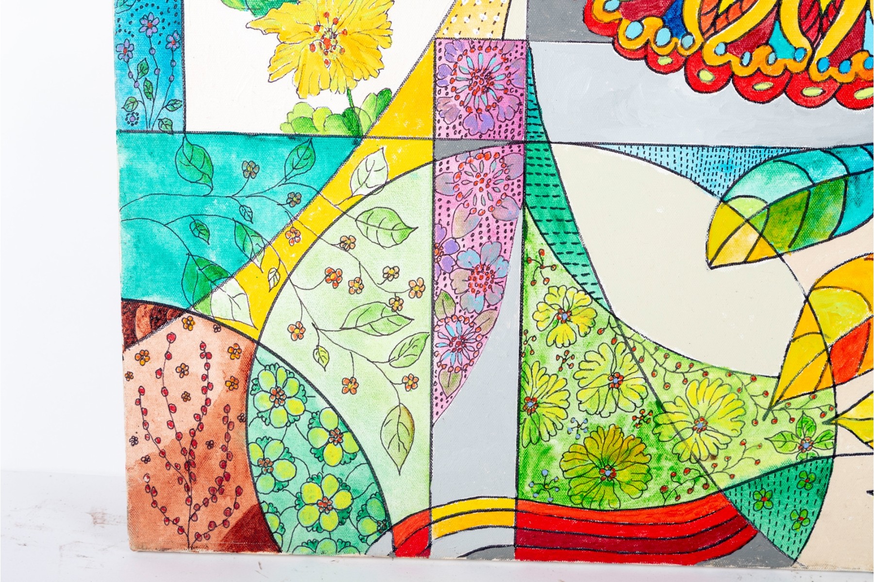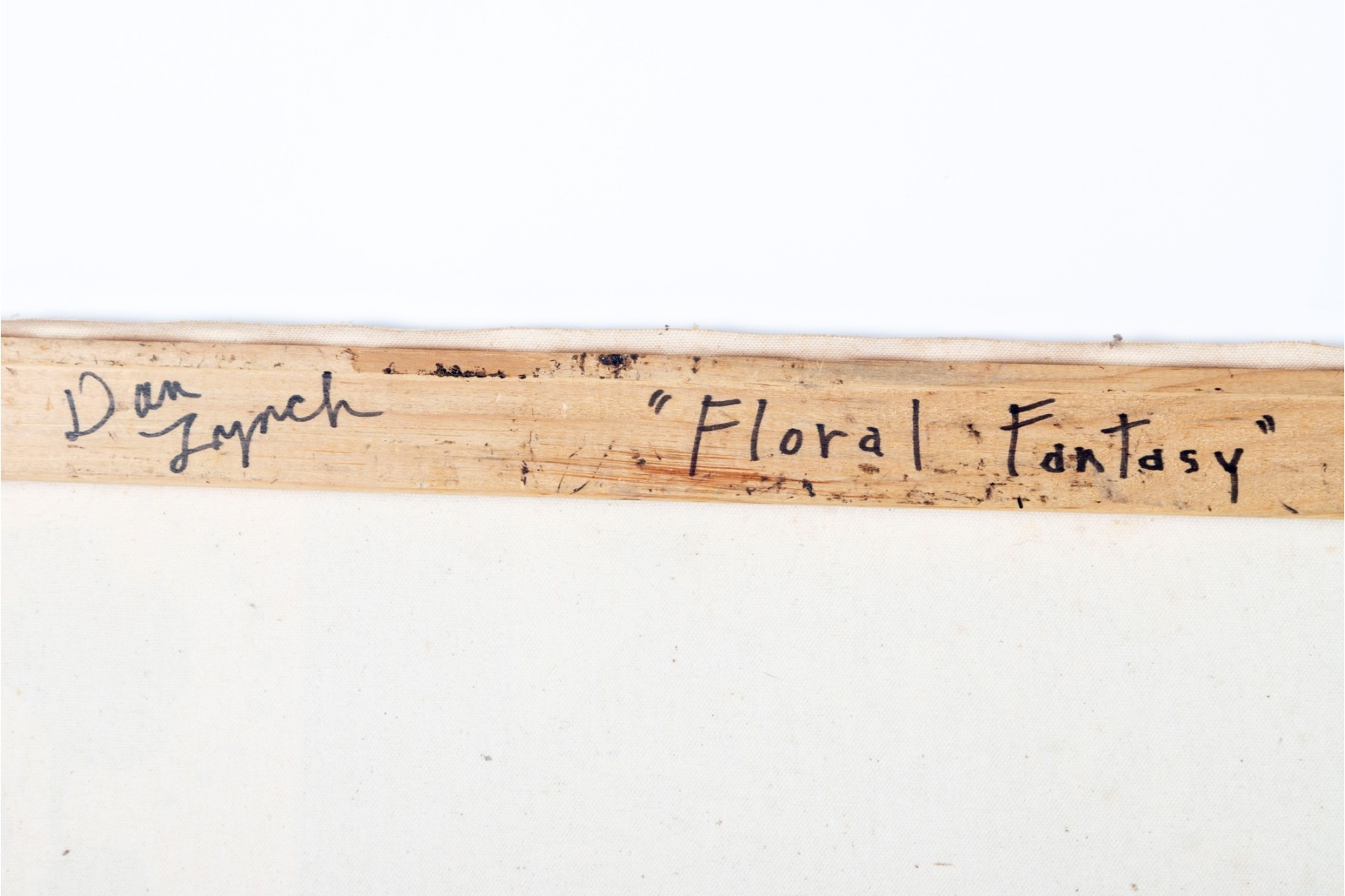 Dan Lynch (American [SC], 1930-2019) "Floral Fantasy" mixed media on canvas depicting an abstracted composition with a large, colorfully patterned flower at the center on a winding stem overlaying geometric color blocked segments in the background with pretty floral depictions throughout. Signed and titled on the verso. The canvas is mounted to a stretcher, unframed.