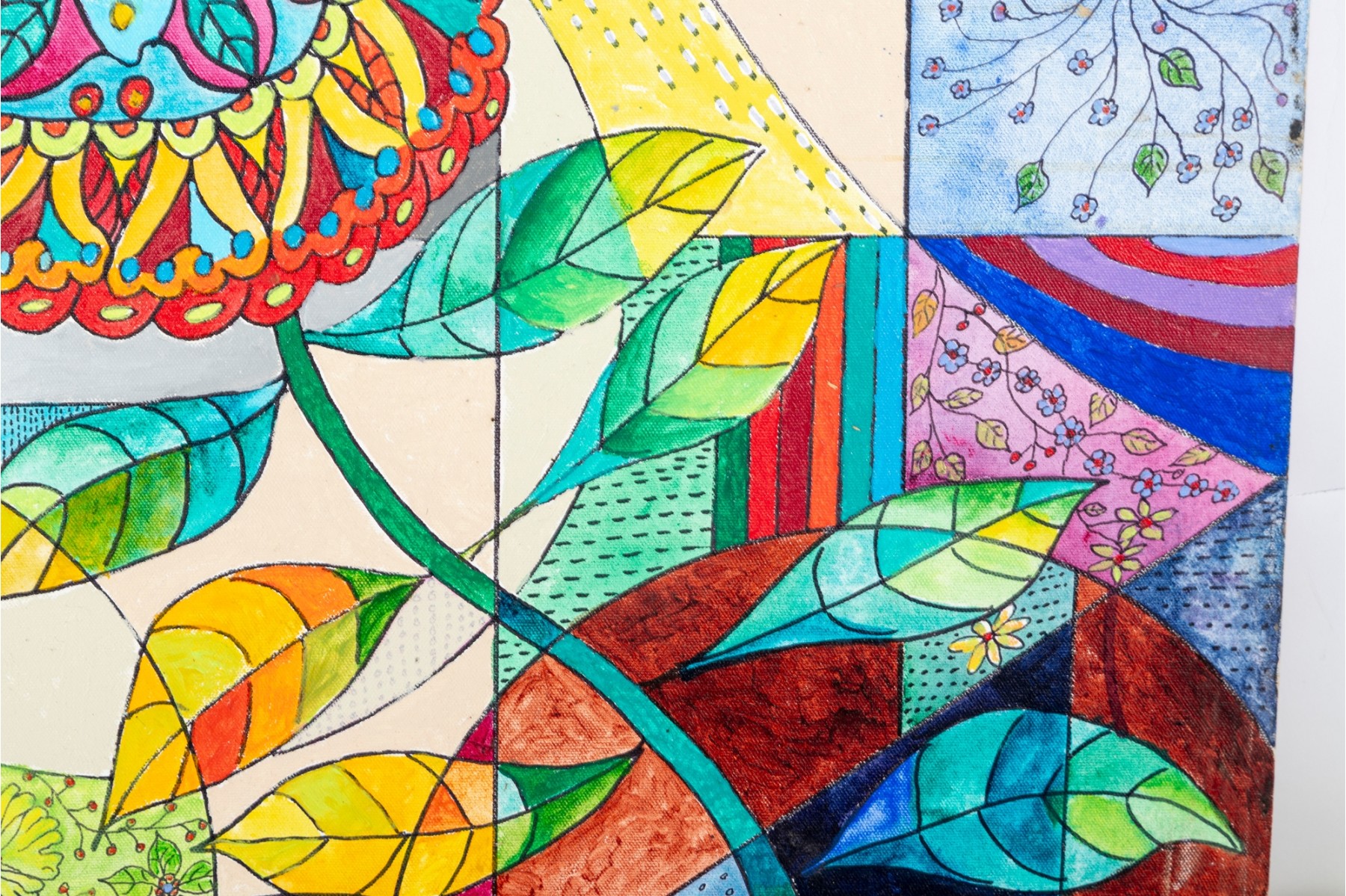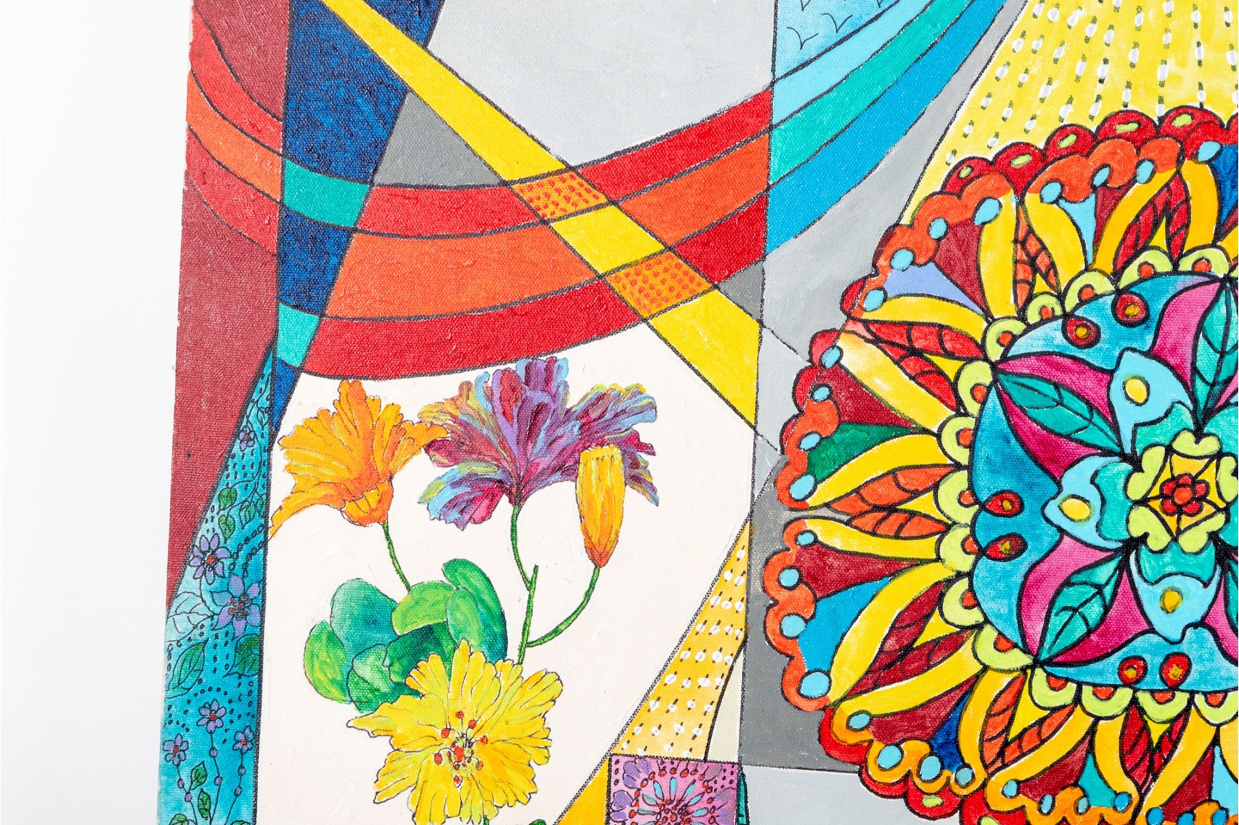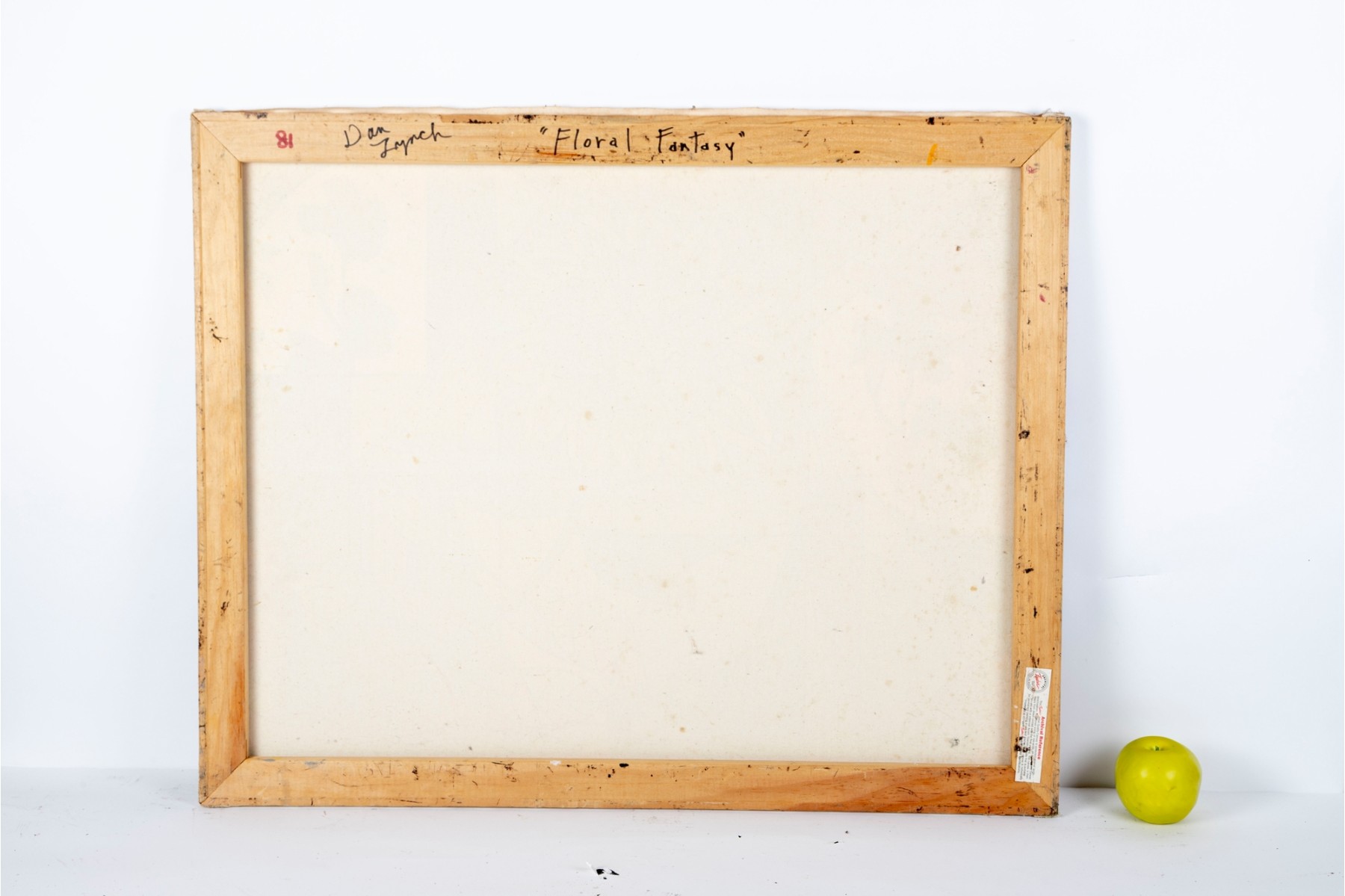 Dan Lynch (American [SC], 1930-2019) "Floral Fantasy" mixed media on canvas depicting an abstracted composition with a large, colorfully patterned flower at the center on a winding stem overlaying geometric color blocked segments in the background with pretty floral depictions throughout. Signed and titled on the verso. The canvas is mounted to a stretcher, unframed.