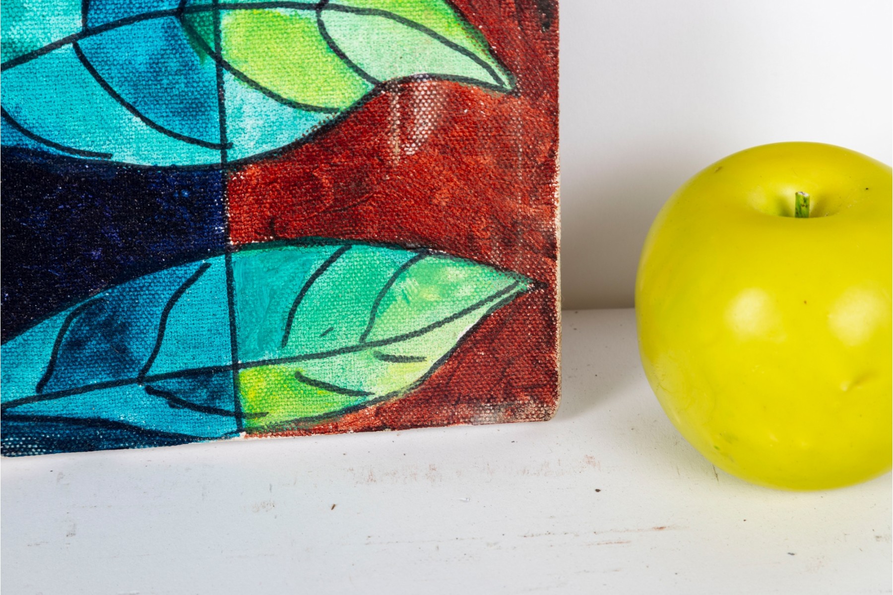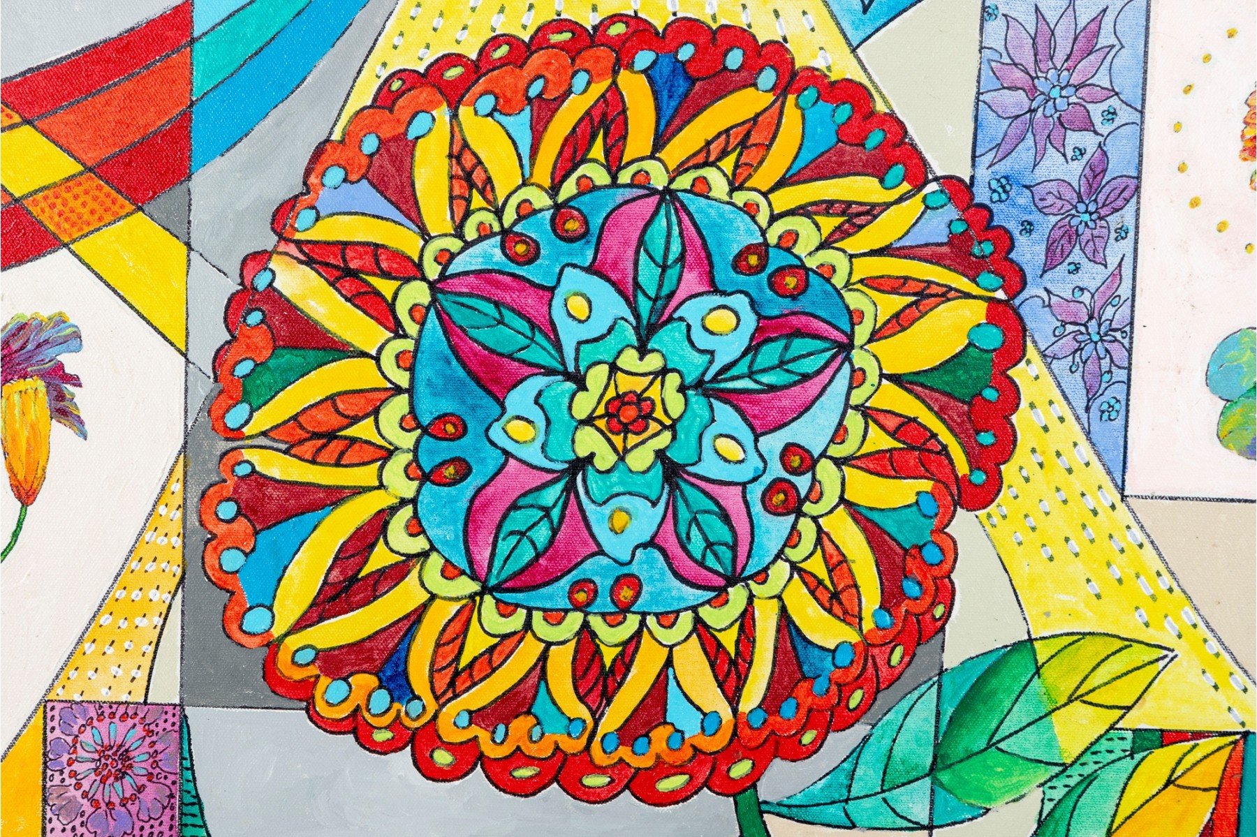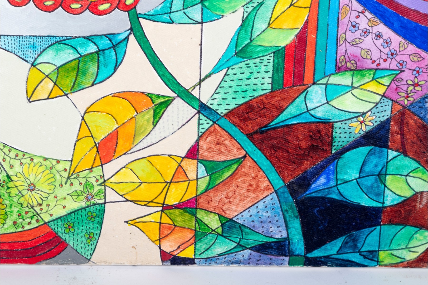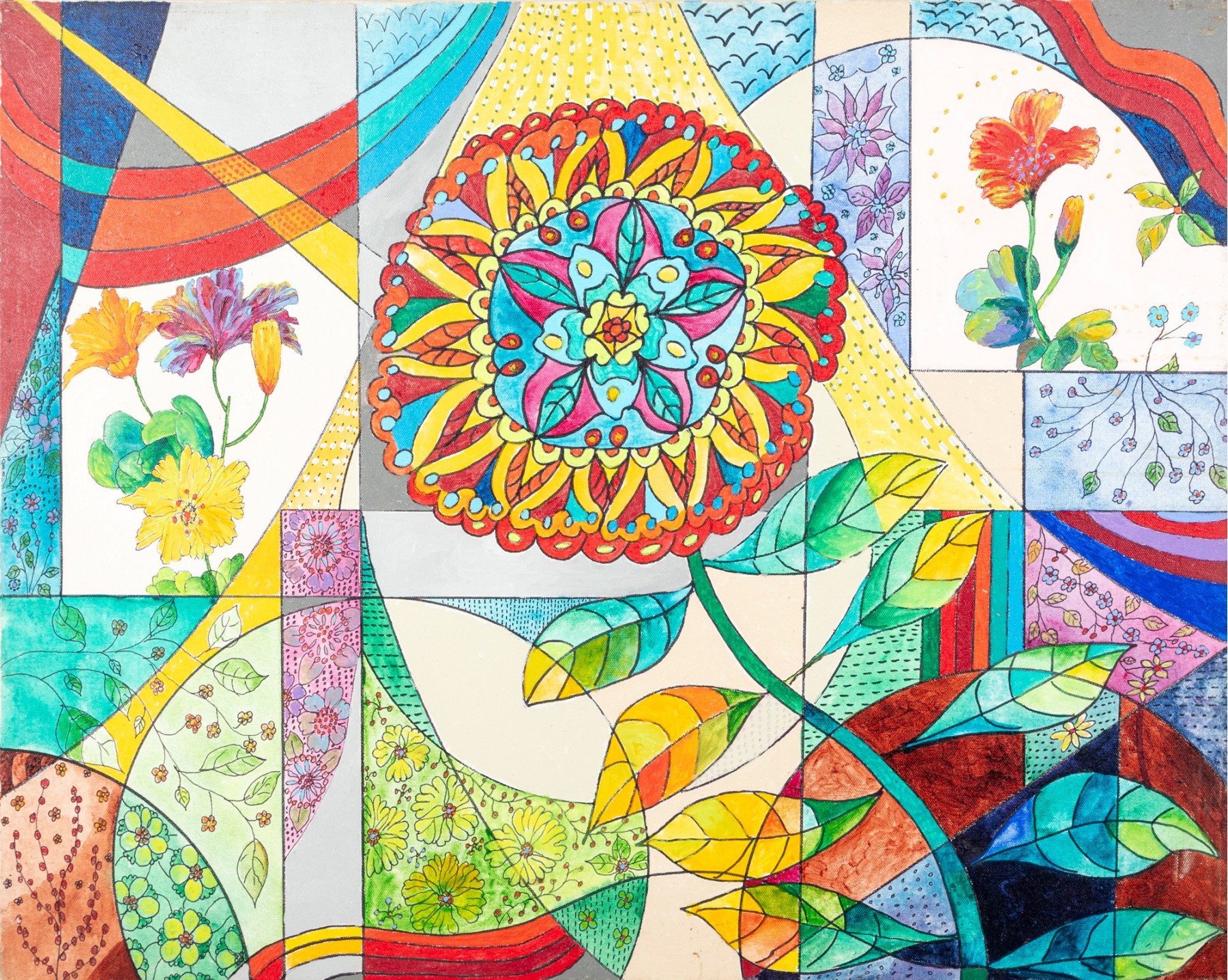 Dan Lynch (American [SC], 1930-2019) "Floral Fantasy" mixed media on canvas depicting an abstracted composition with a large, colorfully patterned flower at the center on a winding stem overlaying geometric color blocked segments in the background with pretty floral depictions throughout. Signed and titled on the verso. The canvas is mounted to a stretcher, unframed.