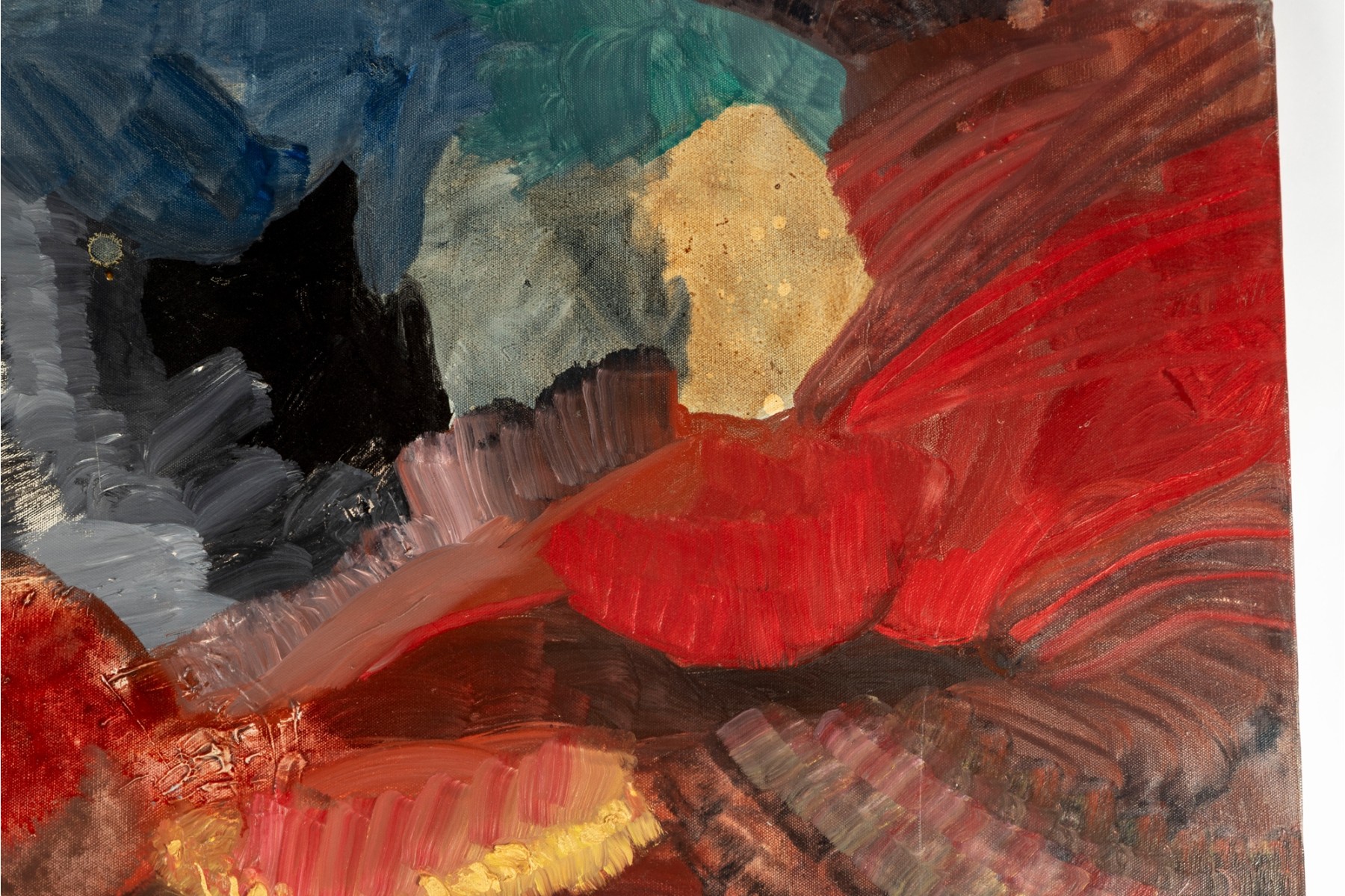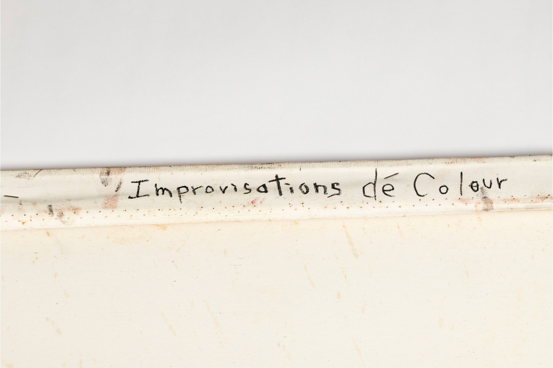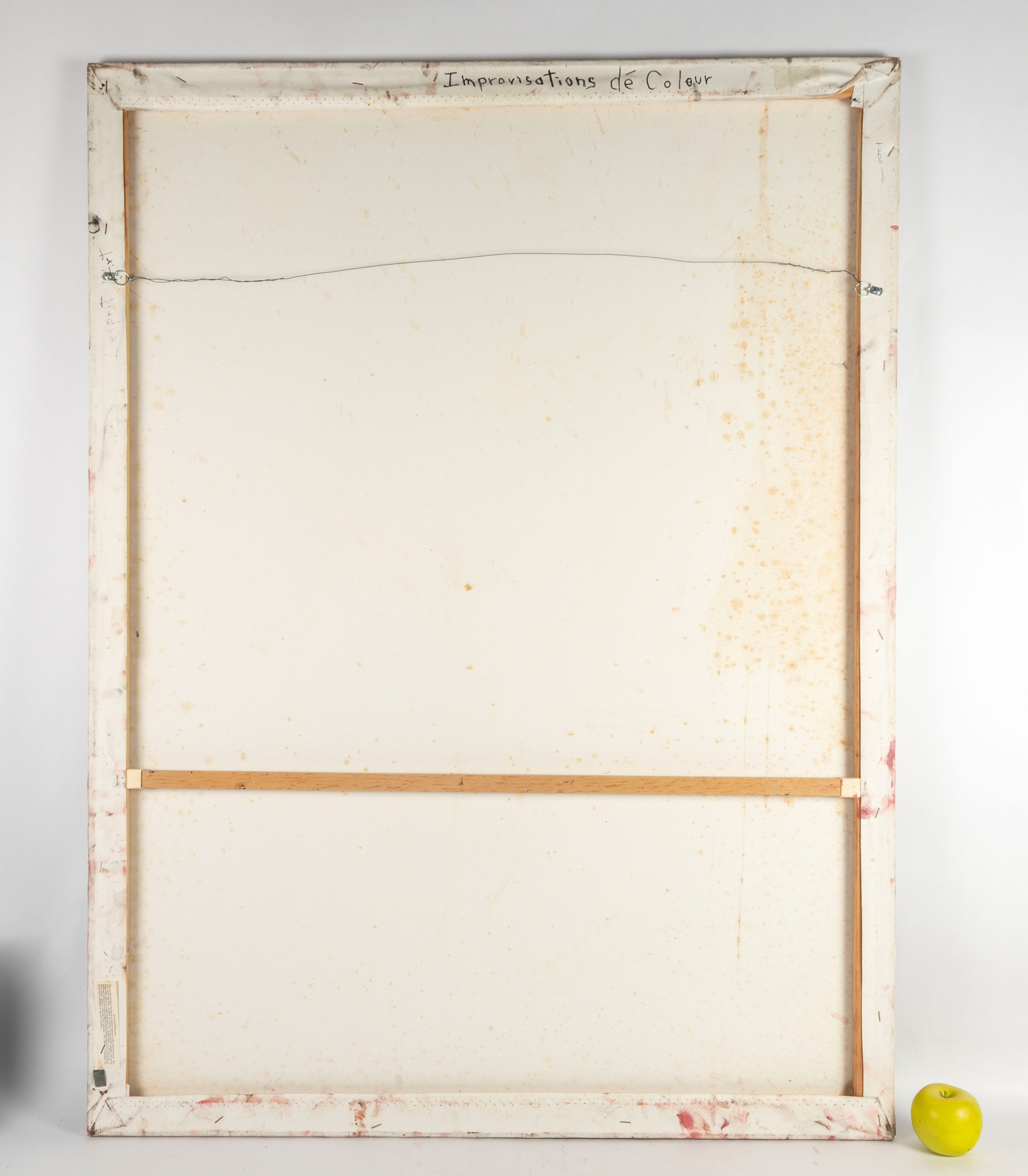 A bold and energetic abstract expressionist composition titled ",Improvisations de Colour" by Dan Lynch, featuring layered brushwork and sweeping gestures in vivid red, gold, black, and teal hues.