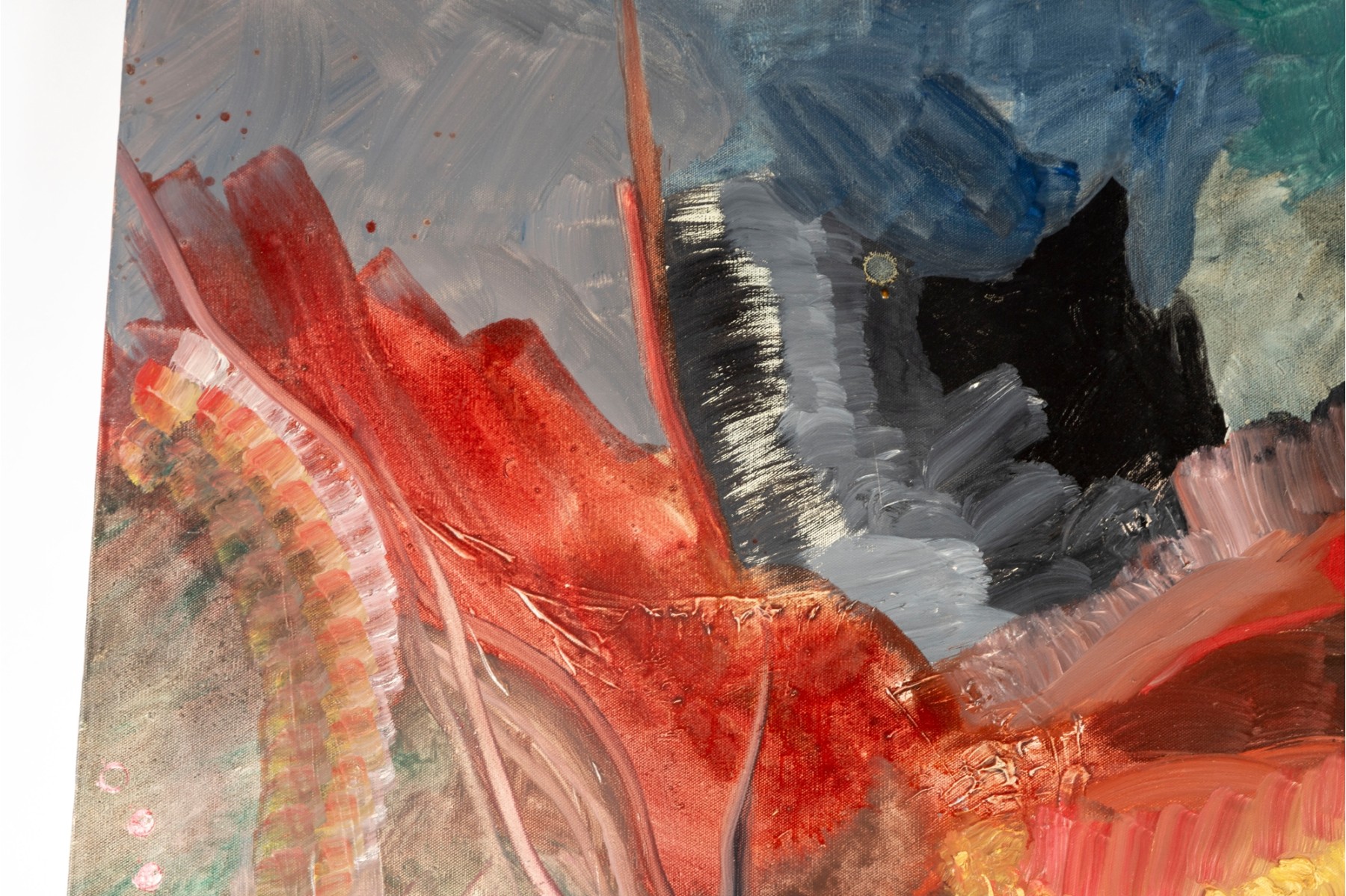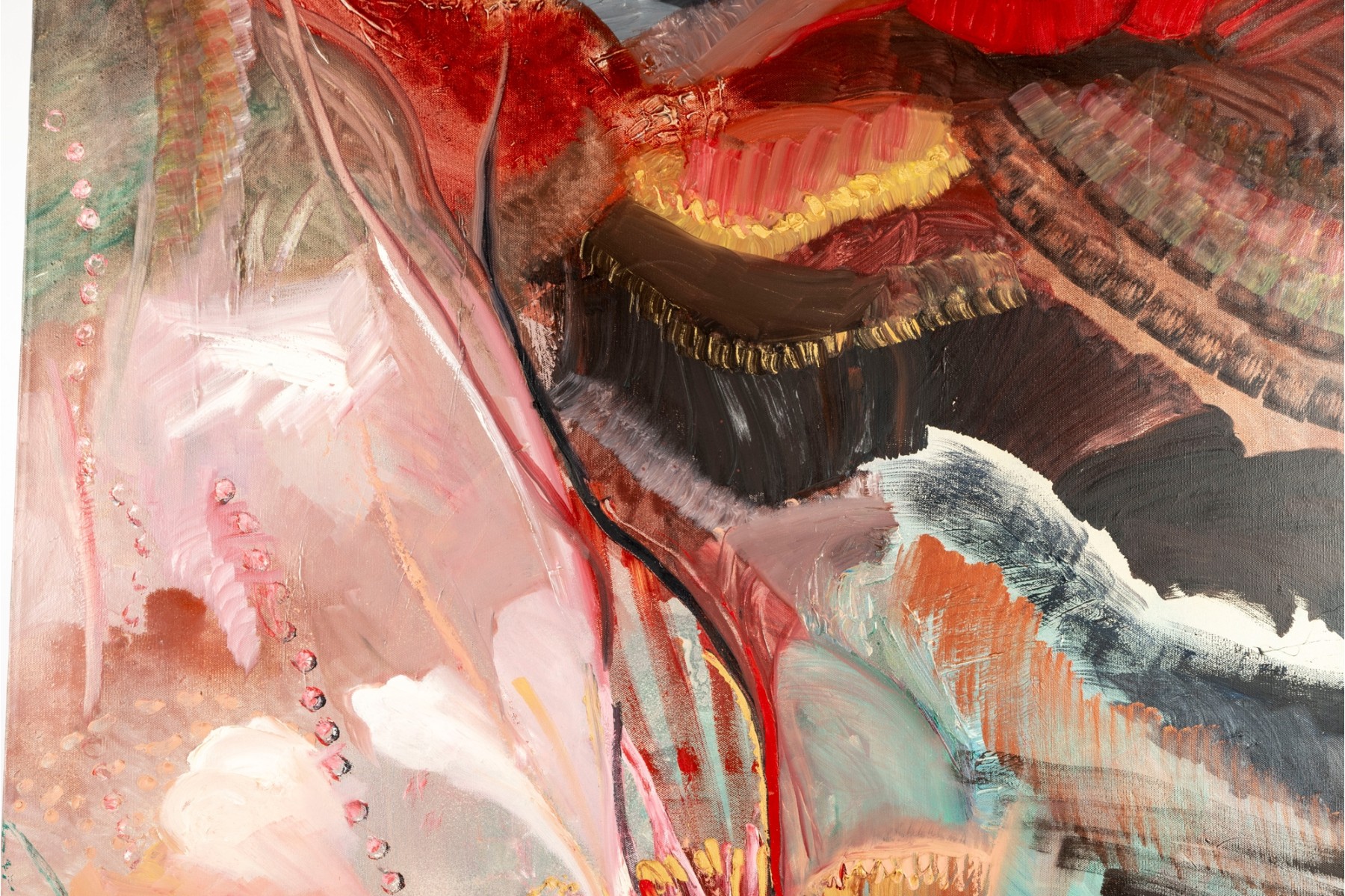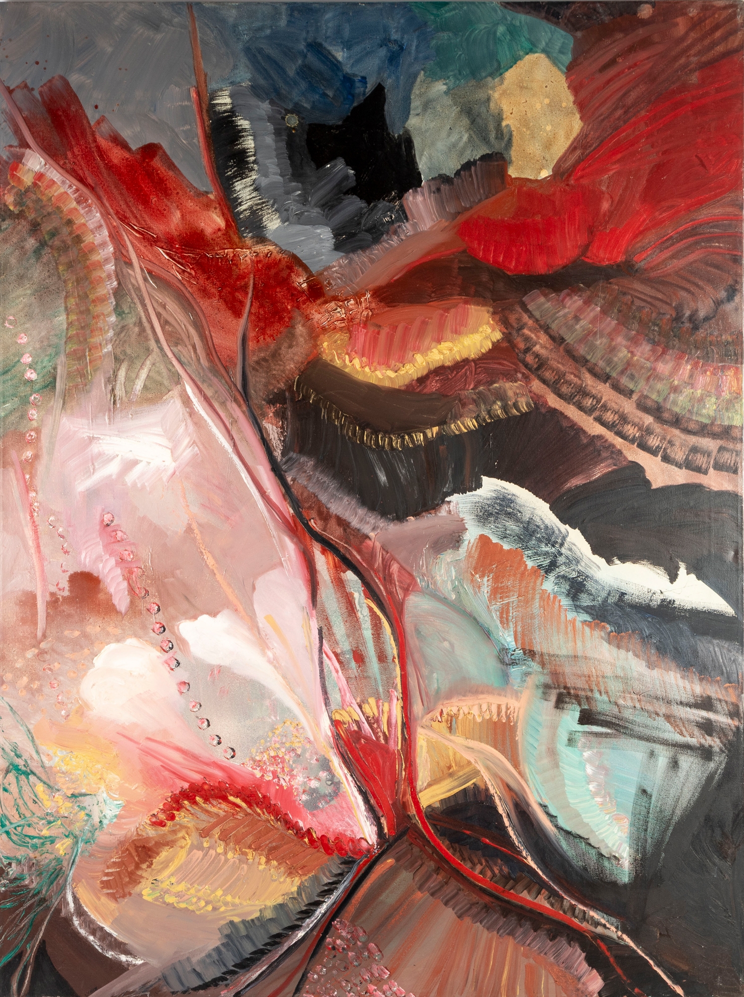 A bold and energetic abstract expressionist composition titled ",Improvisations de Colour" by Dan Lynch, featuring layered brushwork and sweeping gestures in vivid red, gold, black, and teal hues.