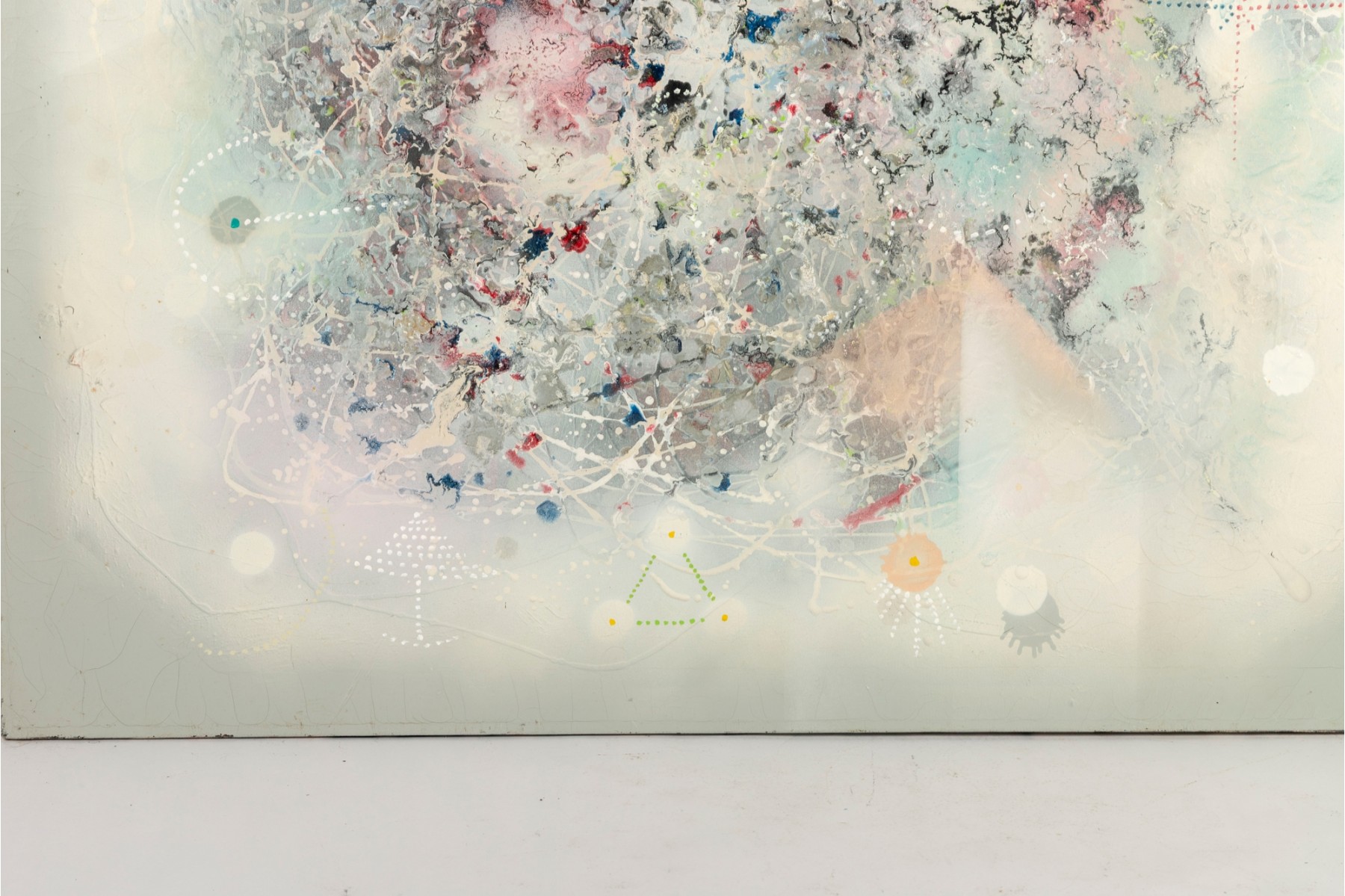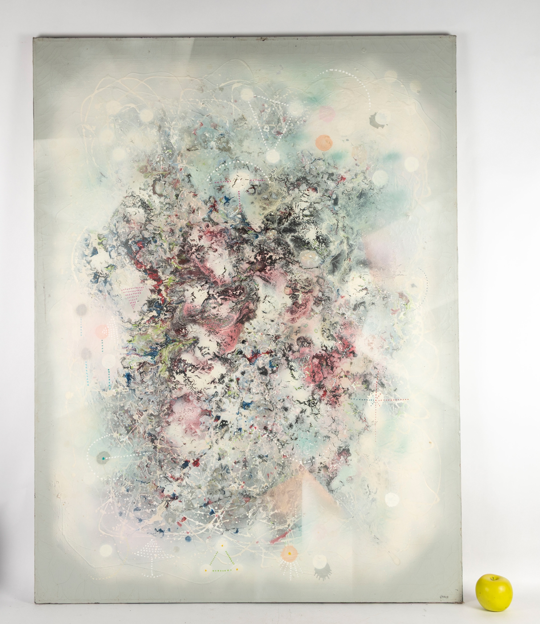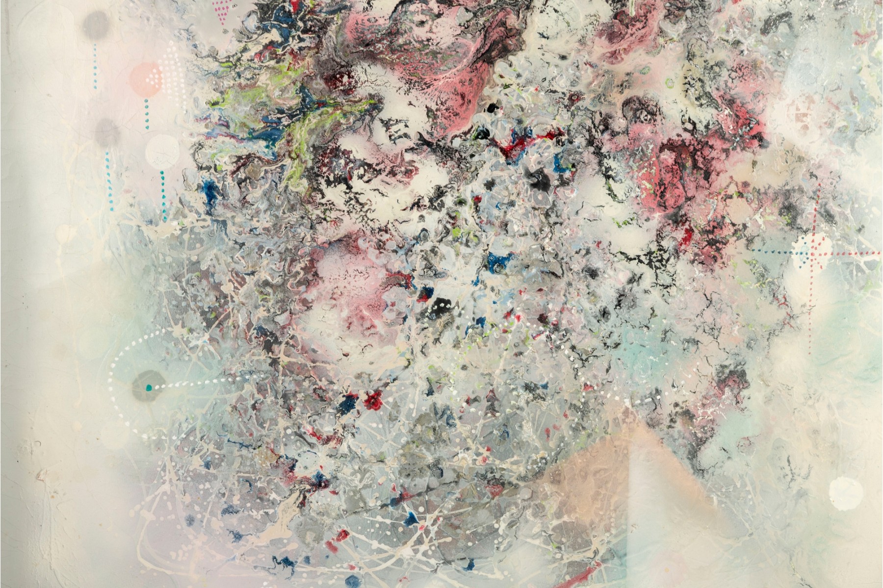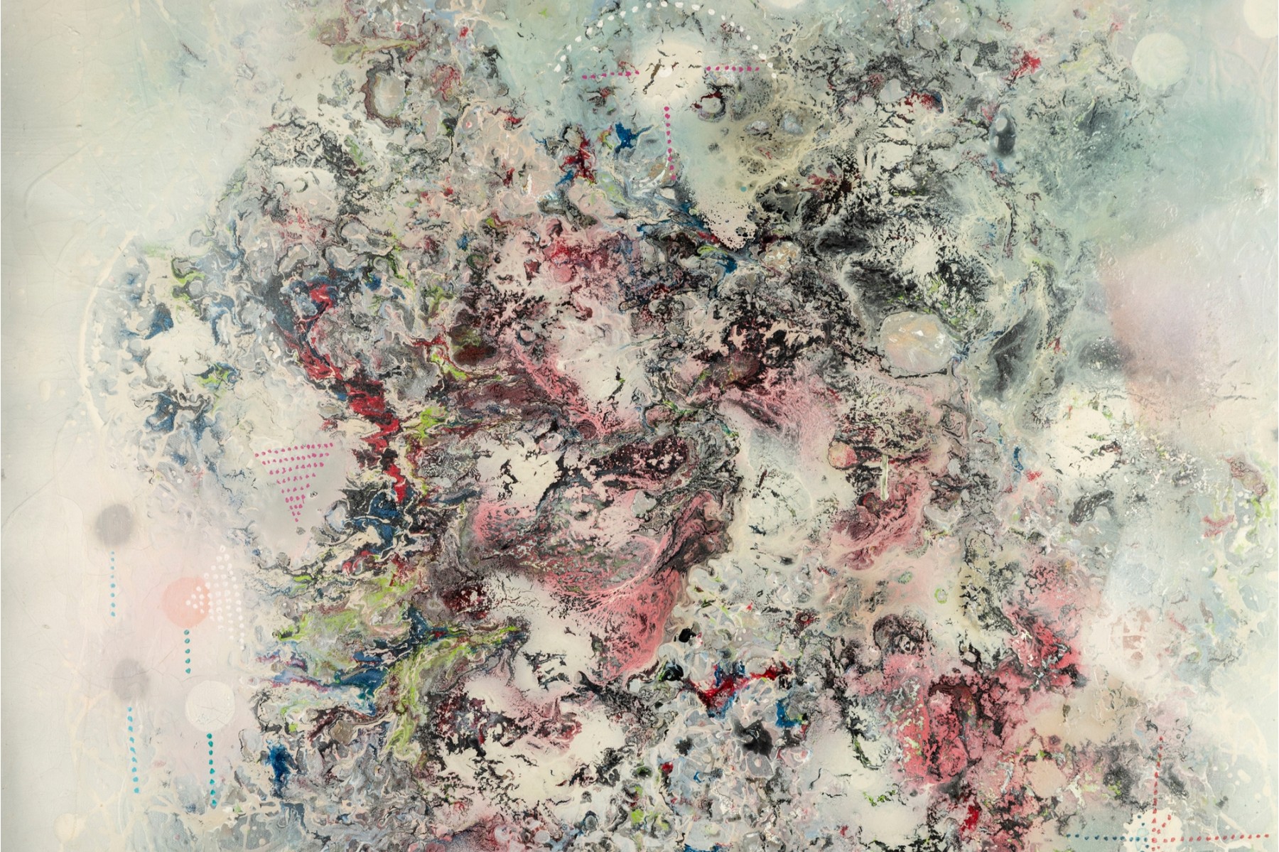 A large-scale abstract composition by local South Carolina artist Dan Lynch, featuring layered and dynamic swirls of color and texture, blending soft pastel tones with intense bursts of pigment.
