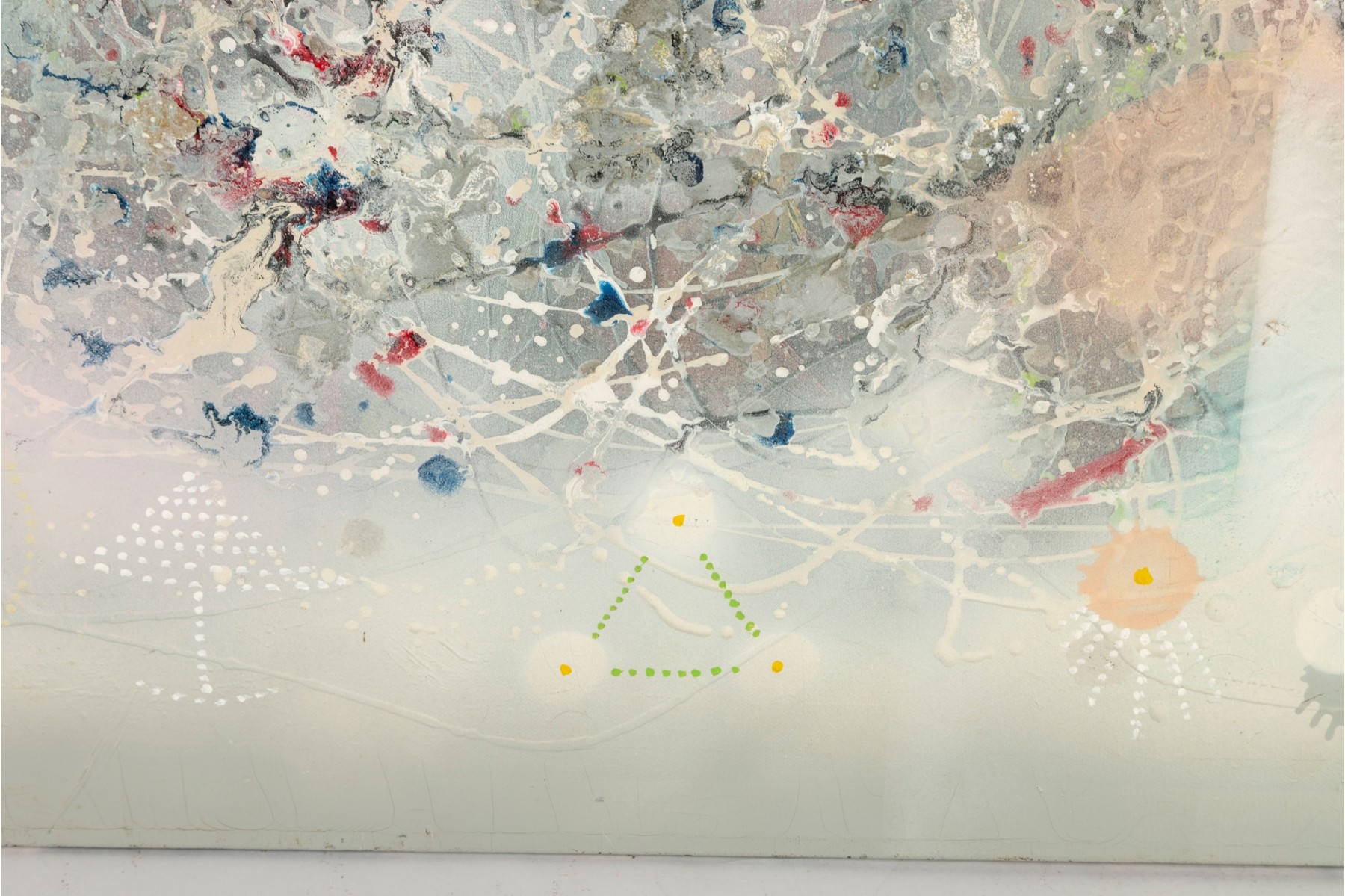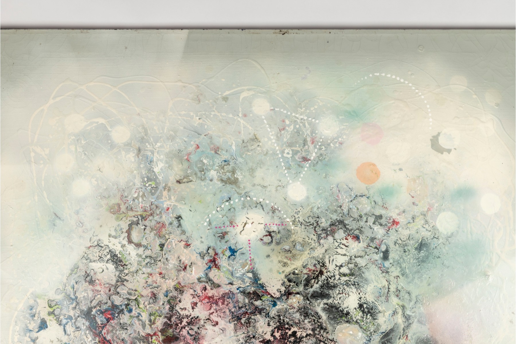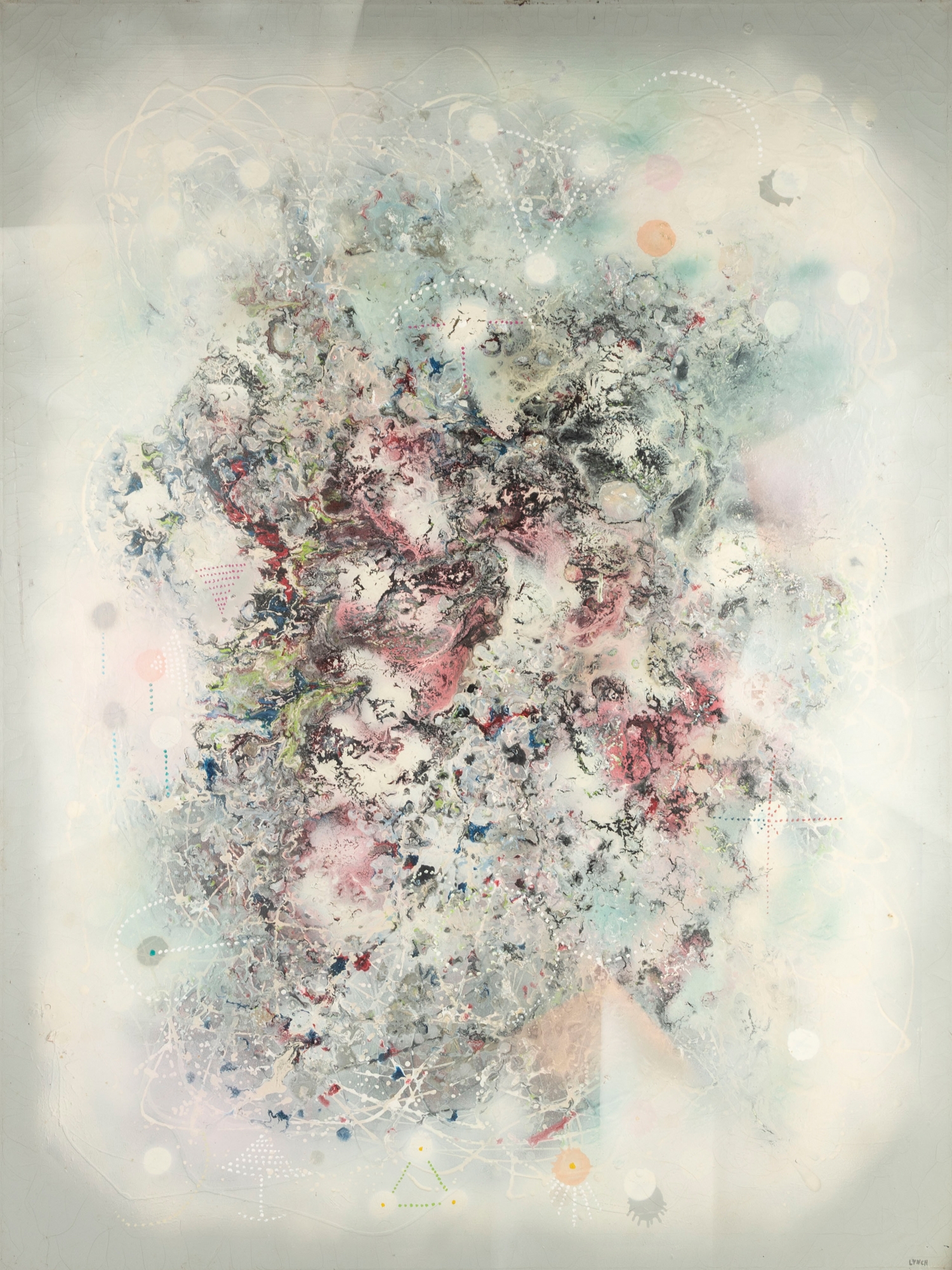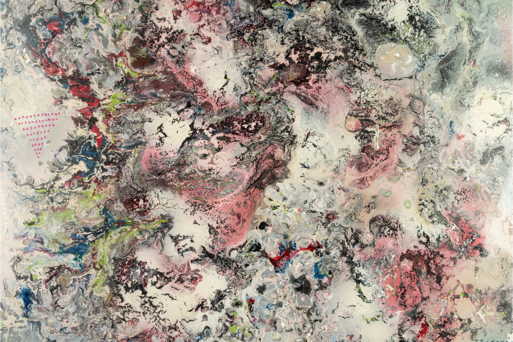 A large-scale abstract composition by local South Carolina artist Dan Lynch, featuring layered and dynamic swirls of color and texture, blending soft pastel tones with intense bursts of pigment.