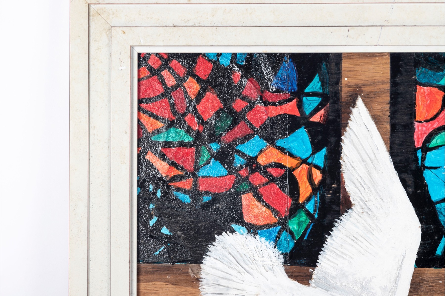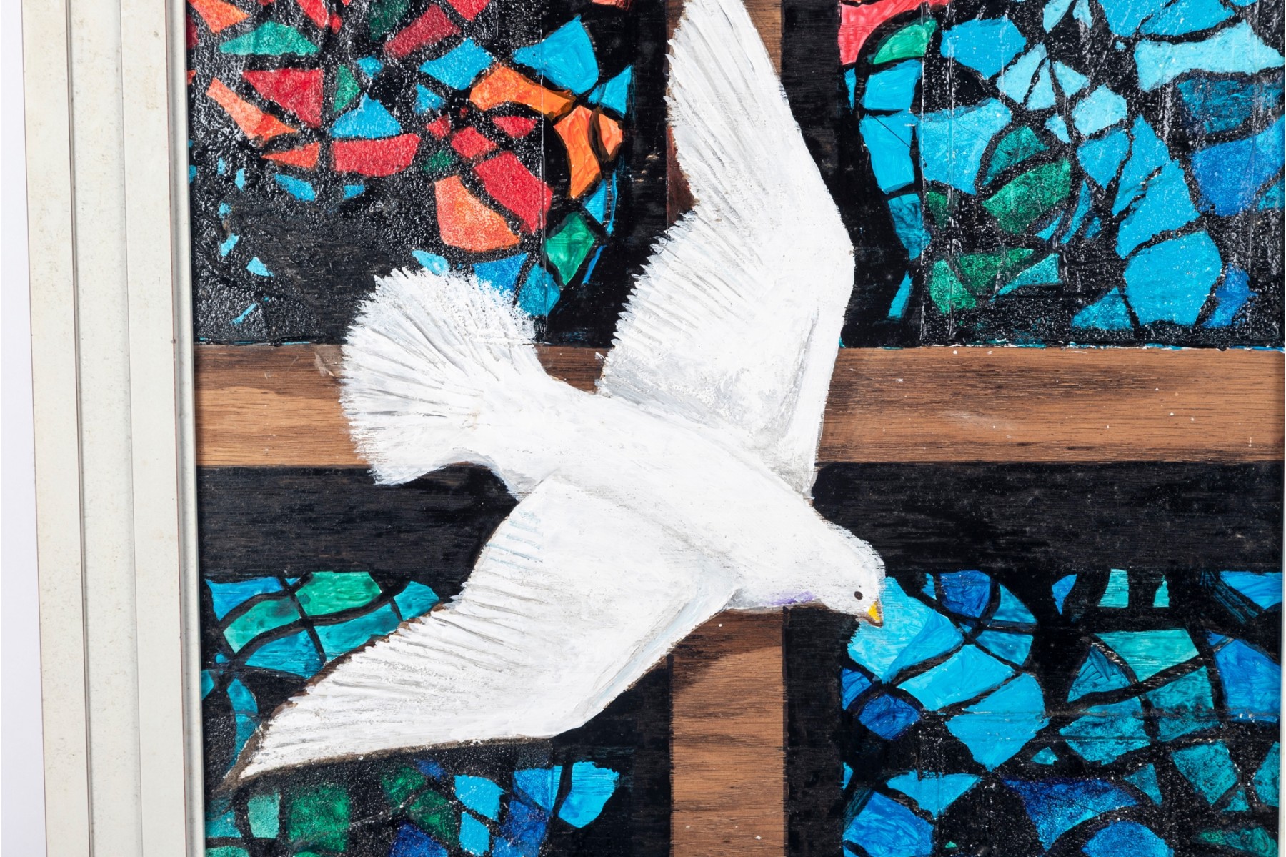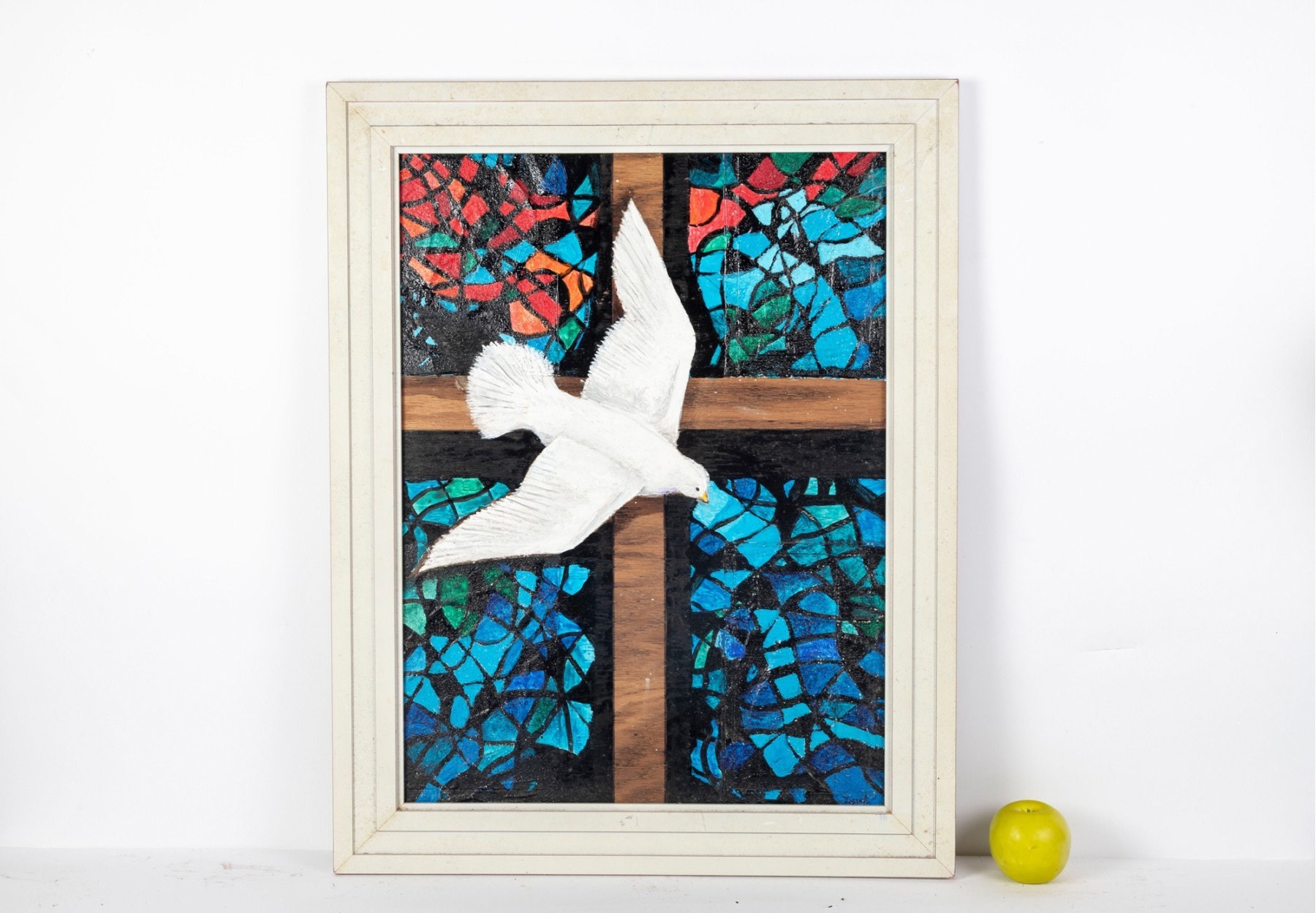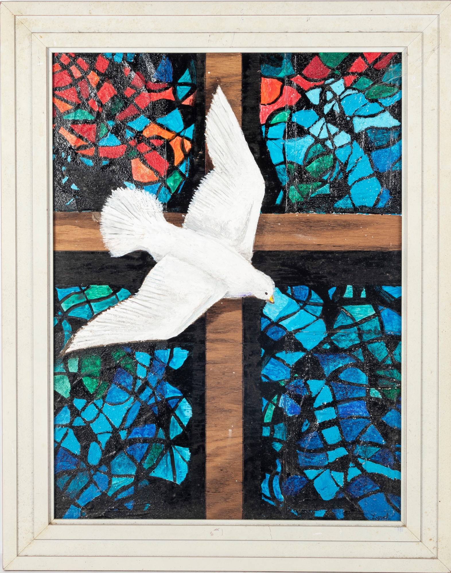 Dan Lynch (American [SC], 1930-2019) mixed media on board depicting a white dove over a brown wood grain cross against a stained glass window in red, orange, green, and blue. Signed lower right.