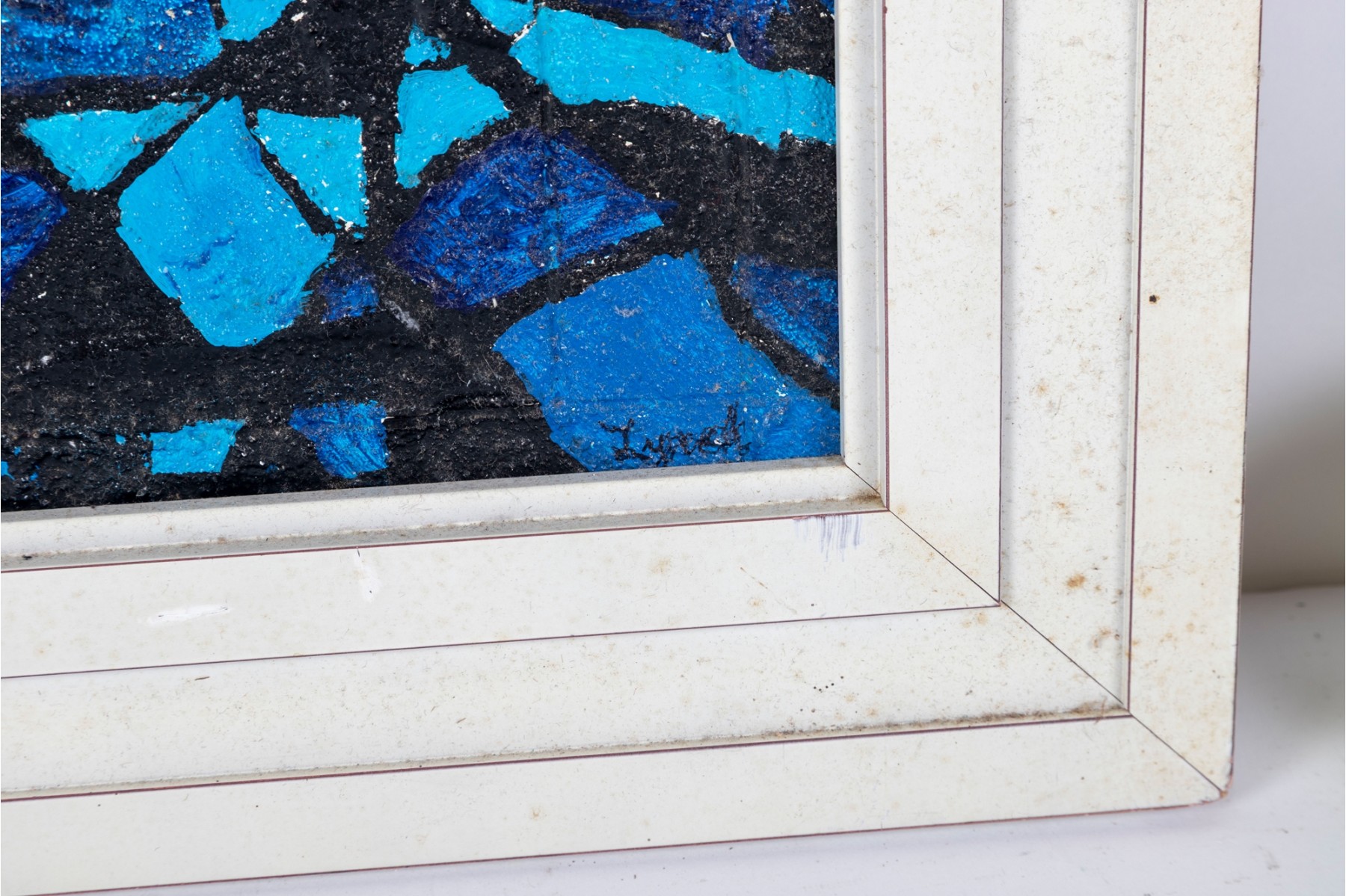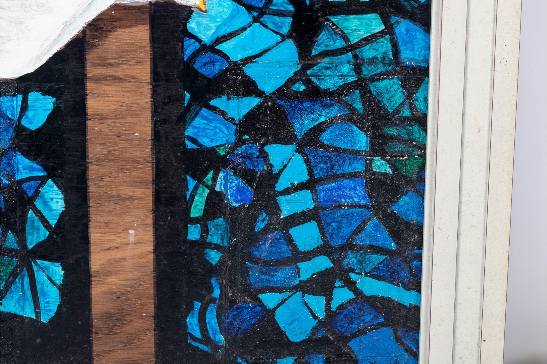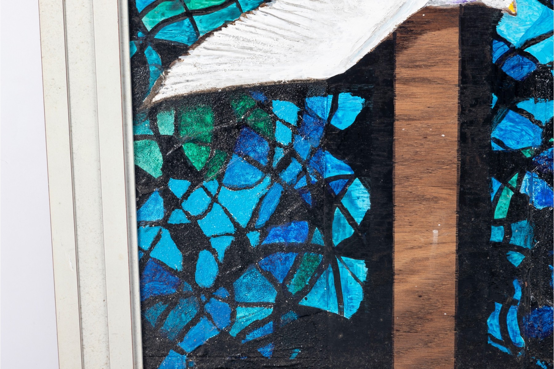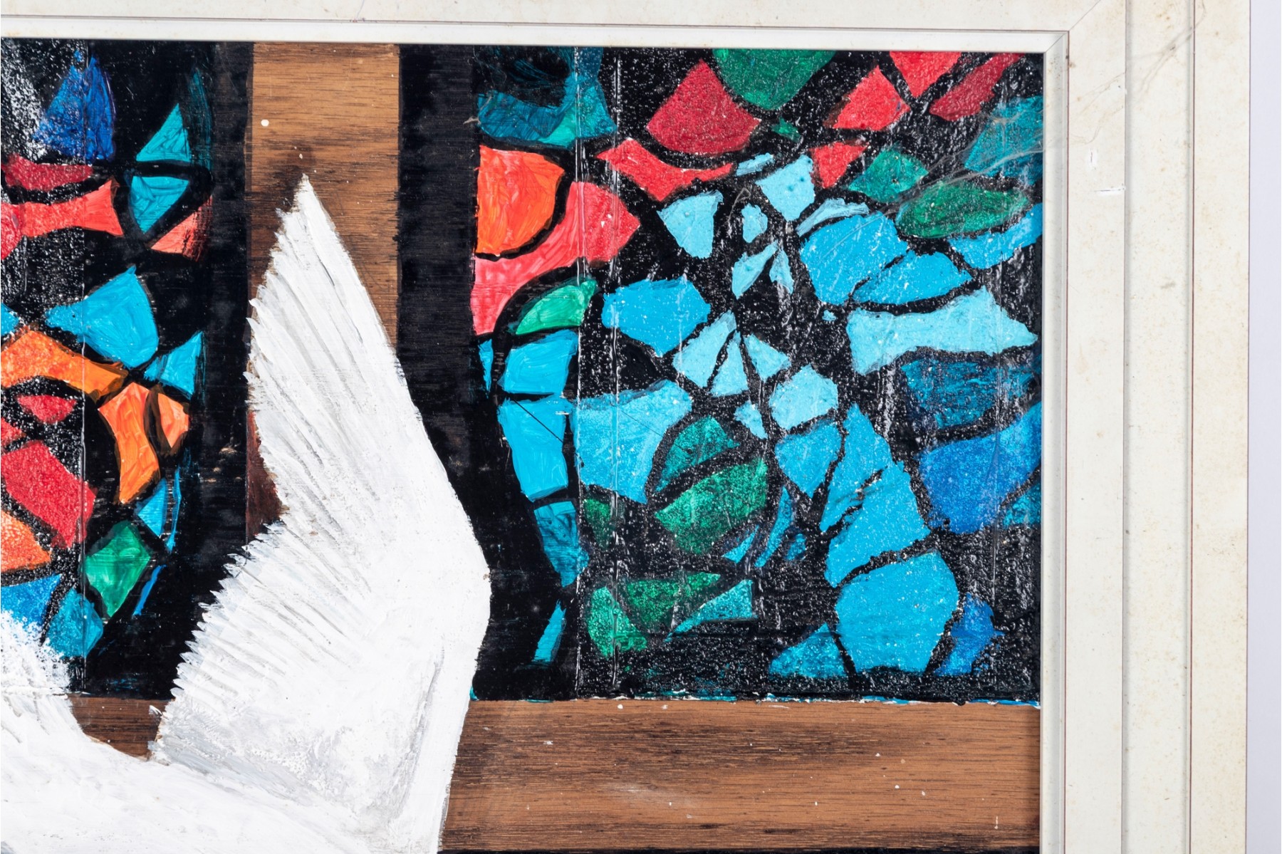Dan Lynch (American [SC], 1930-2019) mixed media on board depicting a white dove over a brown wood grain cross against a stained glass window in red, orange, green, and blue. Signed lower right.