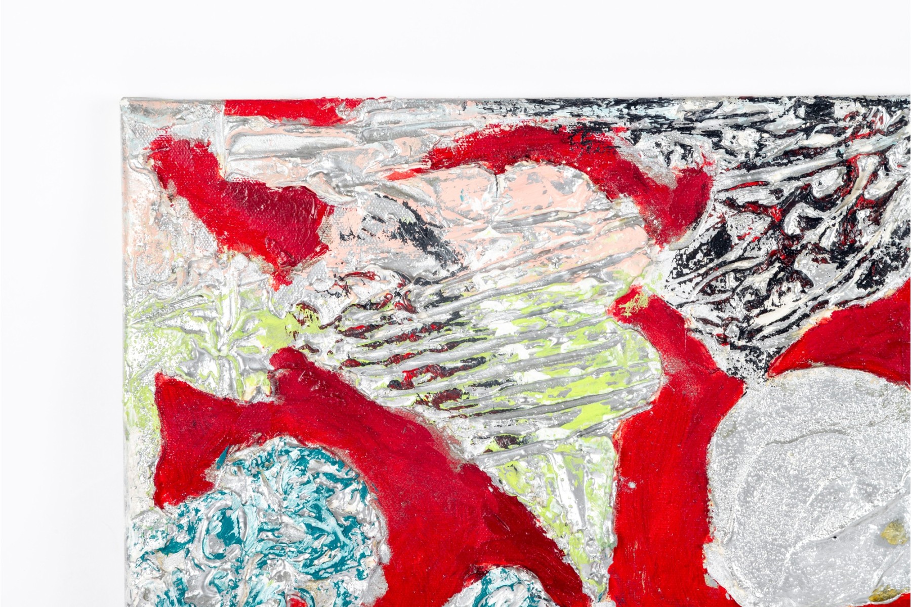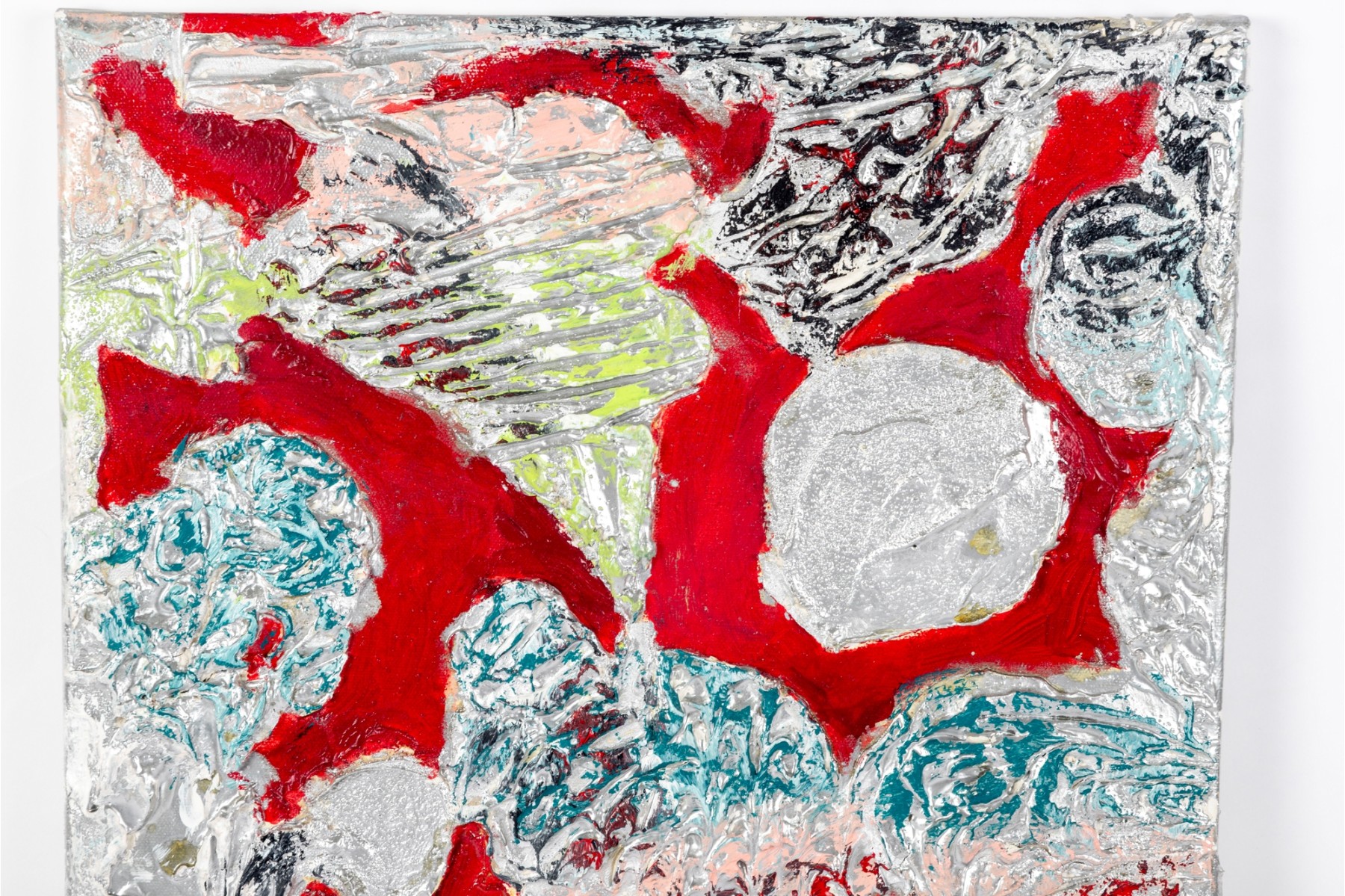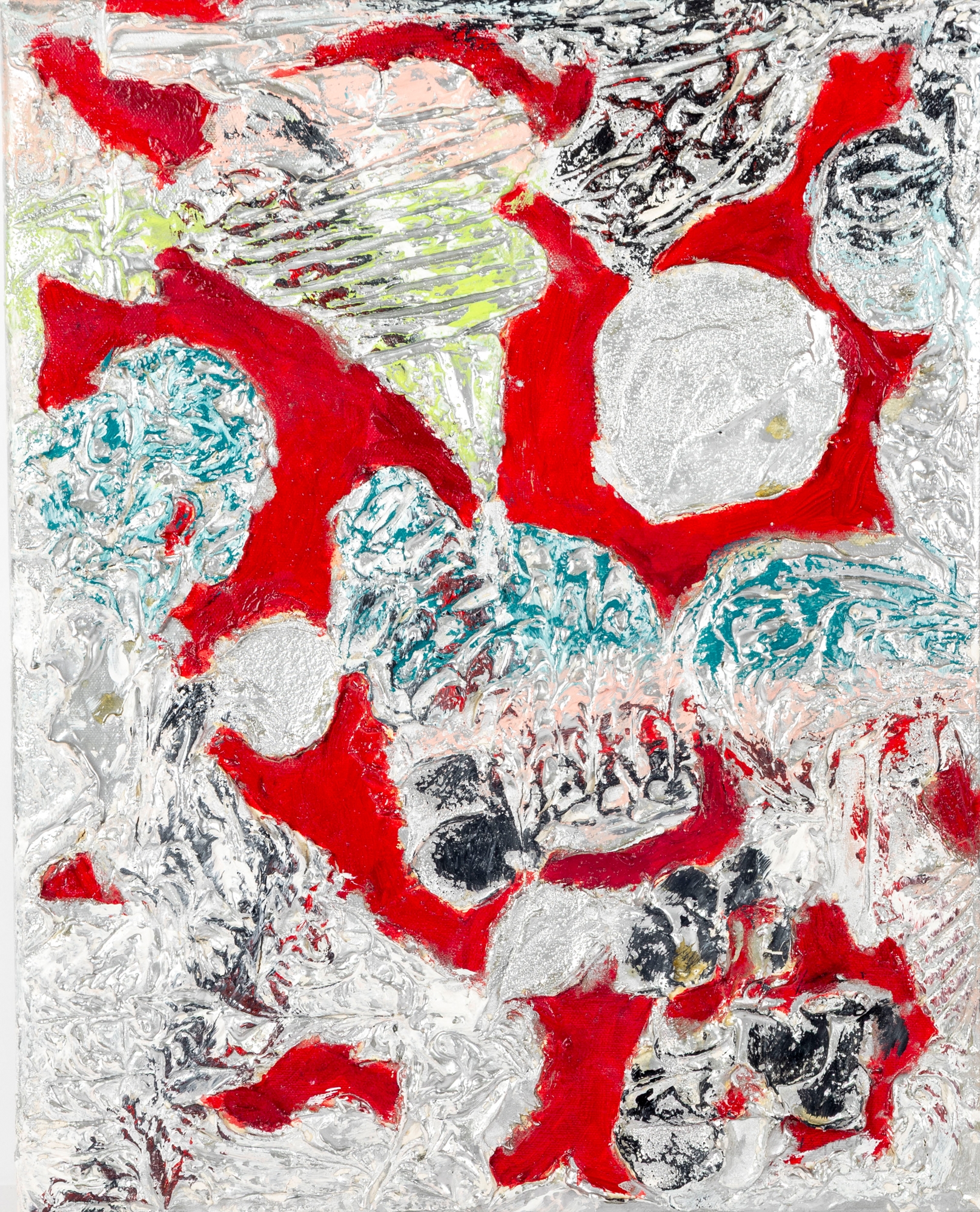 Dan Lynch (American [SC], 1930-2019) mixed media on canvas depicting an abstract composition with organic free form elements in gray, teal, pink, and chartreuse green against a vibrant red ground. Signed on the verso. The canvas is mounted to a stretcher, unframed.