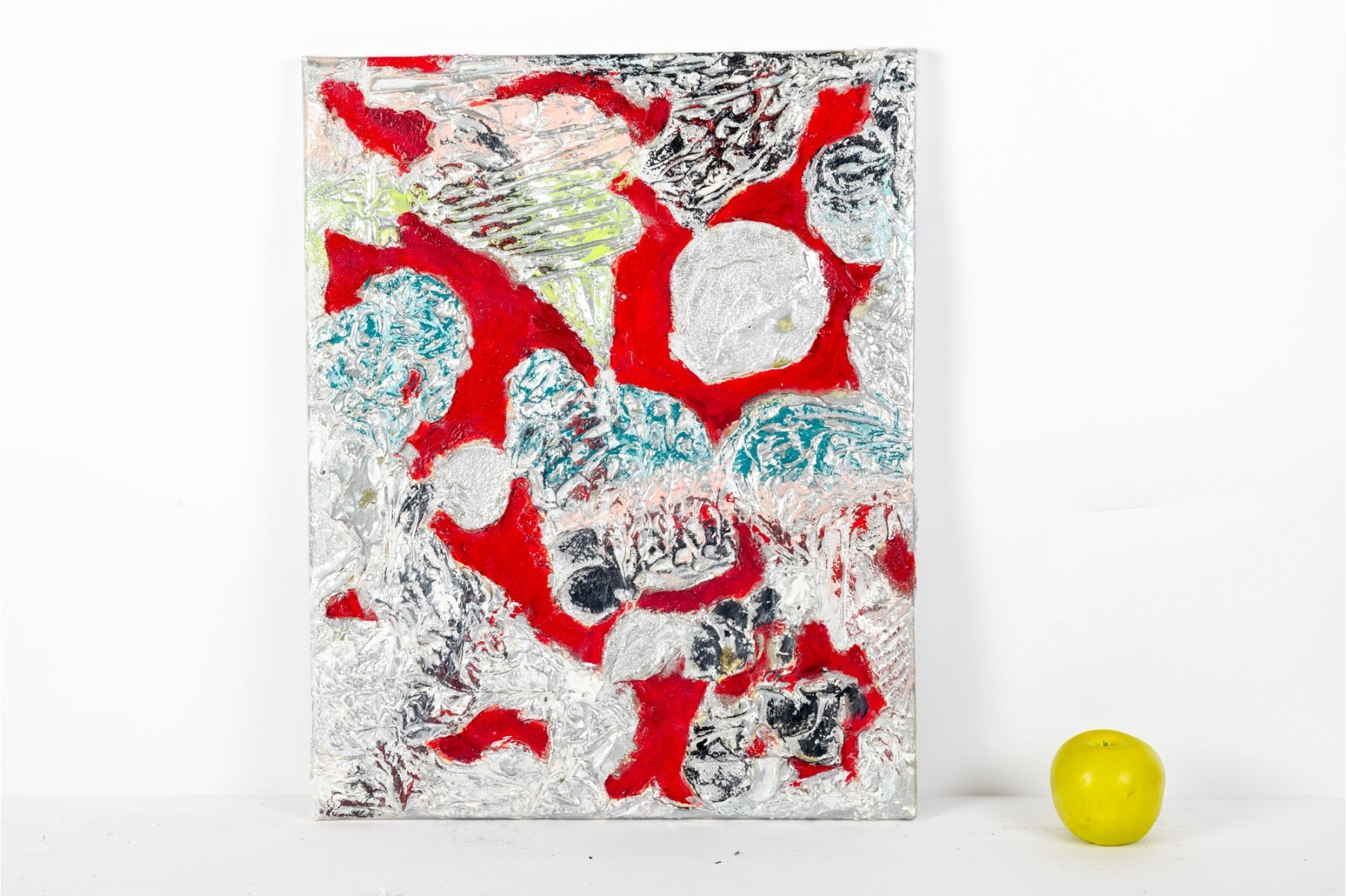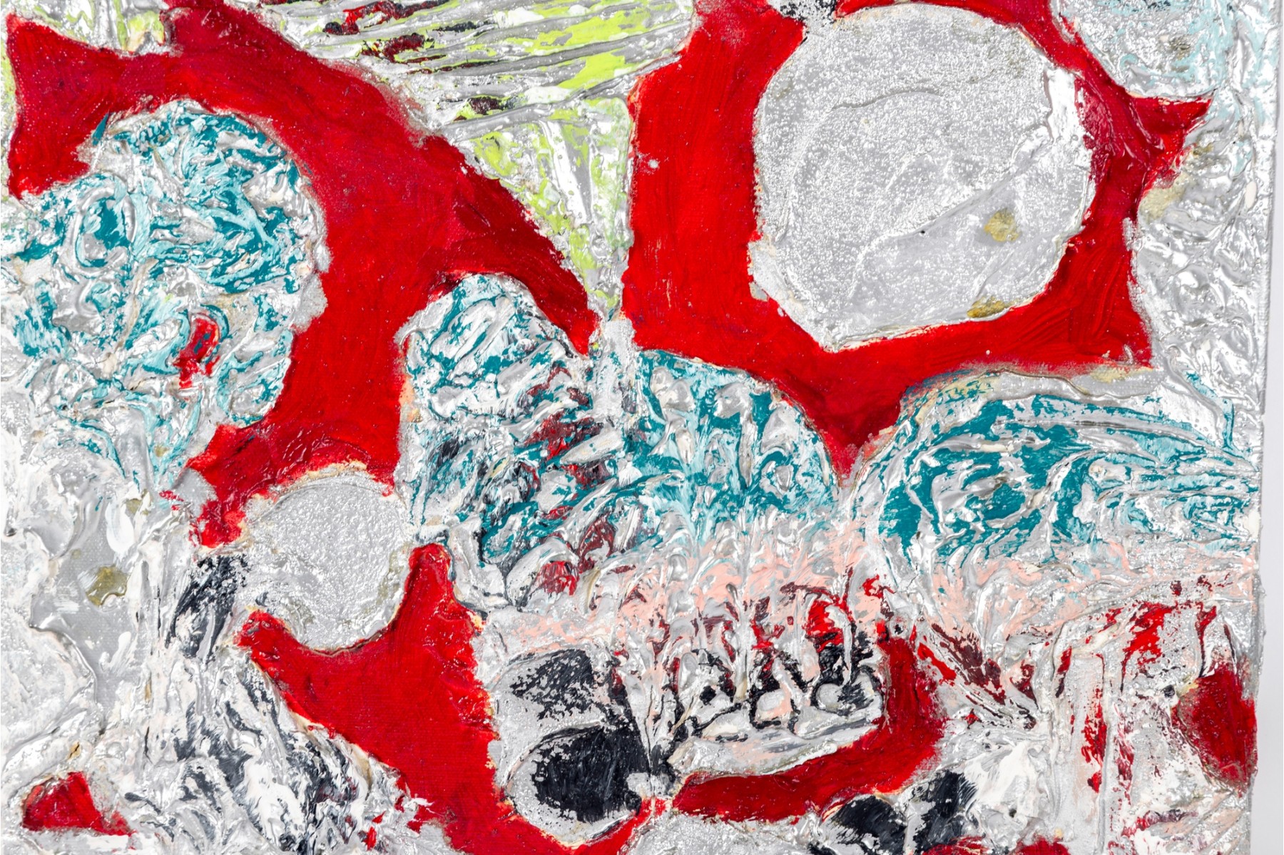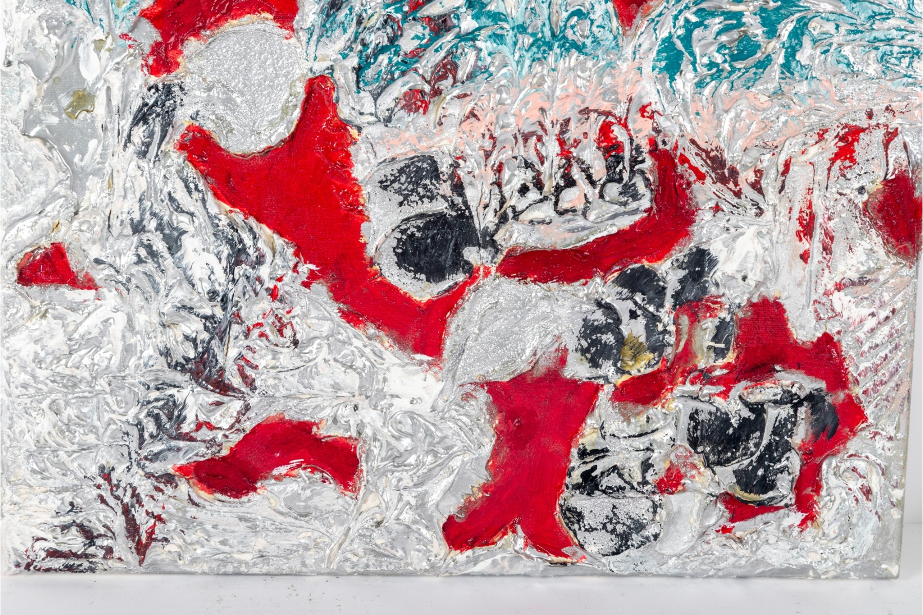 Dan Lynch (American [SC], 1930-2019) mixed media on canvas depicting an abstract composition with organic free form elements in gray, teal, pink, and chartreuse green against a vibrant red ground. Signed on the verso. The canvas is mounted to a stretcher, unframed.