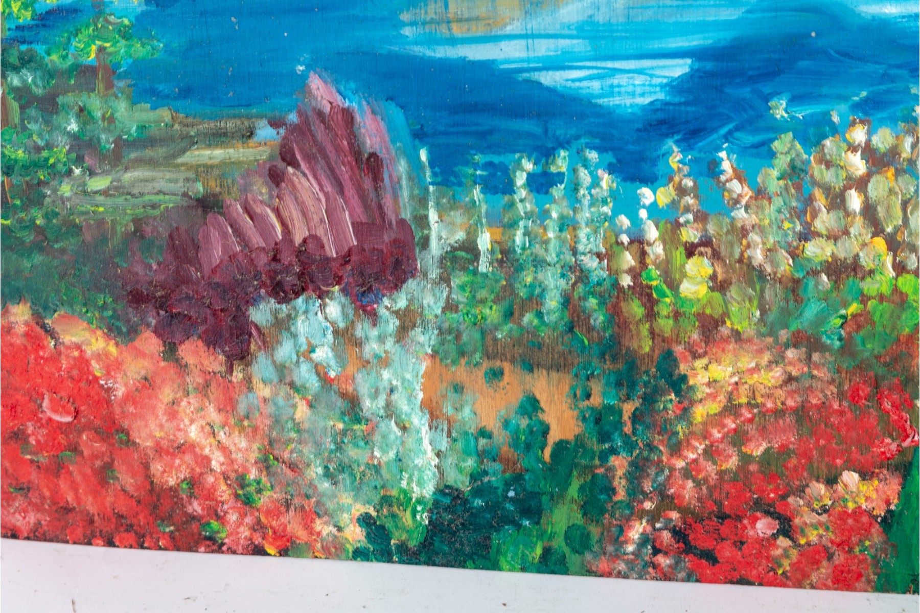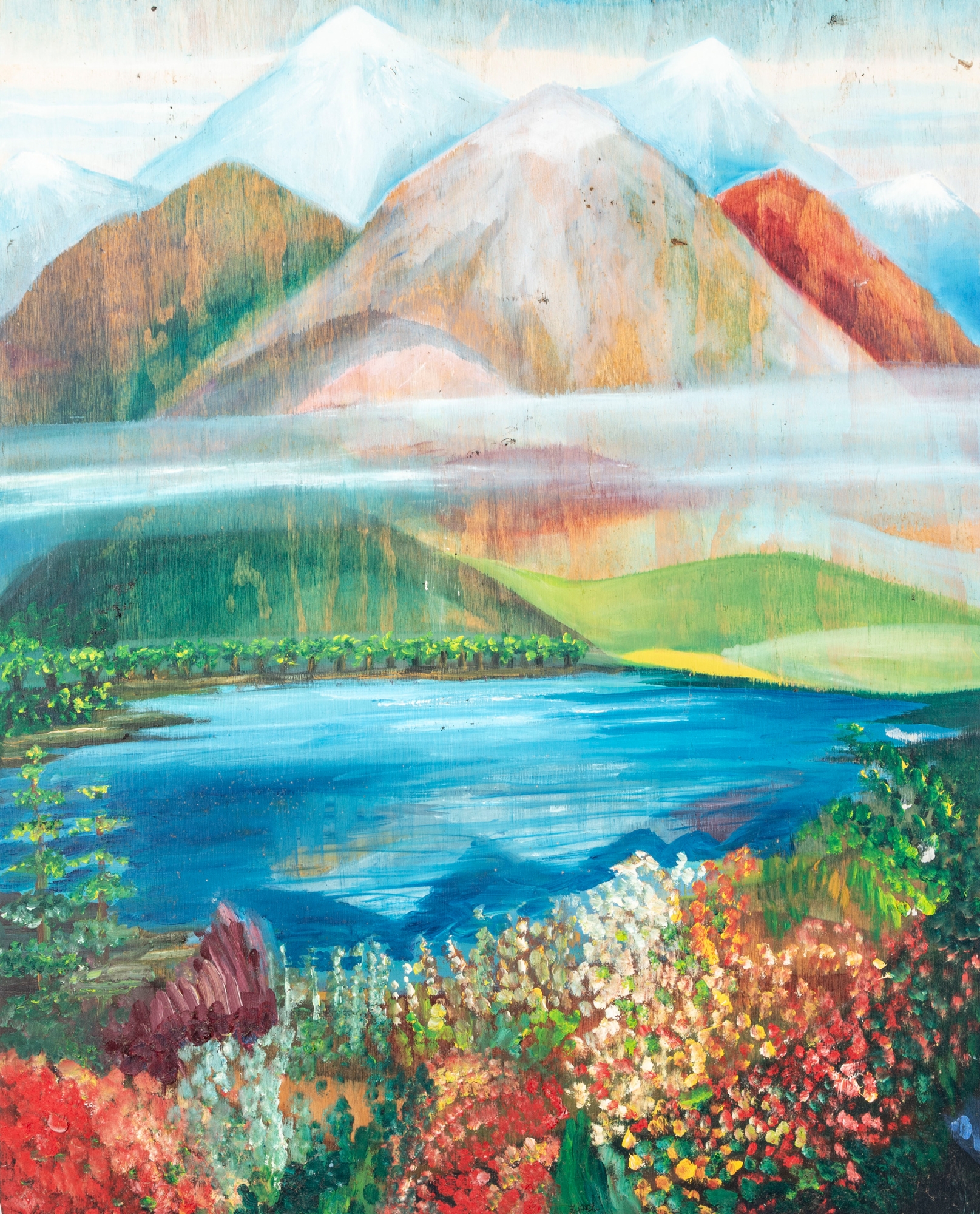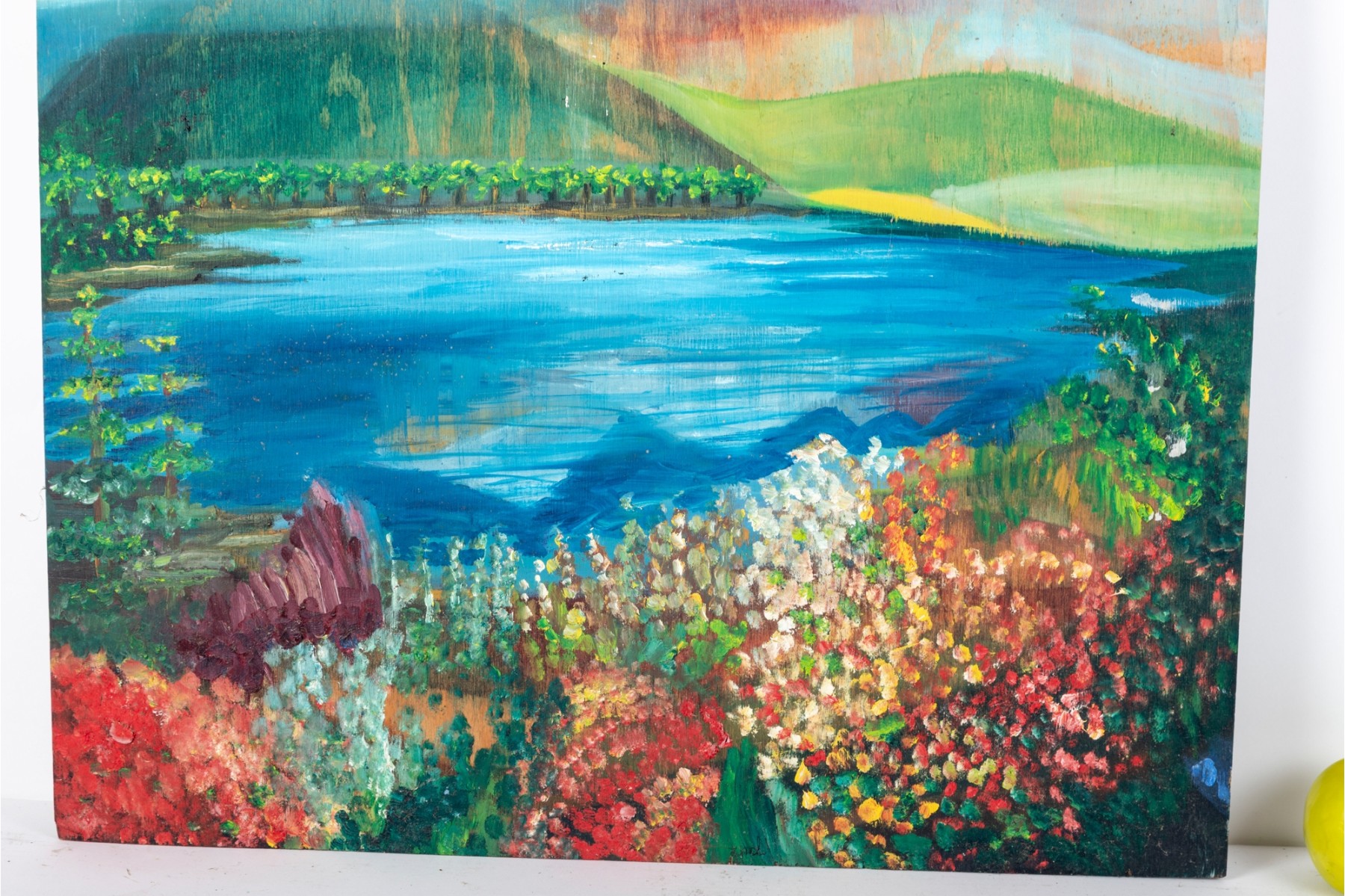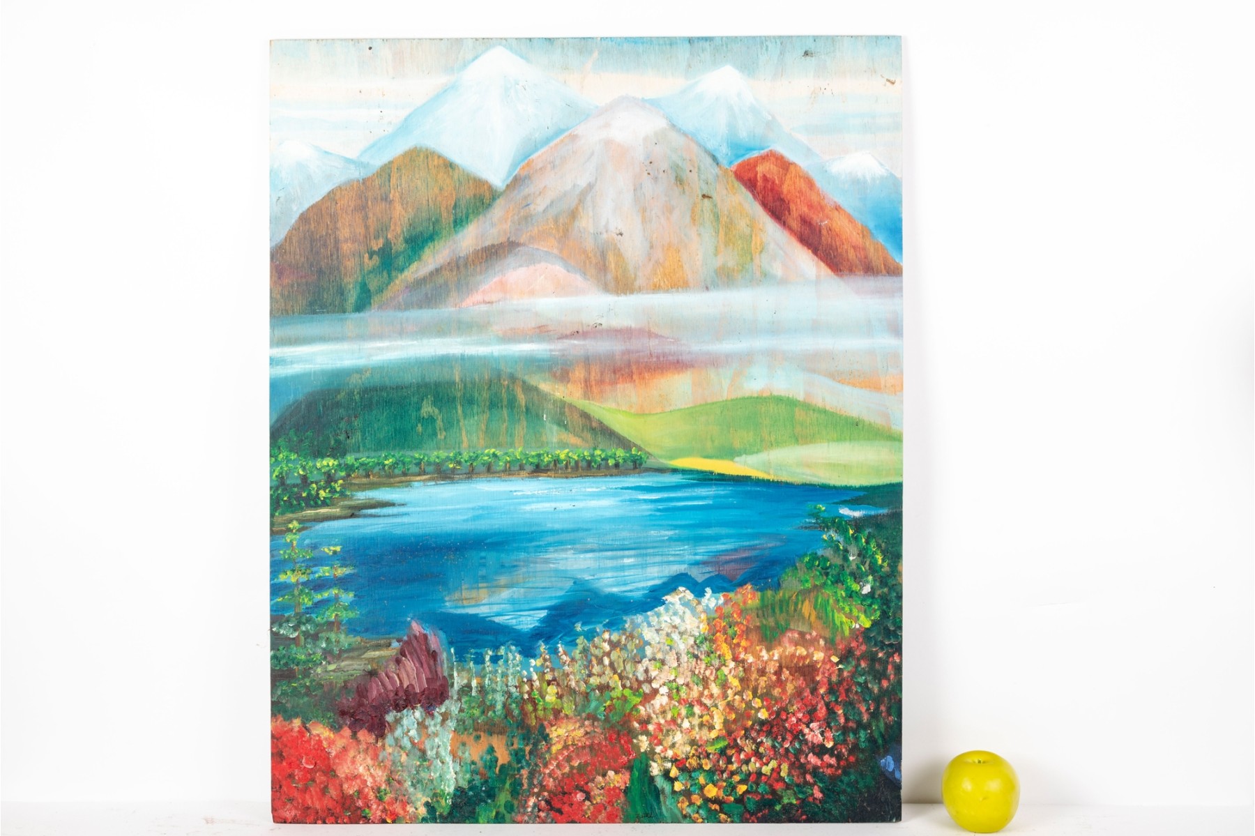 Dan Lynch (American [SC], 1930-2019) oil painting on board depicting a vibrant and refreshing landscape of a deep blue lake surrounded by dappled flowering foliage in the foreground, farm fields in the mid-ground , and towering white, orange, and green mountains in the background fading out into the pale blue sky above. Signed on the verso. Unframed.