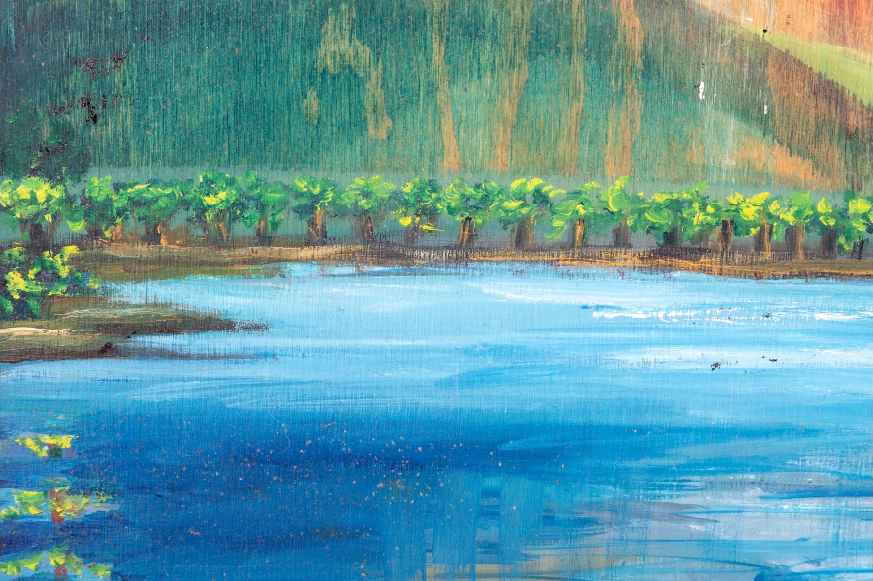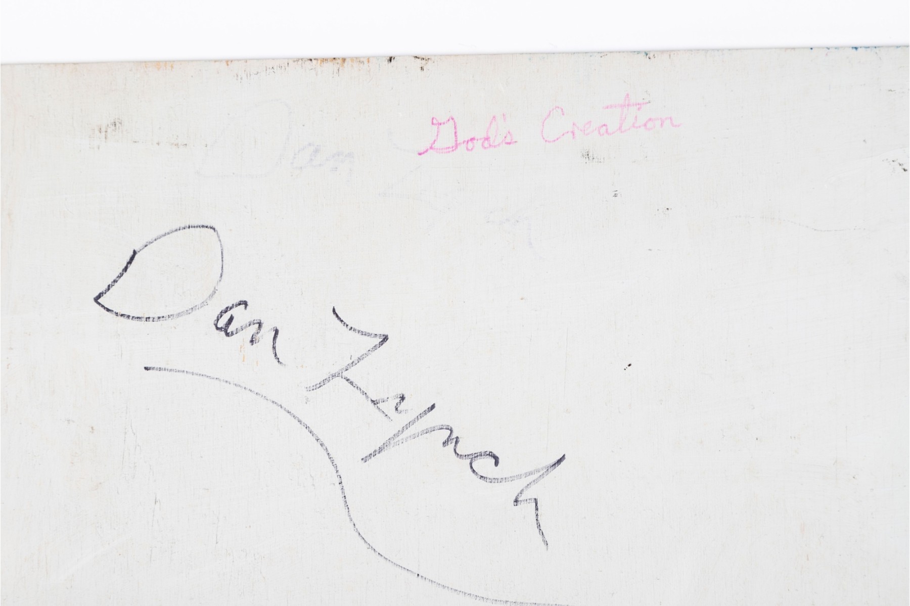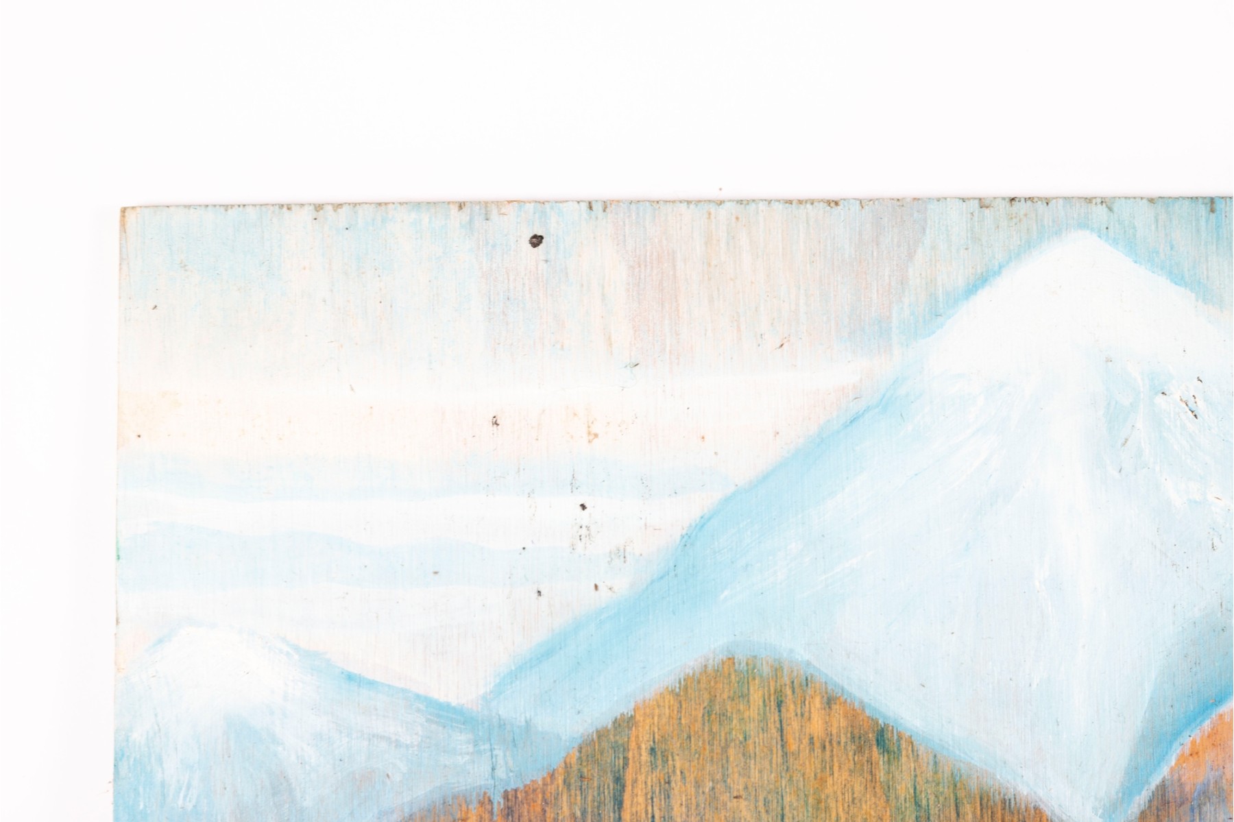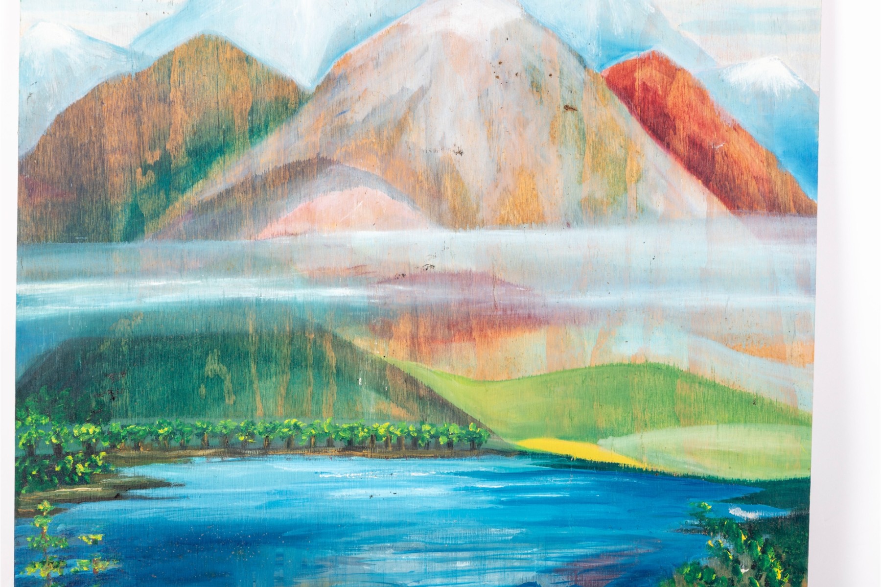 Dan Lynch (American [SC], 1930-2019) oil painting on board depicting a vibrant and refreshing landscape of a deep blue lake surrounded by dappled flowering foliage in the foreground, farm fields in the mid-ground , and towering white, orange, and green mountains in the background fading out into the pale blue sky above. Signed on the verso. Unframed.